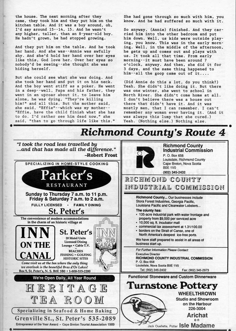 the house. The next morning after they came, they took him and they put him on the kitchen table. And it was a boy around, oh, I'd say around 15--14, 15. And he wasn't any higher, taller, than an 8-year-old boy. He hadn't grown, he had stopped growing. And they put him on the table. And he took her hand. And she was--Annie was awfully shy. And she'd hold her hand over her eyes like this, God love her. Over her eyes so nobody'd be seeing--she thought she was hiding herself. But she could see what she was doing. And she took her hand and put it on his neck. And the boy went stiff as a poker. He went in a deep--well. Papa and his father, they went in an uproar about it, to leave him alone, he was dying, "They're killing him!" and all this. But the mother said, she said, "Effie"--which was my mother-- "Effie, have the child finish what she has to do. I'd rather see him dead now," she said, "than to go through life like this." She had gone through so much with him, you know. And he had suffered so much with it. So anjrway, (Annie) finished. And they car? ried him into the other bedroom and put him down. Well, us kids were outside play? ing, you know. This was in the early morn? ing. Well, in the middle of the afternoon, he gets up and comes out and plays with us. It took all that time. From early morning--it must have been around 7 o'clock, anjrway. And then, she did it for 3 days, and the same thing happened to him--all the goop came out of it.... (Did Annie do this a lot, do you think?) Yeah. She didn't like doing it. But there was one winter, she went to school in North River. She didn't come home at all. I don't believe there was a house out there that didn't have it. And it was mostly men, that I can remember. I can't remember any woman ever having it. (And it was always this lump that she cured.) Yeah. (Nothing else.) Nothing else. Richmond County *s Route 4 "I took the road less travelled by ...and that has made all the difference.** -Robert Frost SPECIALIZING IN HOME-STYLE COOKING Parker's Sunday to Thursday 7 a.m. to 11 p.m. Friday & Saturday 7 a.m. to 2 a.m. FULLY LICENSED • FAMILY DINING St. Peter's The convenience of modem accommodations in the chann of an historic village at INN ON THE CANAL St. Peter's 20 Motel Units Licensed Dining Lounge • Cable T.V. BEACHES FISHING • GOLFING HISTORIC SITES Come visit us at the Inn where the only thing we overlook is the beautiful Bras d'Or Lakes! Box 9, St Peter's, N. S. BOE 3B0 ? 1-800-535-2200 ?? Richmond County Industrial Commission P. O. Box 658 Louisdale, Richrrxjnd County Cape Breton, Nova Scotia BOE 1V0 (902) 345-2432 lEHCIEIMCDNID COUNTY IINIDUSTMHAIL C?MIMIISS]I?N Richmond County... Our businesses include Stora Forest Industries, Georgia Pacific, Louisiana Pacific and Clearwater Lobsters... The county has: • 135-acre industrial park with water frontage and property from $9,500 per serviced acre • 10,000sq. ft. incubator mall • commercial tax assessment at 1.31/100.00 • borders on the Strait of Canso, one of North America's deepest ice-free ports. We have staff prepared to assist in all areas of business start up. For Further Information Please Contact: Executive Director RICHMOND COUNTY INDUSTRIAL COMMISSION P. O. Box 658 Louisdale, Nova Scotia BOE 1 VO Tel: (902) 345-2432 Fax: (902) 345-2973 We're Open Daily, Ail Year Round HIEITAG flA E??C ( Specializing in Seafood & Home Baking ) Grenville St., St. Peter's 535-2089 Entrepreneur of the Year Award • Cape Breton Tourist Association 1989 Functional Stoneware and Custom Dinnerware Turnstone Pottery WHEELTHROWN Studio and Showroom on the Harbour 226-3004 Arichat Jack Ouellette, Potter Isle Madame