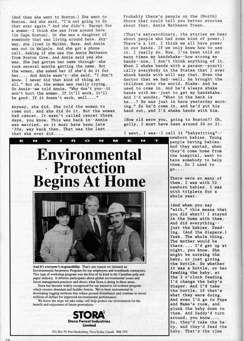 (And then she went to Boston.) She went to Boston. And she said, "I'm not going to do that ever again." And she didn't. Except for a woman--I think she was from around here (in Cape Breton). Or she was a daughter of somebody that was living around here. Any? way, she lived in Maiden, Mass. And Annie was out in Walpole. And she got a phone call. Asking if she was the Annie Matheson from Breton Cove. And Annie said yes she was. She had gotten her name through--she took several months getting the name. But the woman, she asked her if she'd do it for her.... And Annie wasn't--she said, "I don't know. I never did that kind of thing at all." But oh, the woman was really crying. So Annie--we told Annie, "Why don't you--it won't hurt the woman. If it'll work, it'll be good. If it doesn't work, well...." Anyway, she did. She told the woman to come out. And she did do it. But the woman had cancer. It wasn't called cancer those days, you know. This was back in--Annie was married, so it must have been late '30s, way back then. That was the last that she ever did.... Probably there's people on the (North) Shore that could tell you better stories about that. Annie Matheson Treen. (That's extraordinary, the stories we hear about people who had some kind of power.) There's a lot. I think we all have power in our hands. If we only knew how to use it. I really do. Now, I've been told so many times my handshake--how strong my hands--now, I don't think anything of it. When I shake hands with a person--practi? cally everybody in the States that I ever shook hands with will say that. Even the doctor that we had--well, he brought the children into the world. Blake. And he used to come in. And he'd always shake hands with me--just to get my handshake. And I'd wonder, "What in the heck is he...? He was just in here yesterday morn? ing." So he'd come in, and he'd put his hand out, and I'd shake hands with him. (How old were you, going to Boston?) Oh, golly. I must have been around 20 or 21. I went, I was- Environmental Protection Begins At Home And it's everyone's responsibility. That's one reason we initiated an Environmental Awareness Program for our employees and woodlands contractors. This type of workshop program was the first of its kind in the Canadian pulp and paper industry. It informs participants about global environmental issues and forest management practices and shows what Stora is doing in these areas. Stora has become widely recognized for our intensive silviculture program which ensures abundant and healthy forests. We've been instrumental in developing logging methods that reduce ground disturbance and continue to invest millions of dollars for improved environmental performance. We know the steps we take today will help protect our environment for the benefit and enjoyment of future generations. STORA' Stora Forest Industries Limited P.O. Box 59, Port Hawkesbury, Nova Scotia, Canada BOE 2V0 call it "babysitting"-- 'newborn babies. Young J people having babies. And they wanted, when they'd come home from the hospital, want to have somebody to help them. So I used to go There were so many of them. I was with 52 newborn babies. I was with triplets for a whole year. (And when you say "with," this means that you did what?) I stayed in the home with them. And did everything-- just the babies. Feed? ing. (And the diapers.) Yeah. The whole thing. The mother would be there.... I'd get up at night, you know. She might be nursing the baby, or just giving the bottle. So whether it was a bottle, or her feeding the baby, at the 2 o'clock feeding I'd change the baby's diaper. And I'd take the bottle, if that's what they were doing. And even I'd go to Papa and Mama's room, and plunk the baby down to them. And Daddy'd turn around, you know.... So, they'd take the ba? by, and they'd feed the baby. That's the time