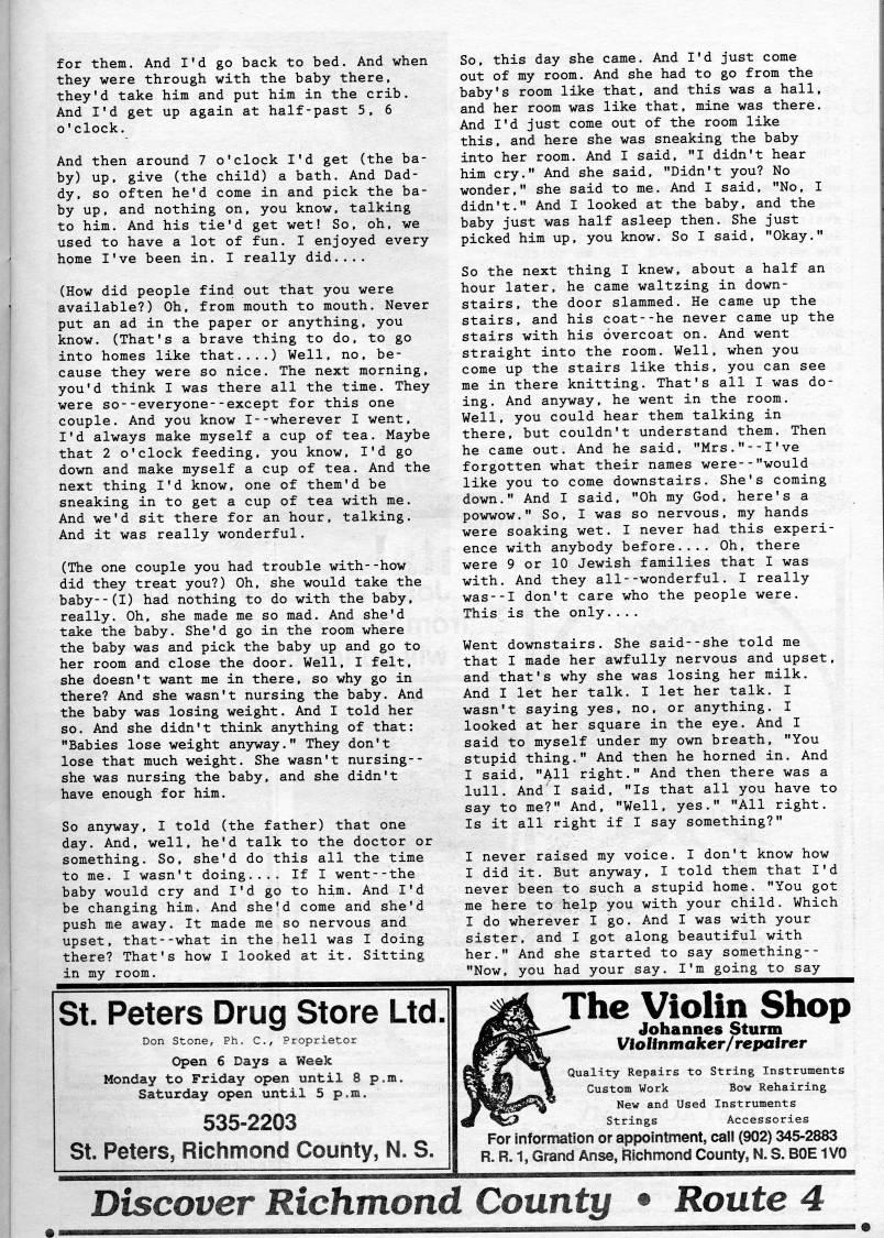 for them. And I'd go back to bed. And when they were through with the baby there, they'd take him and put him in the crib. And I'd get up again at half-past 5, 6 o'clock. And then around 7 o'clock I'd get (the ba? by) up, give (the child) a bath. And Dad? dy, so often he'd come in and pick the ba? by up, and nothing on, you know, talking to him. And his tie'd get wet! So, oh, we used to have a lot of fun. I enjoyed every home I've been in. I really did.... (How did people find out that you were available?) Oh, from mouth to mouth. Never put an ad in the paper or anything, you know. (That's a brave thing to do, to go into homes like that....) Well, no, be? cause they were so nice. The next morning, you'd think I was there all the time. They were so--everyone--except for this one couple. And you know I--wherever I went, I'd always make myself a cup of tea. Maybe that 2 o'clock feeding, you know, I'd go down and make myself a cup of tea. And the next thing I'd know, one of them'd be sneaking in to get a cup of tea with me. And we'd sit there for an hour, talking. And it was really wonderful. (The one couple you had trouble with--how did they treat you?) Oh, she would take the baby--(I) had nothing to do with the baby, really. Oh, she made me so mad. And she'd take the baby. She'd go in the room where the baby was and pick the baby up and go to her room and close the door. Well, I felt, she doesn't want me in there, so why go in there? And she wasn't nursing the baby. And the baby was losing weight. And I told her so. And she didn't think anything of that: "Babies lose weight anjrway." They don't lose that much weight. She wasn't nursing-- she was nursing the baby, and she didn't have enough for him. So anyway, I told (the father) that one day. And, well, he'd talk to the doctor or something. So, she'd do this all the time to me. I wasn't doing.... If I went--the baby would cry and I'd go to him. And I'd be changing him. And she'd come and she'd push me away. It made me so nervous and upset, that--what in the hell was I doing there? That's how I looked at it. Sitting in my room. So, this day she came. And I'd just come out of my room. And she had to go from the baby's room like that, and this was a hall, and her room was like that, mine was there. And I'd just come out of the room like this, and here she was sneaking the baby into her room. And I said, "I didn't hear him cry." And she said, "Didn't you? No wonder," she said to me. And I said, "No, I didn't." And I looked at the baby, and the baby just was half asleep then. She just picked him up, you know. So I said, "Okay." So the next thing I knew, about a half an hour later, he came waltzing in down? stairs, the door slammed. He came up the stairs, and his coat--he never came up the stairs with his overcoat on. And went straight into the room. Well, when you come up the stairs like this, you can see me in there knitting. That's all I was do? ing. And anyway, he went in the room. Well, you could hear them talking in there, but couldn't understand them. Then he came out. And he said, "Mrs."--I've forgotten what their names were--"would like you to come downstairs. She's coming down." And I said, "Oh my God, here's a powwow." So, I was so nervous, my hands were soaking wet. I never had this experi? ence with anybody before.... Oh, there were 9 or 10 Jewish families that I was with. And they all--wonderful. I really was--I don't care who the people were. This is the only.... Went downstairs. She said--she told me that I made her awfully nervous and upset, and that's why she was losing her milk. And I let her talk. I let her talk. I wasn't saying yes, no, or anything. I looked at her square in the eye. And I said to myself under my own breath, "You stupid thing." And then he horned in. And I said, "All right." And then there was a lull. And I said, "Is that all you have to say to me?" And, "Well, yes." "All right. Is it all right if I say something?" I never raised my voice. I don't know how I did it. But anyway, I told them that I'd never been to such a stupid home. "You got me here to help you with your child. Which I do wherever I go. And I was with your sister, and I got along beautiful with her." And she started to say something-- "Now, you had your say. I'm going to say St. Peters Drug Store Ltd, Don Stone, Ph. C, Proprietor Open 6 Days a Week Monday to Friday open until 8 p.m. Saturday open until 5 p.m. 535-2203 St. Peters, Richmond County, N. S. The Violin Shop ' Johannes Sturm Violinmaker/repairer Quality Repairs to String Instruments Custom Work Bow Rehairing New and Used Instruments Strings Accessories For information or appointment, call (902) 345-2883 R. R. 1, Grand Anse, Richmond County, N. S. BOE 1V0 Discover Richmond County • Route 4