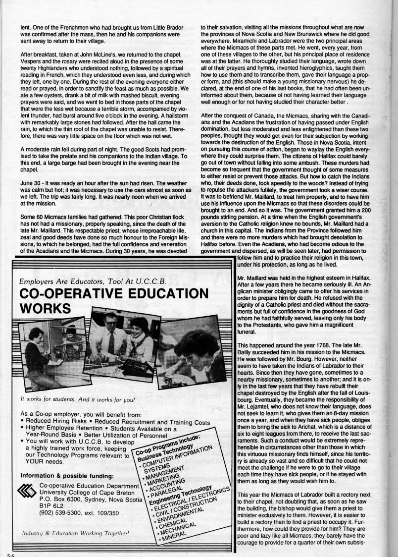 Published by Ronald Caplan on 1991/1/1 (371 reads)lent. One of the Frenchmen who had brought us from Little Brador was confirmed after the mass, then he and his companions were sent away to return to their village. After breakfast, taken at John McLine's, we retumed to the chapel. Vespers and the rosary were recited aloud in the presence of some twenty Highlanders who understood nothing, followed by a spiritual reading in French, which they understood even less, and during which they left, one by one. During the rest of the evening everyone either read or prayed, in order to sanctify the feast as much as possible. We ate a few oysters, drank a bit of milk with mashed biscuit, evening prayers were said, and we went to bed in those parts of the chapel that were the less wet because a terrible storm, accompanied by vio? lent thunder, had burst around five o'clock in the evening. A hailstomn with remarkably large stones had followed. After the hail came the rain, to which the thin roof of the chapel was unable to resist. There? fore, there was very little space on the f toor which was not wet. A moderate rain fell during part of night. The good Scots had prom? ised to take the prelate and his companions to the Indian village. To this end, a large barge had been brought in the evening near the chapel. June 30 - it was ready an hour after the sun had risen. The weather was calm but hot; it was necessary to use the oars almost as soon as we left. The trip was fairly long. It was neariy noon when we arrived at the missfon. Some 60 Mfcmacs families had gathered. This poor Christian flock has not had a missionary, properiy speaking, since the death of the late Mr. Maillard. This respectable priest, whose irreproachable life, zeal and good deeds have done so much honour to the Foreign Mis? sions, to which he belonged, had the full confidence and veneratton of the Acadians and the Mtemacs. During 30 years, he was devoted to their salvation, visiting all the missions throughout what are now the provinces of Nova Scotia and New Bmnswick where he did good everywhere. Miramichi and Labrador were the two principal areas where the Micmacs of these parts met. He went, every year, from one of these villages to the other, but his principal place of residence was at the latter. He thoroughly studied their language, wrote down all of their prayers and hymns, invented hieroglyphics, taught them how to use them and to transcribe them, gave their language a prop? er form, and (this should make a young missionary nen/ous) he de? clared, at the end of one of his last books, that he had often been un? informed about them, because of not having learned their language well enough or for not having studied their character better. After the conquest of Canada, the Micmacs, sharing with the Canadi? ans and the Acadians the frustration of having passed under English domination, but less moderated and less enlightened than these two peoples, thought they would get even for their subjection by working towards the destmction of the English. Those in Nova Scotia, intent on pursuing this course of action, began to waylay the English every? where they coukl surprise them. The citizens of Halifax could barely go out of town without falling into some ambush. These murders had become so frequent that the government thought of some measures to either resist or prevent those attacks. But how to catch the Indians who, their deeds done, took speedily to the woods? Instead of trying to repulse the attackers futilely, the government took a wiser course. It was to befriend Mr. Maillard, to treat him properiy, and to have him use his influence upon the Mfcmacs so that these disorders could be brought to an end. And so it was. The government granted him a 200 pounds stiriing pension. At a time when the English government's averston to the Catholfc religion knew no bounds, Mr. Maillard had a church in this capital. The Indians from the Province followed him and there were no more nrHjrders whtoh had brought desolation to Halifax before. Even the Acadians, who had become odtous to the government and dispersed, as will be seen later, had pemiission to foltow him and to practice their religion in this town, under his protection, as long as he lived. Emplo;ers Are Educators, Too! At U.C.C.B. CO-OPERATIVE EDUCATION WORKS It works for studerts. Ard it works for ;ou! As a Co-op employer, you will benefit from: • Reduced Hiring Risks • Reduced Recruitment and Training Costs • Higher Employee Retention • Students Available on a Year-Round Basis • Better Utilization of Personnel • You will work with U.C.C.B. to develop a highly trained work force, keeping t<;'p''?'*'V<'o'?'l''-V' our Technology Programs relevant to T'cW'sS *rX ??4fOv'' YOUR needs. '' I?? A-vo' cb'r; Information & possible funding: Co-operative Education Department University College of Cape Breton P.O. Box 6300, Sydney, Nova Scotia BIP 6L2 (902) 539-5300, ext. 109/350 Industry & Education Working Together! ??'f%'f ln'l Mr. Maillard was hekl in the highest esteem in Halifax. After a few years there he became seriously ill. An An? glican minister obligingly came to offer his sen/fces in order to prepare him for death. He refused with the dignity of a Catholk; priest and died without the sacra? ments but full of confidence in the goodness of God whom he had faithfully sen/ed, leaving only his body to the Protestants, who gave him a magnif rcent funeral. This happened around the year 1768. The late Mr. Bailly succeeded him in his mission to the Mrcmacs. He was followed by Mr. Bourg. However, neither seem to have taken the Indians of Labrador to their hearts. Since then they have gone, sometimes to a neartjy missionary, sometimes to another; and it is on? ly in the last few years that they have rebuilt their chapel destroyed by the English after the fall of Louis? bourg. Eventually, they became the responsibility of Mr. Lejamtel, who does not know their language, does not seek