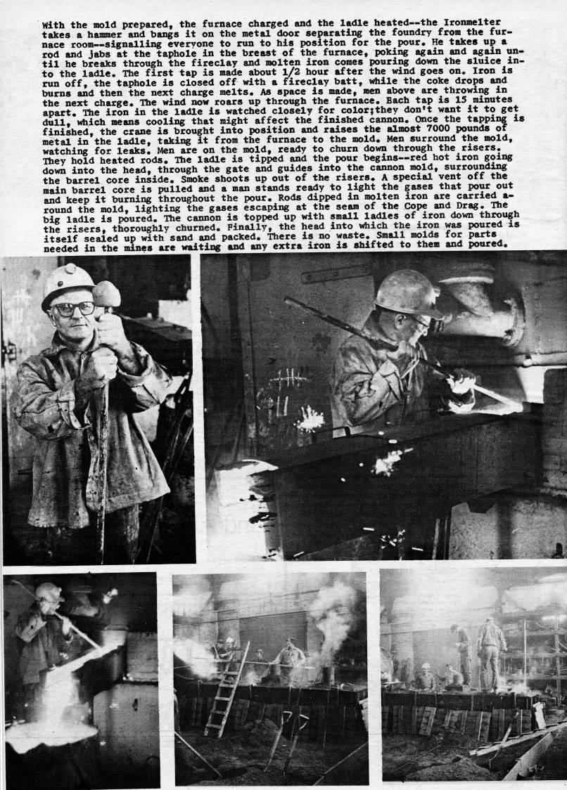 Published by Ronald Caplan on 1975/12/1 (291 reads)with the mold prepared, the furnace charged and the ladle heated • the Ironraelter takes a hammer and bangs it on the metal door separating the foundry from the fur? nace room • signalling everyone to run to his position for the pour. He takes up a rod and jabs at the taphole in the breast of the furnace, poking again and again un? til he breaks through the fireclay and molten iron comes pouring down the sluice in? to the ladle. The first tap is made about 1/2 hour after the wind goes on. Iron is run off, the taphole is closed off with a fireclay batt, while the coke drops and burns and then the next charge melts. As space is made, men above are throwing in the next charge. The wind now roars up through the furnace. Each tap is 15 minutes apart. The iron in the ladle is watched closely for color|they don't want it to get dull, which means cooling that might affect the finished cannon* Once the tapping is finished, the crane is brought into position and raises the almost 7000 pounds of metal in the ladle, taking it from the furnace to the mold. Men surround the mold, watching for leaks. Men are on the mold, ready to churn down through the risers* They hold heated rods. The ladle is tipped and the pour begins • red hot iron going down into the head, through the gate and guides into the cannon mold, surrounding the barrel core inside. Smoke shoots up out of the risers. A special vent off the main barrel core is pulled and a man stands ready to light the gases that pour out and keep it burning throughout the pour. Rods dipped in molten iron are carried a- round the mold, lighting the gases escaping at the seara of the Cope and Drag* The big ladle is poured* The cannon is topped up with small ladles of iron down through the risers, thoroughly churned. Finally, the head into which the iron was poured is itself sealed up with sand and packed. There is no waste. Small molds for parts needed in the mines are waiting and any extra iron is shifted to thera and poured.