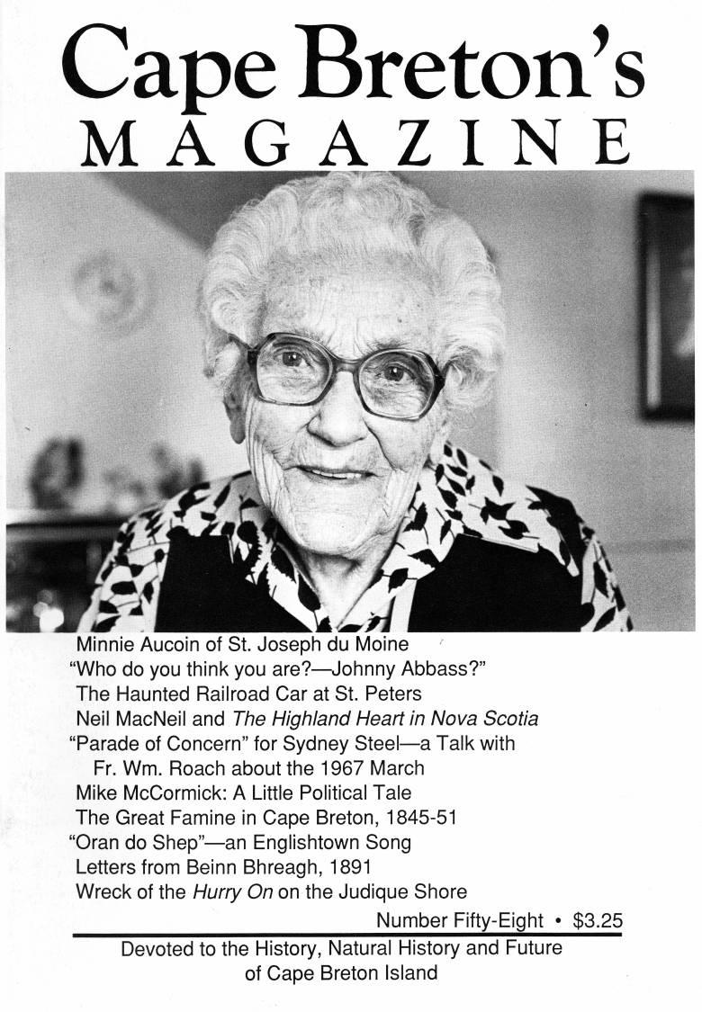 • Minnie Aucoin of St. Joseph du Moine • "Who do You Think You Are? Johnny Abbass"? • The Haunted Railroad Car at St. Peters • Neil MacNeil and The Highland Heart • "Parade of Concern" for Sydney Steel • Mike McCormick: A Little Political Tale • The Great Famine in Cape Breton, 1845-51 • "Oran do Shep" an Englishtown Song • Mary E. Blatchford's Letters from Beinn Bhreagh, 1891 • Wreck of the Hurry On - Judique