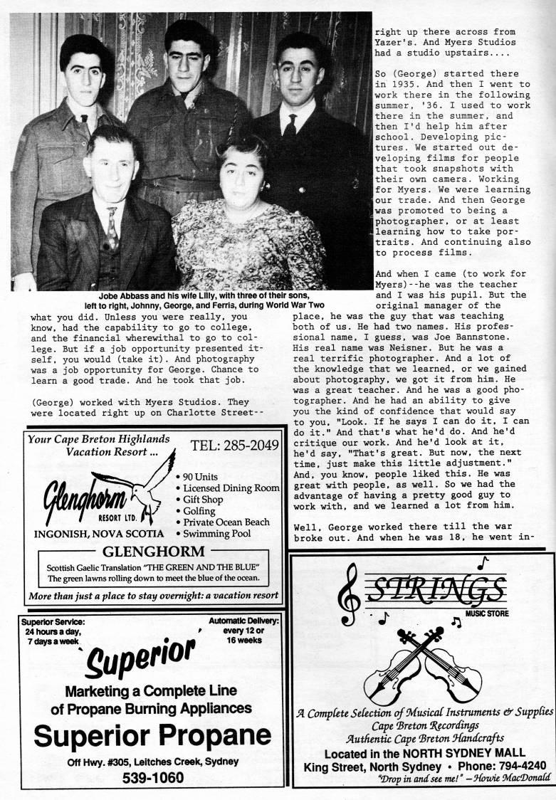 Jobe Abbass and his wife Lilly, with three of their sons, left to right, Johnny, George, and Ferris, during World War Two what you did. Unless you were really, you know, had the capability to go to college, and the financial wherewithal to go to col? lege. But if a job opportunity presented it? self, you would (take it). And photography was a job opportunity for George. Chance to learn a good trade. And he took that job. (George) worked with Myers Studios. They were located right up on Charlotte Street-- Your Cape Breton Highlands Vacation Resort. TEL: 285-2049 .-'55';'_/ r -90 Units /?A ' 'L At/ZnT' • Licensed Dining Room immm''h :?"shop i / / ?i$0?IlTO./' .Private Ocean Beach INGONISH, NOVA SCOTIA • Swimming Pool GLENGHORM Scottish Gaelic Translation "THE GREEN AND THE BLUE" The green lawns rolling down to meet the blue of the ocean. More than just a place to stay overnight: a vacation resort Superior Service: 24 hours a day, 7 days a week Automatic Delivery: every 12 or Marketing a Complete Line of Propane Burning Appliances Superior Propane Off Hwy. #305, Ultches Creek, Sydney 539-1060 right up there across from Yazer's. And Myers Studios had a studio upstairs.... So (George) started there in 1935. And then I went to work there in the following summer, '36. I used to work there in the summer, and then I'd help him after school. Developing pic? tures. We started out de? veloping films for people that took snapshots with their own camera. Working for Myers. We were learning our trade. And then George was promoted to being a photographer, or at least learning how to take por? traits. And continuing also to process films. And when I came (to work for Myers)--he was the teacher and I was his pupil. But the original manager of the place, he was the guy that was teaching both of us. He had two names. His profes? sional name, I guess, was Joe Bannstone. His real name was Neisner. But he was a real terrific photographer. And a lot of the knowledge that we learned, or we gained about photography, we got it from him. He was a great teacher. And he was a good pho? tographer. And he had an ability to give you the kind of confidence that would say to you, "Look. If he says I can do it, I can do it." And that's what he'd do. And he'd critique our work. And he'd look at it, he'd say, "That's great. But now, the next time, just make this little adjustment." And, you know, people liked this. He was great with people, as well. So we had the advantage of having a pretty good guy to work with, and we learned a lot from him. Well, George worked there till the war broke out. And when he was 18, he went in- IsTKl'Mj'S Si Compute SefecHxm af9'tisica[ Instruments & Suppties Cape 'Breton Recordings Siutkentic Cape Breton '{andcrafts Located in the NORTH SYDNEY MALL King Street, North Sydney • Phone: 794-4240 "Throp in and see me!" -'Hoivie. jMacOonaCd