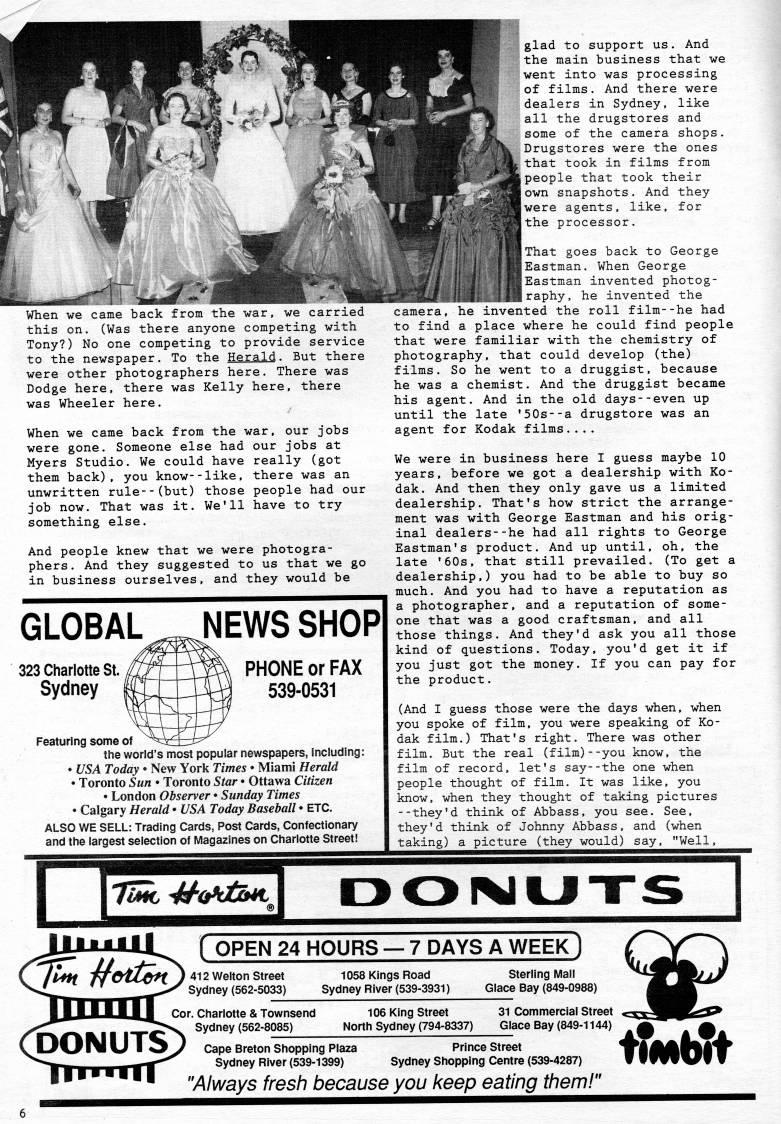 When we came back from the war. we carried this on. (Was there anyone competing with Tony?) No one competing to provide service to the newspaper. To the Herald. But there were other photographers here. There was Dodge here, there was Kelly here, there was Wheeler here. When we came back from the war, our jobs were gone. Someone else had our jobs at Myers Studio. We could have really (got them back), you know--like, there was an unwritten rule--(but) those people had our job now. That was it. We'll have to try something else. And people knew that we were photogra? phers. And they suggested to us that we go in business ourselves, and they would be GLOBAL _NEWS SHOP 323CharloneSt. Sydney PHONE or FAX 539-0531 Featuring some of the world's most popular newspapers, Including: • USA Today • New York Times • Miami Herald • Toronto Sun • Toronto Star • Ottawa Citizen • London Observer • Sunday Times • Calgary Herald • USA Today Baseball * ETC. ALSO WE SELL: Trading Cards, Post Cards, Confectionary and the largest selection of Magazines on Charlotte Street! glad to support us. And the main business that we went into was processing of films. And there were dealers in Sydney, like all the drugstores and some of the camera shops. Drugstores were the ones that took in films from people that took their own snapshots. And they were agents, like, for the processor. That goes back to George Eastman. When George Eastman invented photog? raphy, he invented the camera, he invented the roll film--he had to find a place where he could find people that were familiar with the chemistry of photography, that could develop (the) films. So he went to a druggist, because he was a chemist. And the druggist became his agent. And in the old days--even up until the late '50s--a drugstore was an agent for Kodak films.... We were in business here I guess maybe 10 years, before we got a dealership with Ko? dak. And then they only gave us a limited dealership. That's how strict the arrange? ment was with George Eastman and his orig? inal dealers--he had all rights to George Eastman's product. And up until, oh. the late '60s. that still prevailed. (To get a dealership.) you had to be able to buy so much. And you had to have a reputation as a photographer, and a reputation of some? one that was a good craftsman, and all those things. And they'd ask you all those kind of questions. Today, you'd get it if you just got the money. If you can pay for the product. (And I guess those were the days when, when you spoke of film, you were speaking of Ko? dak film.) That's right. There was other film. But the real (film)--you know, the film of record, let's say--the one when people thought of film. It was like, you know, when they thought of taking pictures --they'd think of Abbass, you see. See, they'd think of Johnny Abbass, and (when taking) a picture (they would) say, "Well, fOPEN 24 HOURS • 7 DAYS A WEEK ) r/&tZ;'H J 412 Welton Street ' ' -' Sydney (562-5033) 1058 Kings Road Sydney River (539-3931) Sterling Mail Glace Bay (849-0988) Cor. Chariotte & Townsend Sydney (562-8085) 106 King Street North Sydney (794-8337) 31 Commercial Street Glace Bay (849-1144) Cape Breton Shopping Plaza Sydney River (539-1399) Prince Street Sydney Shopping Centre (539-4287) 1Tm()' "Always fresh because you keep eating them!"