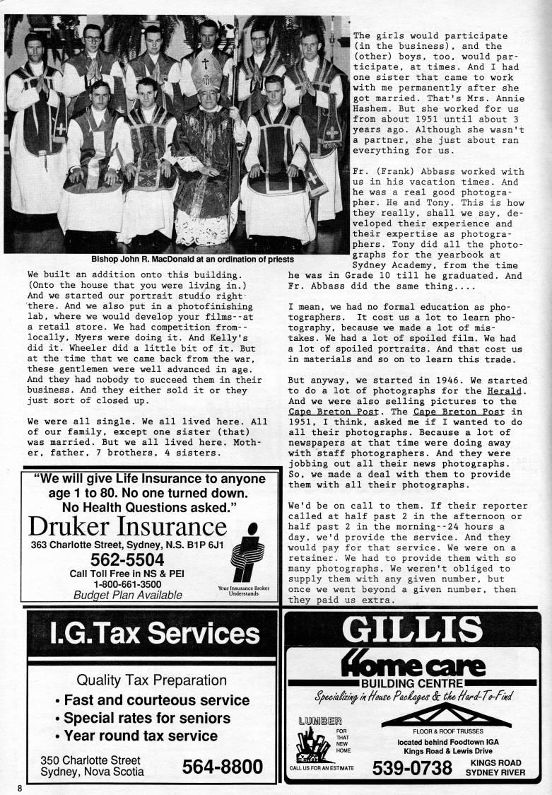 Bishop John R. MacDonald at an ordination of priests We built an addition onto this building. (Onto the house that you were living in.) And we started our portrait studio right- there. And we also put in a photofinishing lab, where we would develop your films--at a retail store. We had competition from-- locally, Myers were doing it. And Kelly's did it. Wheeler did a little bit of it. But at the time that we came back from the war, these gentlemen were well advanced in age. And they had nobody to succeed them in their business. And they either sold it or they just sort of closed up. We were all single. We all lived here. All of our family, except one sister (that) was married. But we all lived here. Moth? er, father, 7 brothers, 4 sisters. The girls would participate (in the business), and the (other) boys, too, would par? ticipate, at times. And I had one sister that came to work with me permanently after she got married. That's Mrs. Annie Hashem. But she worked for us from about 1951 until about 3 years ago. Although she wasn't a partner, she just about ran everything for us. Fr. (Frank) Abbass worked with us in his vacation times. And he was a real good photogra? pher. He and Tony. This is how they really, shall we say, de? veloped their experience and their expertise as photogra? phers. Tony did all the photo? graphs for the yearbook at Sydney Academy, from the time Grade 10 till he graduated. And "We will give Life Insurance to anyone age 1 to 80. No one turned down. No Health Questions asked." Druker Insurance 363 Charlotte Street, Sydney, N.S. B1P 6J1 562-5504 Call Toll Free In NS & PEI 1-800-661-3500 '00, Budget Plan Available he was in Fr. Abbass did the same thing. I mean, we had no formal education as pho? tographers. It cost us a lot to learn pho? tography, because we made a lot of mis? takes. We had a lot of spoiled film. We had a lot of spoiled portraits. And that cost us in materials and so on to learn this trade. But anyway, we started in 1946. We started to do a lot of photographs for the Herald. And we were also selling pictures to the Cape Breton Post. The Cape Breton Post in 1951, I think, asked me if I wanted to do all their photographs. Because a lot of newspapers at that time were doing away with staff photographers. And they were jobbing out all their news photographs. So, we made a deal with them to provide them with all their photographs. We'd be on call to them. If their reporter called at half past 2 in the afternoon or half past 2 in the morning--24 hours a day, we'd provide the service. And they would pay for that service. We were on a retainer. We had to provide them with so many photographs. We weren't obliged to supply them with any given number, but once we went beyond a given number, then they paid us extra. I.G.Tax Services Quality Tax Preparation • Fast and courteous service • Special rates for seniors • Year round tax service 350 Charlotte Street Sydney, Nova Scotia 564-8800 GILLIS 'Kmiecare I BUILDING CENTREl Sji>ec/a'z//(' in House, Pacia'es Sc tU na/'d-To-rmd mrnwrn. THAT NEW HOME CALL US FOR AN ESTIMATE FLOOR & ROOF TRUSSES located behind Foodtown IGA Kings Road & Lewis Drive f'QO HTOQ KINGS ROAD OOi7"U/00 SYDNEY RIVER
