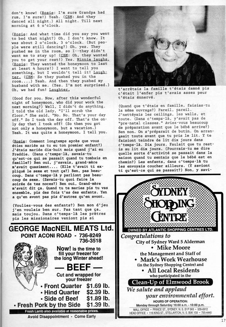 Published by Ronald Caplan on 1991/8/1 (308 reads)don't know! (Rosie: I'm sure Grandpa had rum, I'm sure!) Yeah. (CBM: And they danced all night.) All night. Till next morning at 6 o'clock. (Rosie: And what time did you say you went to bed that night?) Oh, I don't know. It was about 2 o'clock, 3 o'clock. (But peo? ple were still dancing?) Oh, yes. They pushed me in the room, so I--they didn't want me to stay up! (CBM: Oh, they wanted you to get your rest!) Yes. Minnie laughs. (Rosie: They wanted the honeymoon to last at least 4 hours!) I want to tell you something, but I wouldn't tell it! Laugh? ter. (CBM: So they pushed you in the room....) Yeah. And then they pushed my husband with me. (Yes. I'm not surprised.) Oh, we had fun! Laughter. (Good for you. Now, after this wonderful night of honeymoon, who did your work the next morning?) Well, I didn't do anything. I told the old lady, "I'll scrub the floor." She said, "No. No. That's your day off." So I took the day off. That's the on? ly day that I took off! (So then you got not only a honeymoon, but a vacation.) Yeah. It was quite a honeymoon, I tell you. (Rosie: Comment longtemps apr's que vous 6tiez marine as tu eu ton premier enfant?) J''tais marine dix-huit mois quand j'ai eu Freddie. (Dans c'temps-li, savais-tu qu'est-ce qui se passait quand tu tombais en famille?) Ben oui, j'savais, grand-mfere m'avait quasiment.... (Elle t'avait ti ex- pliqu6 le sexe et tout ga?) Ben, pas beau- coup. Dans c'temps-li y parliont pas beau- coup de sexe. (Savais-tu quoi faire la soir6e de tes noces?) Ben oui, Grand-m6re m'avait dit ga. Quand tu te maries pis tu vas ensemble, pis des fois t'as des enfants. Yen a qu'en avont pas pis d'autres qu'en avont. (Vouliez-vous des enfants?) Ben mon d'jeu j'en voulais ben sur. Pas tant que qa. mais toujou. Dans c'temps-li les prfetres pis les missionaires veniont pis si GEORGE MacNEIL MEATS Ltd. POINT ACONI ROAD - 736-8249 736-3518 Now! is the time to fill your freezer for the long Winter ahead! • BEEF • Cut and wrapped for your freezer Front Quarter $1.69 lb. Hind Quarter $2.39 lb. • Side of Beef $1.89 lb. Fresh Pork by the Side $1.39 lb. Fresh Lamb also available at reasonable prices. Avoid Disappointment - Come Early t'arretais la famille t''tais damn' pis c''tait I'enfer pis t'avals assez peur t''tais 'nnervd. (Quand que t''tais en famille, faisias-tu la meme ouvrage?) Pareil, pareil. J'nett'yais les ceilings, les walls, et toute. (Dans c'temps-li, y'avait pas de "pre-natal classes." Aviez-vous beaucoup de preparation avant que le beb6 arrive?) Ben non. On s'preparait de butin. On arran- geait toute avant que tu pris le lit. Y te faisiont teindre de lit dix jours dans c'temps-li. Dix jours. Faulait que tu rest- is au lit dix jours. (Pourrais-tu me dire quelle sorte d'activity se passait dans la maison quand tu sentais que le b6b6 est en chemin?) Les enfants, dans c'temps-li tu les envoyais coucher ailleurs. (Y saviont ti qu'est-ce qui se passait?) Non, y savi- OWNED BY ATLANTIC SHOPPING CENTRES LTD. Congratulations to City of Sydney Ward 5 Alderman • Mike Moore the Management and Staff of • Mark's Work Wearhouse (in the Sydney Shopping Centre) and • All Local Residents who participated in the Clean-Up of Elmwood Brook We salute and applaud your environmental effort. HOURS OF OPERATION: Monday through Saturday 10:00 a.m. -10:00 p.m. MALL OFFICE • PRINCE ST., SYDNEY, N. S. B1P5K6 • 539-6912 HEAD OFFICE • 115KINGST.,STELLARTON,N.S.B0K1S0 • 755-4440