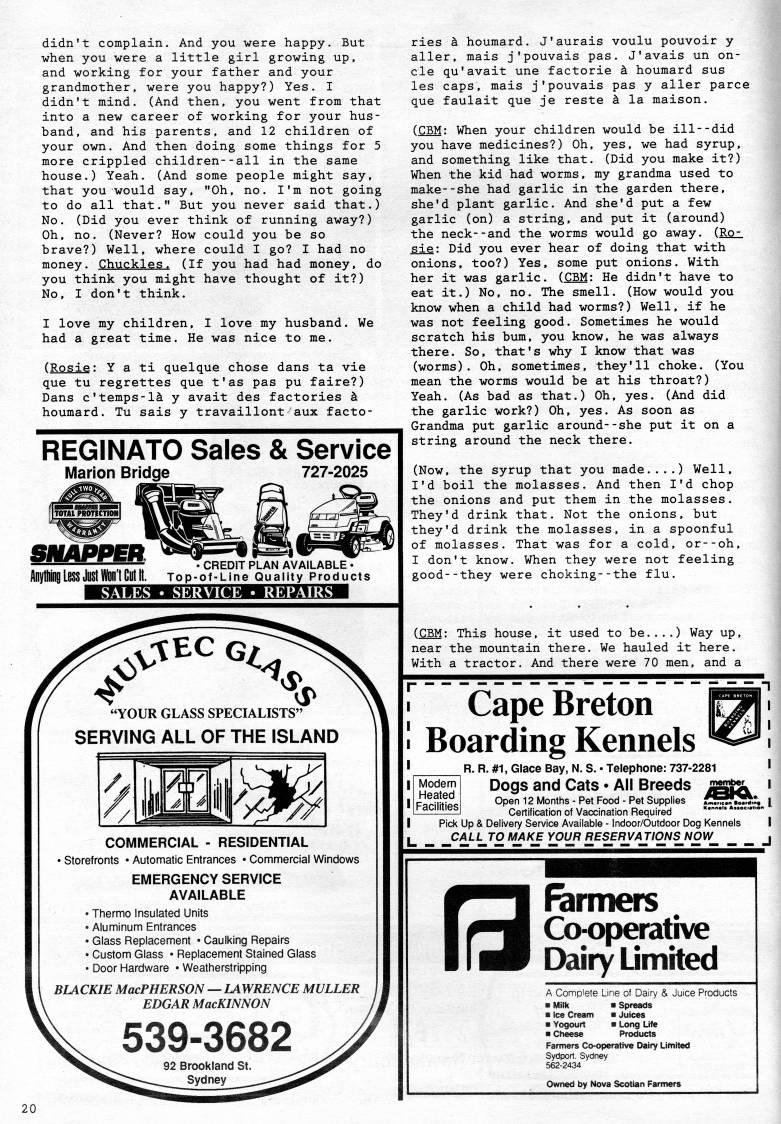 Published by Ronald Caplan on 1991/8/1 (268 reads)didn't complain. And you were happy. But when you were a little girl growing up, and working for your father and your grandmother, were you happy?) Yes. I didn't mind. (And then, you went from that into a new career of working for your hus? band, and his parents, and 12 children of your own. And then doing some things for 5 more crippled children--all in the same house.) Yeah. (And some people might say, that you would say, "Oh, no. I'm not going to do all that." But you never said that.) No. (Did you ever think of running away?) Oh, no. (Never? How could you be so brave?) Well, where could I go? I had no money. Chuckles. (If you had had money, do you think you might have thought of it?) No, I don't think. I love my children, I love my husband. We had a great time. He was nice to me. (Rosie: Y a ti quelque chose dans ta vie que tu regrettes que t'as pas pu faire?) Dans c'temps-1' y avait des factories k houmard. Tu sals y travaillont aux facto- REGINATO Sales & Service Marion Bridge 727-2025 AnyMiingLessJostln'lCutlt. . CREDIT PLAN AVAILABLE • Top-of-Line Quality Products SALES • SERVICE • REPAIRS "YOUR GLASS SPECIALISTS" SERVING ALL OF THE ISLAND COMMERCIAL - RESIDENTIAL • Storefronts • Automatic Entrances • Commercial Windows EMERGENCY SERVICE AVAILABLE • Thermo insulated Units • Aluminum Entrances • Glass Replacement • Caulking Repairs • Custom Glass • Replacement Stained Glass • Door Hardware • Weatherstripping BLACKIE MacPHERSON • LAWRENCE MULLER EDGAR MacKINNON 539-3682 92 Brookland St. Sydney ries k houmard. J'aurais voulu pouvoir y aller, mais j'pouvais pas. J'avals un on- cle qu'avait une factorie k houmard sus les caps, mais j'pouvais pas y aller parce que faulait que je reste k la maison. (CBM: When your children would be ill--did you have medicines?) Oh, yes, we had syrup, and something like that. (Did you make it?) When the kid had worms, my grandma used to make--she had garlic in the garden there, she'd plant garlic. And she'd put a few garlic (on) a string, and put it (around) the neck--and the worms would go away. (Ro? sie: Did you ever hear of doing that with onions, too?) Yes, some put onions. With her it was garlic. (CBM: He didn't have to eat it.) No, no. The smell. (How would you know when a child had worms?) Well, if he was not feeling good. Sometimes he would scratch his bum, you know, he was always there. So, that's why I know that was (worms). Oh, sometimes, they'll choke. (You mean the worms would be at his throat?) Yeah. (As bad as that.) Oh, yes. (And did the garlic work?) Oh, yes. As soon as Grandma put garlic around--she put it on a string around the neck there. (Now, the syrup that you made....) Well, I'd boil the molasses. And then I'd chop the onions and put them in the molasses. They'd drink that. Not the onions, but they'd drink the molasses, in a spoonful of molasses. That was for a cold, or--oh, I don't know. When they were not feeling good--they were choking--the flu. (CBM: This house, it used to be....) Way up, near the mountain there. We hauled it here. With a tractor. And there were 70 men, and a Cape Breton Boarding Kennels R. R. #1, Glace Bay, N. S. • Telephone: 737-2281 Modern Heated Facilities! Dogs and Cats • All Breeds Open 12 Months - Pet Food - Pet Supplies Certification of Vaccination Required Pick Up & Delivery Service Available - Indoor/Outdoor Dog Kennels CALL TO MAKE YOUR RESERVATIONS NOW B 'rmers Cooperative Dairy Limited A Complete Line of Dairy & Juice Products ?? Milk ?? Spreads ?? Ice Cream ?? Juices ?? Yogourt ?? Long Life ?? Cheese Products Farmers Co-operative Dairy Limited Sydport. Sydney 562-2434 Owned by Nova Scotian Farmers