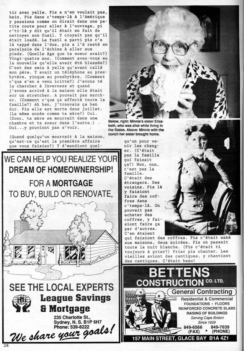 Published by Ronald Caplan on 1991/8/1 (258 reads)tir avec yelle. Pis a n'en voulait pas, hein. Pis dans c'temps-1' k I'Am'rique y passions comme on dirait dans une pe? tite route pour aller k 1'ouvrage, pi c'ti-1' y dit qu'il 6tait en fait de nettoyer son fusil. Y croyait pas qu'il 6tait load6. Le fusil a parti pis c'a 1' tapp6 dans I'dos, pis a 1'' rest6 en paralysie de I''chine k aller aux pieds. (Quelle age que ta soeur avait?) Vingt-quatre ans. (Comment avez-vous eu la nouvelle qu'elle avait 6t6 bless'e?) C'est des amis k yelle qu'avant call6 mon p're. Y avait un t616phone au pres- byt're, yinque au presbytfere. (Comment c'qua s'en a venu icitte?) J'avons t6 la chercher k Inverness et quand j'avons arriv' k la maison elle 6tait sur un stretcher. A pouvait pas march? er. (Comment c'que ga affect' toute la famille?) Ah ben, j'trouvais ga ben dur. Pis elle est morte dans juillet. (La meme ann'e comme ta m're?) Oui. (Done, ta m're se mourrait dans une chambre et ta soeur dans I'autre.) ' Oui...y pouviont pas s'voir. (Quand quelqu'un mourrait k la maison, qu'est-ce qu'est la premiere affaire que vous faisiez?) Y d'mandiont quel- Below, right: Minnie's sister Eliza? beth, who was shot while living in the States. Above: IVlinnie with the conch her sister brought home. qu'un pour ve? nir les chang- WE CAN HELP YOU REALIZE YOUR DREAM OF HOMEOWNERSHIP! FOR A MORTGAGE TO BUY, BUILD OR RENOVATE, (C'etait pas la famille qui faisait ga?) Non, non, c'est pas la famille. C'etait des Strangers. Des voisins. Pis lk y faisiont faire des cof- fres dans c'temps-la. On pouvait pas acheter des coffres, y fai? siont faire ga par d'autres. C'en 'talent qui faisiont des coffres. Pis c'etait wak6 aux maisons, deux soirees. Pis on passait toute la nuit blanche. (Pis c'etait ti toujours k prier?) Prier pis chanter. Les vieilles aviont des cantiques, y chantiont des cantiques. C'6tait beau! SEE THE LOCAL EXPERTS League Savings & Mortgage BETTENS CONSTRUCTION"??"'' 235 Charlotte St., Sydney, N.S. BIP6H7 Phone: 539-8222 //' / 7(/e '4ane 'o' 9"''' General Contracting j Residential & Commercial FOUNDATIONS • FLOORS REINFORCED CONCRETE SLABS RAISING OF BUILDINGS Serving Cape Breton Since 1929 849-6566 849-7639 (FAX) • (PHONE) 157 MAIN STREET, GLACE BAY B1A 4Z1