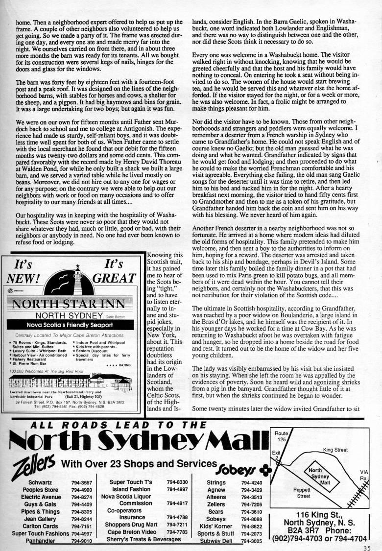 Published by Ronald Caplan on 1991/8/1 (261 reads)home. Then a neighborhood expert offered to help us put up the frame. A couple of other neighbors also volunteered to help us get going. So we made a party of it. The frame was erected dur? ing one day, and every one ate and made merry far into the night. We ourselves carried on from there, and in about three more months the bam was ready for its tenants. All we bought for its consfruction were several kegs of nails, hinges for the doors and glass for the windows. The bam was forty feet by eighteen feet witii a fourteen-foot post and a peak roof. It was designed on the lines of the neigh? borhood bams, with stables for horses and cows, a shelter for the sheep, and a pigpen. It had big haymows and bins for grain. It was a large undertaking for two boys; but again it was fun. We were on our own for fifteen months until Father sent Mur? doch back to school and me to college at Antigonish. The expe? rience had made us sturdy, self-reliant boys, and it was doubt? less time well spent for both of us. When Father came to settle with the local merchant he found that our debit for the fifteen months was twenty-two dollars and some odd cents. This com? pared favorably with the record made by Henry David Thoreau at Walden Pond, for while he only built a shack we built a large bam, and we served a varied table while he lived mostiy on beans. Moreover, we did not hire out to any one for wages or for any purpose; on the contrary we were able to help out our neighbors with work or food on many occasions and to offer hospitality to our many friends at all times.... Our hospitality was in keeping with the hospitality of Washa? buckt. TTiese Scots were never so poor that they would not share whatever they had, much or littie, good or bad, with their neighbors or anybody in need. No one had ever been known to refuse food or lodging. Knowing this Scottish trait, it has pained me to hear of the Scots be? ing "tight," and to have to listen eter? nally to in? ane and stu? pid jokes, especially in New York, about it. This reputation doubtiess had its origin in the Low- landers of Scotiand, whom the Celtic Scots, of the High? lands and Is- It's NEW! It's GREAT ORTH STAR INN NORTH SYDNEY c.p.B, • ?? Nova Scotia's Friendly Seaport Centrally Located To Major Cape Breton Attractions * 75 Rooms - Kings, Standards, * Indoor Pool and Whirlpool Suites and Mini Suites * Kids free with parents - * Luxury Suite - Whirlpool Bath • Seniors Discount * Harbour View - Air conditioned * Special day rates for ferry * Fishery Restaurant travellers * St. Pierre Rum Bar 100.000 Welcomes At Ttie Big Red Roof * RATING vfoundland Ferry and ' '' (Erit 21, Highway 105) 39 Forrest Street, P.O. Box 157. Nortti Sydney, N.S. B2A 3M3 Tel: (902) 794-8581 Fax: (902) 794-4628 lands, consider English. In the Barra Gaelic, spoken in Washa? buckt, one word indicated both Lowlander and Englishman, and there was no way to distinguish between one and the other, nor did these Scots think it necessary to do so. Every one was welcome in a Washabuckt home. The visitor walked right in without knocking, knowing that he would be greeted cheerfully and that the host and his family would have nothing to conceal. On entering he took a seat without being in? vited to do so. The women of the house would start brewing tea, and he would be served this and whatever else the home af? forded. If the visitor stayed for the night, or for a week or more, he was also welcome. In fact, a frolic might be arranged to make things pleasant for him. Nor did the visitor have to be known. Those from other neigh- borhooods and strangers and peddlers were equally welcome. I remember a deserter from a French warship in Sydney who came to Grandfather's home. He could not speak English and of course knew no GaeUc; but the old man guessed what he was doing and what he wanted. Grandfather indicated by signs that he would get food and lodging; and then proceeded to do what he could to make the worried Frenchman comfortable and his visit agreeable. Everything else failing, the old man sang Gaelic songs for the deserter until it was time to retire, and then led him to his bed and tucked him in for the night. After a hearty breakfast next moming, the visitor tried to hand fifty cents first to Grandmother and then to me as a token of his gratitude, but Grandfather handed him back the coin and sent him on his way with his blessing. We never heard of him again. Another French deserter in a nearby neighborhood was not so fortunate. He arrived at a home where modem ideas had diluted the old forms of hospitality. This family pretended to make him welcome, and then sent a boy to the authorities to inform on him, hoping for a reward. The deserter was arrested and taken back to his ship and bondage, perhaps in Devil's Island. Some time later this family boiled the family dinner in a pot that had been used to mix Paris green to kill potato bugs, and all mem? bers of it were dead within the hour. You cannot tell their neighbors, and certainly not the Washabuckters, that this was not retribution for their violation of the Scottish code.... The ultimate in Scottish hospitality, according to Grandfather, was reached by a poor widow on Boulanderie, a large island in the Bras d'Or lakes, and he himself was the recipient of it. In his younger days he worked for a time at Cow Bay. As he was returning to Washabuckt afoot he was overtaken with fatigue and hunger, so he dropped into a home beside the road for food and rest. It tumed out to be the home of the widow and her five young children. The lady was visibly embarrassed by his visit but she insisted on his staying. When she left the room he was appalled by the evidences of poverty. Soon he heard wild and agonizing shrieks from a pig in the bamyard. Grandfather thought little of it at first, but when the shrieks continued he began to wonder. Some twenty minutes later the widow invited Grandfather to sit 