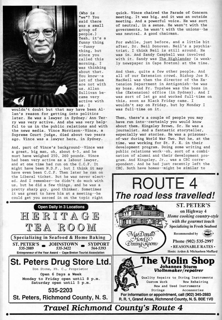 Published by Ronald Caplan on 1991/8/1 (290 reads)'im' (Who is "we"? You I said there jwas a small I group of I people.) I Yeah, it's a I funny thing 1 - - funny jthing, but I since you I called this jmorning. I ??was thinking jabout that. I You know--a I lot of them I are not with . Allan I Sullivan be- jcame very [active with jus. I wouldn't doubt but that may have been Al? lan's reason for getting into politics later. He was a lawyer in Sydney/ Ann Ter? ry was very active. And she was very help? ful to us in the public relations and with the news media. Vince Morrison--Vince, a Supreme Court judge, died about two years ago. Vince was a lawyer here, in Sydney. And, part of Vince's background--Vince was a great, big man, oh, about 6-5, and he must have weighed 250, 260 pounds. Vince had been very active as a labour lawyer, and at one time had run on the C.C.F. It might have been N.D.P., but I think it may have even been C.C.F. Then later he ran on the Liberal ticket. But he was never elect? ed. And I remember--he didn't do much with us, but he did a few things, and he was a pretty sharp guy, good thinker. Sometimes it was great to have him at a meeting--he could get you zeroed in on the topic right Open Daily in 3 Locations TEA EOO (Specializing in Seafood & Home Baking ) ST. PETER'S . JOHNSTOWN . SYDPORT 535-2089 535-3422 564-5393 Entrepreneur of the Year Award • Cape Breton Tourist Association quick. Vince chaired the Parade of Concern meeting. It was big, and it was an outside meeting. And a powerful voice. He was sort of neutral, in a sense. He wasn't with the governments, he wasn't with the unions--he was neutral. A good chairman. For awhile, just before, and a little bit after. Dr. Neil Donovan. Neil's a psychia? trist. I think Neil is still around. He was in. And Sandy Campbell was involved with it. Sandy was The Highlander (a week? ly newspaper in Cape Breton) at the time. And then, quite a few other people. And all of our Extension crowd. Bishop Joe N. MacNeil was then the director of the Ex? tension Department in Antigonish--he was my boss. And Fr. Topshee was the boss in the (Extension) office (in Sydney). And I was sort of let go and worked full-time on this, soon as Black Friday came. I wouldn't say on Friday, but by Monday I was full-time on it. Then, there's a couple of people you may have run into--certainly you would know about them. Kingsley Brown, Sr. He was a journalist. And a fantastic storyteller, especially war stories. He was a prisoner- of-war during World War Two. But he, at the time, was working for St. F. X. in their development program. Doing some writing and public relations work--oh, sort of a combi? nation of alumni and their development pro? gram. And Kingsley, Jr., was a CBC corre? spondent. And he had just recently left the CBC. Both have homes--might be similar to ROUTE 4 The road less travelled! ST. PETER'S on Highway 4 Home cooking country-style with the gourmet touch • f Specializing in Fresh Seafood Recommended by 'fm''* Phone (902) 535-2997 • REASONABLE RATES • Hosts: Arden & Michaeleen Moffard St. Peters Drug Store Ltd, Don Stone, Ph. C, Proprietor Open 6 Days a Week Monday to Friday open until 8 p.m. Saturday open until 5 p.m. 535-2203 St. Peters, Richmond County, N. S. The Violin Shop ' Johannes Sturm Violinmaker/repairer Quality Repairs to String Instruments Custom Work Bow Rehairing New and Used Instruments Strings Accessories For information or appointment, call (902) 345-2883 R. R. 1, Grand Anse, Richmond County, N, S. BOE 1V0 Travel Richmond County's Route 4