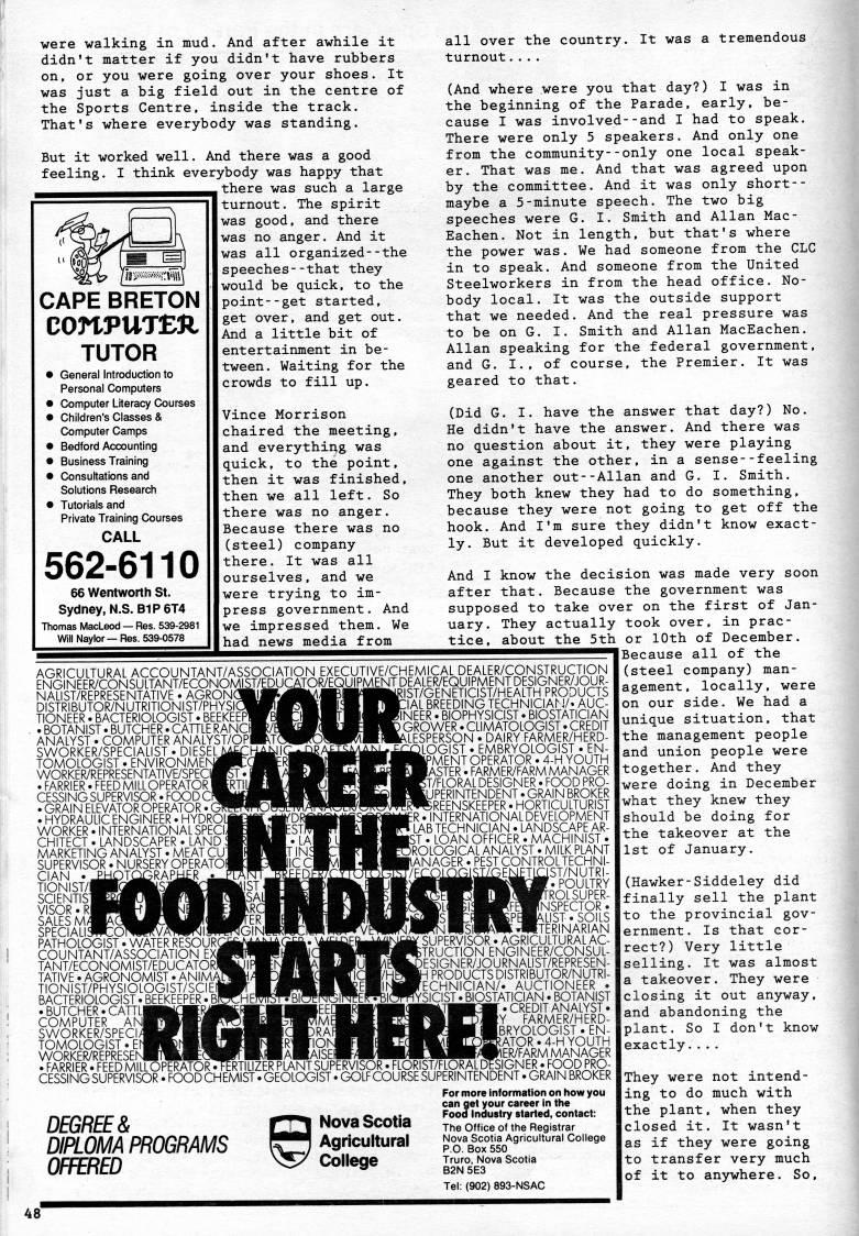 Published by Ronald Caplan on 1991/8/1 (251 reads)were walking in mud. And after awhile it didn't matter if you didn't have rubbers on, or you were going over your shoes. It was just a big field out in the centre of the Sports Centre, inside the track. That's where everybody was standing. But it worked well. And there was a good feeling. I think everybody was happy that there was such a large turnout. The spirit was good, and there was no anger. And it was all organized--the speeches--that they would be quick, to the point--get started, get over, and get out. And a little bit of entertainment in be? tween. Waiting for the crowds to fill up. Vince Morrison chaired the meeting, and everything was quick, to the point, then it was finished, then we all left. So there was no anger. Because there was no (steel) company there. It was all ourselves. and we were trying to im? press government. And we impressed them. We had news media from CAPE BRETON COnPUTEJl TUTOR • General Introduction to Personal Computers • Computer Literacy Courses • Children's Classes & Computer Camps • Bedford Accounting • Business Training • Consultations and Solutions Research • Tutorials and Private Training Courses CALL 562-6110 66 Wentworth St. Sydney, N.S. BIP 6T4 Thomas MacLeod • Res. 539-2981 Will Naylor • Res. 539-0578 AGRICULTURAL ACCOUNTANT/ASSOCIATION EXECUTIVE/CHEMICAL DEALER/CONSTRUCTION ENGINEER/CONSULTANT/ECONOMIST/EDUCATOR/EQUIPMENT DEALER/EQUIPMENT DESIGNER/JOUR- NALIST/REPRESENTATIVE • AGRON< DISTRIBUTOR/NUTRITIONIST/PHYSI?_, TIONEER. BACTERIOLOGIST. BEEKEEPl . BOTANIST. BUTCHER. CATTLE RANCI ANALYST. COMPUTER ANALYST/OPi SWORKER/SPECIALIST • DIESEL TOMOLOGIST • ENVIRONMEI _. WORKER/REPRESENTATIVE/SPEC'T . FARRIER. FEEDMILLOPERATOrMRTII CESSINGSUPERVISOR.FOODCP' - . GRAIN ELEVATOR OPERATOR _, . HYDRAULIC ENGINEER • HYDROl WORKER. INTERNATIONAL SPECL CHITECT . LANDSCAPER • LAND : MARKETING ANALYST. MEAT CU" SUPERVISOR • NURSERY OPERATOI CIAN TIONIST/I SCIENTIS" VISOR : SALES M, SPECIALI: PATHOLOGIST • WATER RESOURi COUNTANT/ASSOCIATION E" TANT/ECONOMIST/EDUCATOI TATIVE. AGRONOMIST • ANIM/ TIONIST/PHYSIOLOGIST/SCIE BACTERIOLOGIST.BEEKEEPER " . BUTCHER. CATTLf' COMPUTER AN SWORKER/SPECL TOMOLOGIST. El WORKER/REPRESEI . FARRIER. FEED MILLOPERATOR all over the country. It was a tremendous turnout.... (And where were you that day?) I was in the beginning of the Parade, early, be? cause I was involved--and I had to speak. There were only 5 speakers. And only one from the community--only one local speak? er. That was me. And that was agreed upon by the committee. And it was only short-- maybe a 5-minute speech. The two big speeches were G. I. Smith and Allan Mac? Eachen. Not in length, but that's where the power was. We had someone from the CLC in to speak. And someone from the United Steelworkers in from the head office. No? body local. It was the outside support that we needed. And the real pressure was to be on G. I. Smith and Allan MacEachen. Allan speaking for the federal government, and G. I., of course, the Premier. It was geared to that. (Did G. I. have the answer that day?) No. He didn't have the answer. And there was no question about it, they were playing one against the other, in a sense--feeling one another out--Allan and G. I. Smith. They both knew they had to do something, because they were not going to get off the hook. And I'm sure they didn't know exact? ly. But it developed quickly. And I know the decision was made very soon after that. Because the government was supposed to take over on the first of Jan? uary. They actually took over, in prac? tice, about the 5th or 10th of December. Because all of the (steel company) man? agement, locally, were on our side. We had a unique situation, that the management people and union people were together. And they were doing in December what they knew they should be doing for the takeover at the 1st of January. :IST/GENETICIST/HEALTH PRODUCTS JIAL BREEDING TECHNICIAN/. AUC- fNEER. BIOPHYSICIST. BIOSTATICIAN GROWER. CLIMATOLOGIST. CREDIT ?? LESPERSON . DAIRY FARMER/HERD- ??"iOGIST . EMBRYOLOGIST . EN- ?MENT OPERATOR • 4-H YOUTH tASTER. FARMER/FARM MANAGER ;t/FLORAL designer . FOOD PRO- yPERINTENDENT. GRAIN BROKER . bREENSKEEPER. HORTICULTURIST ;R . INTERNATIONAL DEVELOPMENT LAB TECHNICIAN • LANDSCAPE AR- |ST . LOAN OFFICER . MACHINIST . ' ROLOGICAL ANALYST. MILK PLANT lANAGER. PEST CONTROL TECHNI- ,ST/NUTRI- POULTRY ??ROLSUPER- NSPECTOR. ".LIST. SOILS --.- jTERINARIAN supervisor. agricultural ac- ;truction engineer/consul- iESIGNER/JOURNALIST/REPRESEN- : PRODUCTS DISTRIBUTOR/NUTRI- ECHNICIAN/. AUCTIONEER . 'SICIST. BIOSTATICIAN. BOTANIST CREDIT ANALYST. :Y FARMER/HERD- BRYOLOGIST. EN- 'ATOR. 4-H YOUTH ;ER/FARM MANAGER _.. JRTILIZER PLANT SUPERVISOR. FLORIST/FLORAL DESIGNER. FOOD PRO? CESSING SUPERVISOR. FOOD CHEMIST. GEOLOGIST. GOLF COURSE SUPERINTENDENT. GRAIN BROKER DEGREE& DIPLOMA PROGRAMS OFFERED Nova Scotia I Agricultural College For more information on how you can get your career in the Food Industry started, contact: The Office of the Registrar Nova Scotia Agricultural College P.O. Box 550 Truro, Nova Scotia B2N 5E3 Tel: (902) 893-NSAC (Hawker-Siddeley did finally sell the plant to the provincial gov? ernment. Is that cor? rect?) Very little selling. It was almost a takeover. They were closing it out anyway, and abandoning the plant. So I don't know exactly.... They were not intend? ing to do much with the plant, when they closed it. It wasn't as if they were going to transfer very much of it to anywhere. So, 48