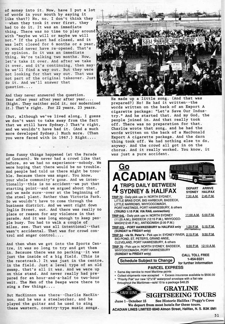 Published by Ronald Caplan on 1991/8/1 (165 reads)of money into it. Now, have I put a lot of words in your mouth by saying it like that?) No, no. I don't think they --when they took it over first, they had to do it. It was an immediate thing. There was no time to play around with "maybe we will or maybe we will not." If the plant had closed, and it was left closed for 6 months or a year, it would never have re-opened. That's my opinion. So it was an immediate thing. We're talking two months. Now, let's take it over. And after we take it over, and it's continuing, then may? be we'll find a way out. But they were not looking for that way out. That was not part of the original takeover. Just do it. And we'll answer that question.... And they never answered the question. Year after year after year after year.... (Right. They neither sold it, nor modernized it.) That's right. For 22 years, 23 years. (But, although we've lived along, I guess we don't want to take away from the fact that we still have Sydney.) That's right, and we wouldn't have had it. (And a much more developed Sydney.) Much more. (Than you were faced with in 1967.) Right.... Some funny things happened (at the Parade of Concern). We never had a crowd like that before, so we had no experience--nobody. We were hoping that there would be no trouble. And people had told us there might be trou? ble. Because there was anger. You know, your whole community's gone. And we inten? tionally- -this is no accident--we put that starting point--and we argued about that, and we made sure--over at the beginning of the steel plant. Rather than Victoria Park. So we wouldn't have to come through the business district. And we went right down Inglis Street, out. And there was really no place or reason for any violence in that parade. And it was long enough to keep peo? ple busy. You had to walk a couple of miles, see. That was all intentional--that wasn't accidental. That was for crowd con? trol and anger control.... And then when we got into the Sports Cen? tre, it was so long to try and get them in. Because there was no parking--it was just the inside of a big field. (This is the racetrack.) It was just in the centre, in the field. Just a level type of an old swamp, that's all it was. And we were up on this stand. And never really had pre? pared for an hour-and-a-half to two-hour wait. The Men of the Deeps were there to sing a few things.. . . But MacKinnon was there--Charlie MacKin? non. And he was a steelworker, and he played the guitar and he used to sing these western, country-type music songs. He made up a little song. (And that was prepared?) No! He had it written--the words written on the back of an Export A cigarette package: "Let's Save Our Indus? try." And he started that. And my God, the people joined in. And that really took off. There was no preparation for that. Charlie wrote that song, and he had the words written on the back of a MacDonald Export A cigarette package. And the darn thing took off. We had nothing else to do, anyway. And the crowd all got in on the chorus. And it really worked. You know, it was just a pure accident. ACADIAN 4 TRIPS DAILY BETWEEN SYDNEY & HALIFAX TRIP 72 - Daily pick ups in: NORTH SYDNEY, LITTLE BRAS D'OR, BIG HARBOUR, BADDECK, LITTLE NARROWS, WHYCOCOMAGH, PORT HASTINGS, PORT HAWKESBURY, & others (TRUR01:15 P.M. VIA RAIL connection) TRIP 64L - Daily pick ups in: NORTH SYDNEY (11:25 AM.), BADDECK (12:15 P.M.), WHYCOCO- MAGH(12:45 P.M.), ANTIGONISH (2:00 P.M.) TRIP 62L - PORT HAWKESBURY to HALIFAX only (SUNDAY to FRIDAY only) >....r, • • ?=..u, • TRIP 54 - via St. Peter's - Pick ups in: SYDNEY RIVER. 2:15 P.M. 9.50 P.M. BIG POND, ST. PETER'S, GRAND ANSE, CLEVELAND, PORT HAWKESBURY, & others TRIP 76 - Pick ups in: NORTH SYDNEY. BADDECK. 6:00 P.M. 12:10 A.M. WHYCOCOMAGH, PORT HAWKESBURY (SUNDAY to FRIDAY only) '.''L TOLL FREE (schedule Subject to Change) ' 1-454-9321 V S--' for further information ARRIVE HALIFAX 2:45 P.M. 11:00 A.M. 5:00 P.M. 5:15 P.' PARCEL EXPRESS • Same day service to most Maritime points • Collect shipments now accepted • Excess insurance available to $500.00 • "Priority Pak" our new 12''x16" waterproof envelope with a flat rate throughout the Maritimes • sold 10 to a package $48.25 GRAYLINE SIGHTSEEING TOURS JuBe 1 - October 15 See Historic Halifax / Peggy's Cove We depart from most hotels for these tours. ACADIAN LINES LIMITED 6040 Almon Street, Halifax, N. S. B3K 5M1 51
