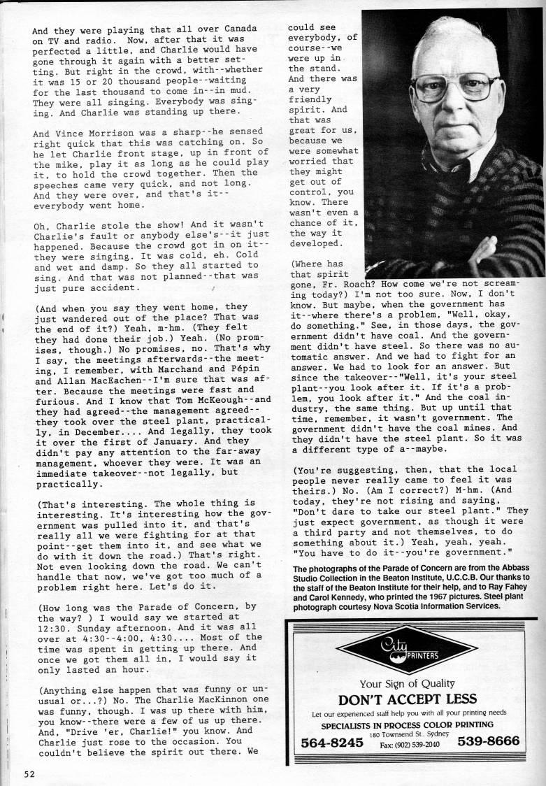 Published by Ronald Caplan on 1991/8/1 (198 reads)And they were playing that all over Canada on TV and radio. Now, after that it was perfected a little, and Charlie would have gone through it again with a better set? ting. But right in the crowd, with--whether it was 15 or 20 thousand people--waiting for the last thousand to come in--in mud. They were all singing. Everybody was sing? ing. And Charlie was standing up there. And Vince Morrison was a sharp--he sensed right quick that this was catching on. So he let Charlie front stage, up in front of the mike, play it as long as he could play it, to hold the crowd together. Then the speeches came very quick, and not long. And they were over, and that's it-- everybody went home. Oh, Charlie stole the show! And it wasn't Charlie's fault or anybody else's--it just happened. Because the crowd got in on it-- they were singing. It was cold, eh. Cold and wet and damp. So they all started to sing. And that was not planned--that was just pure accident. (And when you say they went home, they just wandered out of the place? That was the end of it?) Yeah. m-hm. (They felt they had done their job.) Yeah. (No prom? ises, though.) No promises, no. That's why I say, the meetings afterwards--the meet? ing, I remember, with Marchand and P6pin and Allan MacEachen--I'm sure that was af? ter. Because the meetings were fast and furious. And I know that Tom McKeough--and they had agreed--the management agreed-- they took over the steel plant, practical? ly, in December.... And legally, they took it over the first of January. And they didn't pay any attention to the far-away management, whoever they were. It was an immediate takeover--not legally, but practically. (That's interesting. The whole thing is interesting. It's interesting how the gov? ernment was pulled into it, and that's really all we were fighting for at that point--get them into it, and see what we do with it down the road.) That's right. Not even looking down the road. We can't handle that now, we've got too much of a problem right here. Let's do it. (How long was the Parade of Concern, by the way? ) I would say we started at 12:30. Sunday afternoon. And it was all over at 4:30--4:00, 4:30.... Most of the time was spent in getting up there. And once we got them all in, I would say it only lasted an hour. (Anything else happen that was funny or un? usual or...?) No. The Charlie MacKinnon one was funny, though. I was up there with him, you know--there were a few of us up there. And, "Drive 'er, Charlie!" you know. And Charlie just rose to the occasion. You couldn't believe the spirit out there. We could see everybody, of course--we were up in the stand. And there was a very friendly spirit. And that was great for us, because we were somewhat worried that they might get out of control, you know. There wasn't even a chance of it, the way it developed. (Where has that spirit gone, Fr. Roach? How come we're not scream? ing today?) I'm not too sure. Now, I don't know. But maybe, when the government has it--where there's a problem, "Well, okay, do something." See, in those days, the gov? ernment didn't have coal. And the govern? ment didn't have steel. So there was no au? tomatic answer. And we had to fight for an answer. We had to look for an answer. But since the takeover--"Well, it's your steel plant--you look after it. If it's a prob? lem, you look after it." And the coal in? dustry, the same thing. But up until that time, remember, it wasn't government. The government didn't have the coal mines. And they didn't have the steel plant. So it was a different type of a--maybe. (You're suggesting, then, that the local people never really came to feel it was theirs.) No. (Am I correct?) M-hm. (And today, they're not rising and saying, "Don't dare to take our steel plant." They just expect government, as though it were a third party and not themselves, to do something about it.) Yeah, yeah, yeah. "You have to do it--you're government." The photographs of the Parade of Concern are from the Abbass Studio Collection In the Beaton Institute, U.C.C.B. Our thanks to the staff of the Beaton Institute for their help, and to Ray Fahey and Carol Kennedy, who printed the 1967 pictures. Steel plant photograph courtesy Nova Scotia Information Services. Your Sign of Quality DON'T ACCEPT LESS Let our experienced staff help you with ail your printing needs SPECIALISTS IN PROCESS COLOR PRINTING 180 Townsend St.. Sydney 564-8245 Fax: (902) 539-2040 539-8666