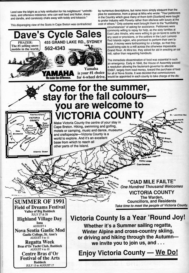 Leod saw the blight as a holy retribution for his neighbours' "unthrifti- ness, and offensive indolence; who can well feed and flutter, dress and dandle, and carelessly chafe away with toddy and tobacco." This disparaging view of the Scots in Cape Breton was contradicted Dave's Cycle Sales PHAZER The #1 selling snow Ijnobile in the worldj 455 GRAND LAKE RD., SYDNEY 562-4343 - . Yamaha YAMAHA is your #1 choice Wemakethedjfference. for 4-wheel drive. by numerous descriptions, but none more simply eloquent than the plea for assistance, from a group at Mira who wrote: "Your petitioners in the Country which gave many of them birth [Scotland] were taught to prefer industry with Poverty rather than idleness with luxury at the cost of others." Only extreme want brought them to the "humiliating circumstances" of asking for assistance. Petitioners were commonly willing to repay for help, as the sixty families at East Lake Ainslie, who were willing to go on bond to settle for any seed or provisions, or the settlers in the Loch Lomond- Red Islands region, who promised to perform their own la? bour, if money were forthcoming for a bridge, so that they could bring oats to a mill across the otherwise impassable Grand River. At Mira too, they asked for aid in erecting an oat mill, rather than requesting handouts. The immediate dissemination of food was essential in such an emergency. Early in 1846, the House of Assembly passed a resolution allowing the lieutenant-governor to allocate ??3667, largely from road money, toward the purchase of food for all of Nova Scotia. It was decided that commissioners would be appointed in each county to take charge of the dis- Come for the summer, stay for the fall colours • you are welcome to VICTORIA COUNTY Make Victoria County the centre of your stay in Cape Breton. Hiking, swimming and golfing, motels or camping, music and dance, museums and craftspeople • Victoria County is a world to explore. And it's an excellent base from which to reach all other parts of the Island. SUMMER OF 1991 Field of Dreams Festival Valley of Big Baddeck JULY 27 & 28 Highland Village Day lona AUGUST 4 Nova Scotia Gaelic Mod Gaelic College, St. Ann's AUGUST 5 to 11 Regatta Week Bras d'Or Yacht Club, Baddeck AUGUST 4 to 10 Centre Bras d'Or Festival of the Arts Baddeck JULY 13 to AUGUST 17 "CIAD MILE FAILTE" One Hundred Thousand Welcomes VICTORIA COUNTY The Warden, Councillors, and Residents Take time to meet the people of Victoria County. Victoria County Is a Year 'Round Joy! Whether it's a Summer sailing regatta, Winter Alpine and cross-country skiing, or driving and hiking through the Autumn • we invite you to join us, and ... Enjoy Victoria County • We Do!