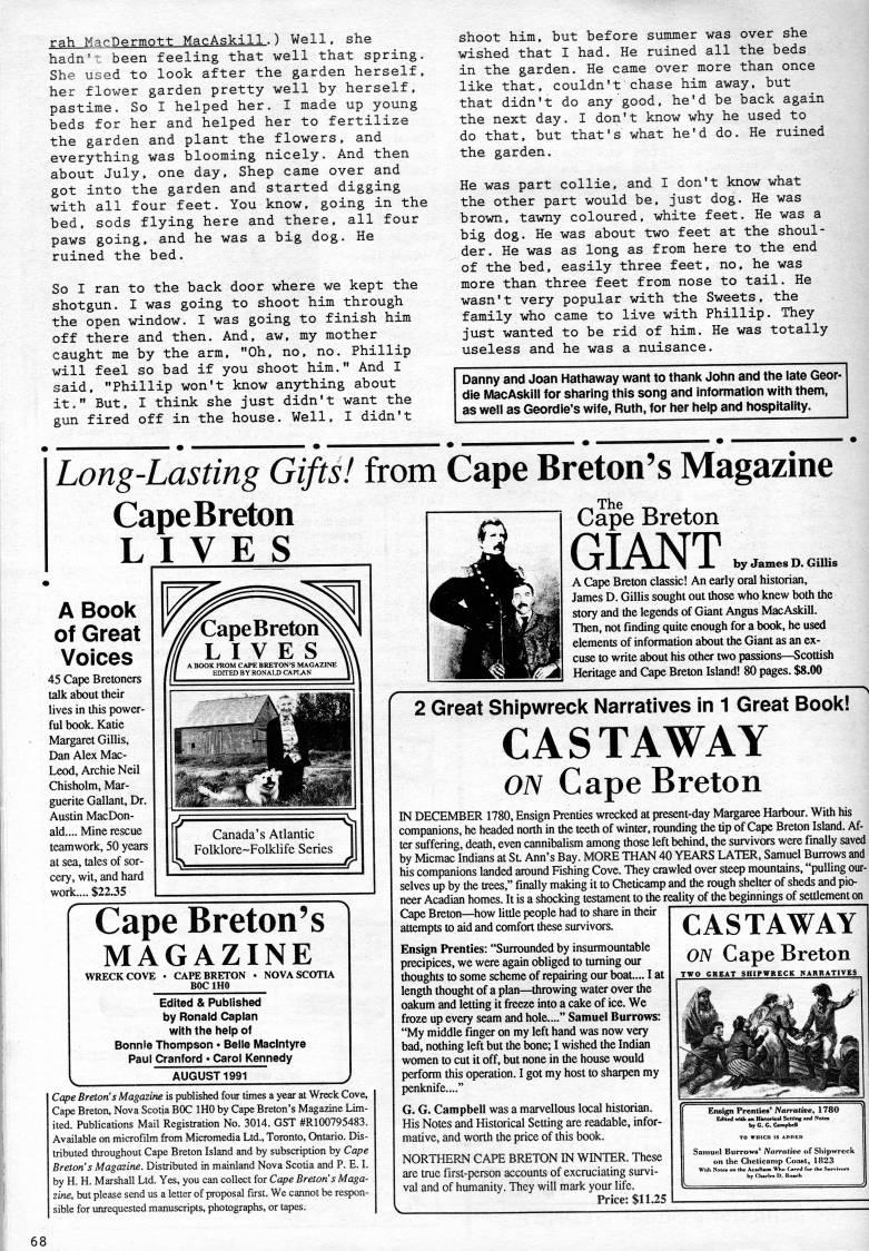 Published by Ronald Caplan on 1991/8/1 (245 reads)rah MacDermott MacAskill.) Well, she hadn't been feeling that well that spring. She used to look after the garden herself, her flower garden pretty well by herself, pastime. So I helped her. I made up young beds for her and helped her to fertilize the garden and plant the flowers, and everything was blooming nicely. And then about July, one day, Shep came over and got into the garden and started digging with all four feet. You know, going in the bed, sods flying here and there, all four paws going, and he was a big dog. He ruined the bed. So I ran to the back door where we kept the shotgun. I was going to shoot him through the open window. I was going to finish him off there and then. And, aw, my mother caught me by the arm, "Oh, no, no. Phillip will feel so bad if you shoot him." And I said, "Phillip won't know anything about it." But, I think she just didn't want the gun fired off in the house. Well, I didn't shoot him, but before summer was over she wished that I had. He ruined all the beds in the garden. He came over more than once like that, couldn't chase him away, but that didn't do any good, he'd be back again the next day. I don't know why he used to do that, but that's what he'd do. He ruined the garden. He was part collie, and I don't know what the other part would be, just dog. He was brown, tawny coloured, white feet. He was a big dog. He was about two feet at the shoul? der. He was as long as from here to the end of the bed, easily three feet, no, he was more than three feet from nose to tail. He wasn't very popular with the Sweets, the family who came to live with Phillip. They just wanted to be rid of him. He was totally useless and he was a nuisance. Danny and Joan Hathaway want to thank John and the late Geor? die MacAskill for sharing this song and information with them, as well as Geordie's wife, Ruth, for her help and hospitality. Long-Lasting Gifts! from Cape Breton's Magazine CapeBreton LIVES A Book of Great Voices 45 Cape Bretoners talk alx)ut their lives in this power? ful book. Katie Margaret Gillis, Dan Alex Mac? Leod, Archie Neil Chisholm, Mar? guerite Gallant, Dr. Austin MacDon? ald.... Mine rescue teamwork, 50 years at sea, tales of sor? cery, wit, and hard work.... $22.35 Cape Breton's MAGAZINE WRECK COVE . NOVA SCOTIA Edited & Published by Ronald Caplan with the help of Bonnie Thompson • Belle Maclntyre Paul Cranford ??Carol Kennedy AUGUST 1991 Cape Breton s Magazine is published four times a year at Wreck Cove, Cape Breton, Nova Scotia BOC IHO by Cape Breton's Magazine Lim? ited. Publications Mail Registration No. 3014. GST #R100795483. Available on microfilm from Micromedia Ltd., Toronto, Ontario. Dis? tributed throughout Cape Breton Island and by subscription by Cape Breton's Magazine. Distributed in mainland Nova Scotia and P. E. I. by H. H. Marshall Ltd. Yes, you can collect for Cape Breton's Maga? zine, but please send us a letter of proposal first. We cannot be respon? sible for unrequested manuscripts, photographs, or tapes. James D. Gillis Cape Breton GIANT. A Cape Breton classic! An early oral historian, James D. GilUs sought out those who knew both the story and the legends of Giant Angus MacAskill. Then, not finding quite enough for a book, he used elements of information about the Giant as an ex? cuse to write about his other two passions • Scottish Heritage and Cape Breton Island! 80 pages. $8.00 2 Great Shipwreck Narratives in 1 Great Bool Prenties' Narrative, 1780