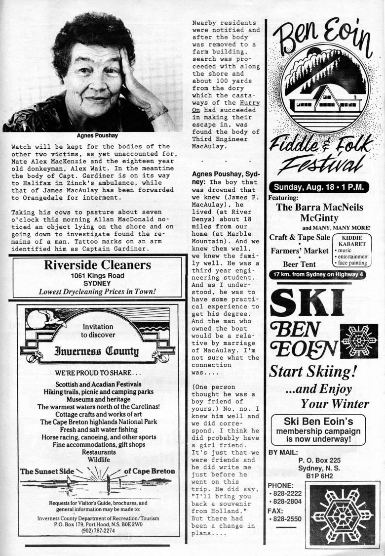 Published by Ronald Caplan on 1991/8/1 (229 reads)Agnes Poushay Watch will be kept for the bodies of the other two victims, as yet unaccounted for. Mate Alex MacKenzie and the eighteen year old donkeyman, Alex Wait. In the meantime the body of Capt. Gardiner is on its way to Halifax in Zinck's ambulance, while that of James MacAulay has been forwarded to Orangedale for interment. Taking his cows to pasture about seven o'clock this morning Allan MacDonald no? ticed an object lying on the shore and on going down to investigate found the re? mains of a man. Tattoo marks on an arm identified him as Captain Gardiner. Riverside Cleaners 1061 Kings Road SYDNEY Lowest Drycleaning Prices in Town! WE'RE PROUD TO SHARE... Scottish and Acadian Festivals Hiking trails, picnic and camping parks Museums and heritage The warmest waters north of the Carolinas! Cottage crafts and works of art The Cape Breton highlands National Park Fresh and salt water fishing Horse racing, canoeing, and other sports Fine accommodations, gift shops Restaurants Wildlife The Sunset Side ' I / /'' of Cape Breton -'' Requests for Visitor's Guide, brochures, and general information may be made to: Inverness County Department of Recreation/Tourism P.O. Box 179, Port Hood, N.S. BOE 2W0 (902)787-2274 Nearby residents were notified and after the body was removed to a farm building, search was pro? ceeded with along the shore and about 100 yards from the dory which the casta? ways of the Hurry On had succeeded in making their escape in, was found the body of Third Engineer MacAulay. Agnes Poushay, Syd? ney: The boy that was drowned that we knew (James F. MacAulay), he lived (at River Denys) about 18 miles from our home (at Marble Mountain). And we knew them well, we knew the fami? ly well. He was a third year engi? neering student. And as I under? stood, he was to have some practi? cal experience to get his degree. And the man who owned the boat would be a rela? tive by marriage of MacAulay. I'm not sure what the connection was.... (One person thought he was a boy friend of yours.) No, no. I knew him well and we did corre? spond. I think he did probably have a girl friend. It's just that we were friends and he did write me just before he went on this trip. He did say, "I'll bring you back a souvenir from Holland." But there had been a change in plans.... Sunday, Aug. 18 • ! P.M. Featuring: The Barra MacNeils McGinty and MANY, MANY MORE! Craft & Tape Sale i Farmers' Market Beer Tent *U!Hii.l..L-tlJ.I.UII.I.I!ll.l.iNUl|.> SKI Start Skiing! ...and Enjoy Your Winter Ski Ben Eoin's membersliip campaign is now underway! BY MAIL: