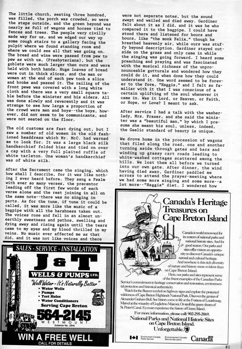 The little church, seating three hundred, was filled, the porch was crowded, so were the steps outside, and the green beyond was nearly as full of wagons and horses tied to fences and trees. The people very civilly made way for us, and we edged our way up some rough stairs to a gallery facing the pulpit where we found standing room and where we could see all that was going on. The bread and wine were passed from pew to pew as with us, (Presbyterians), but the goblets were much larger than ours and were held with both hands. Huge loaves of bread were cut in thick slices, and the man or woman at the end of each pew took a slice and broke and passed it. The railing of the front pews was covered with a long white cloth and there was a very small square ta? ble before the minister and his elders. All was done slowly and reverently and it was strange to see how large a proportion of the crowd were men and boys--the boys, how? ever, did not seem to be communicants, and were not seated on the floor. The old customs are fast dying out, but I saw a number of old women in the old fash? ioned headdress which Mr. McC. had warned me to look for. It was a large black silk handkerchief folded bias and tied on over a cap with a very full plaited ruffle of white tarleton. One woman's handkerchief was of white silk. After the Sacrament came the singing, which how shall I describe, for it was like noth? ing I ever heard before. They sang a Psalm with ever so many verses, the precentor leading off the first few words of each verse alone and the rest joining in all on the same note--there was no singing in parts. As for the tune, if tune it could be called, it was more like the music of a bagpipe with all the harshness taken out. The voices rose and fell in an almost un? earthly sweetness and pathos, swelling and dying away and rising again until the tears came to my eyes and my blood thrilled in my veins. No music ever affected me as that did, and it was not like voices and there WELLS & PUMPS 'TD. yjWaCe' - /t's//atu,'a(lff. Better " • Water Wells • Pumps • Test Holes • Water Conditioners Serving Cape Breton 5642145 T M (Licence No. 264) were not separate notes, but the sound swept and wailed and died away. Gardiner felt about it as I did, and it was he who compared it to the bagpipe. I could have stood there and listened for hours and hours, like "the monk Felix," though he breathed heavenly air, while ours was stuf? fy beyond description. Gardiner stayed out? side on the grass and only came in while the singing was going forward. I heard some preaching and praying and was fascinated with the musical richness of the unpro? nounceable gutturals and wondered how they could do it, and when done how they could understand it. One word seemed to be forev? er to the fore, "Haggis," and I felt so fa? miliar with it that I was conscious of a certain uplifting of the soul whenever it came in. Was it Lord, or Heaven, or Faith, or Hope, or Love? I meant to ask. After service I had a talk with the washer- lady, Mrs. Frazer, and she said the minis? ter was a "beautiful man," by which I pre? sume she meant his soul, unless, indeed, the Gaelic standard of beauty is unique. We drove home in the procession of wagons that filed along the road, one and another turning aside through gates and bars and winding up grassy cart roads leading to white-washed cottages scattered among the hills. We lost them all before we turned into our own gate. After dinner, the wind having died away, Gardiner paddled me across to attend the prayer-meeting where we had some more singing and some more--a lot more--"Haggis" diet. I wondered how WIN A FREE WELL CALL FOR DETAILS Canada's Heritage Treasures on Cape Breton Island Canada is world renowned for its s>'stem of national parks and national historic sites. And for good reason. Our parks and sites offer visitors an opporai- nity to discover Canada's unique natural and cultural heritage. And nowhere is this rich diversity if nature and history more evident than on Cape Breton Island. Here, our parks and sites represent some of the finest examples of the Canadian Parks Service s commitment to heritage conservation and restoration, environmen? tal protection and historical authenticity Watth for the Beaver symbol on hi'way signs and explore the protected wilderness of Cape Breton Highlands National Park. Discover the genias of Alexander Graham Bell. See history come to life at the Fortress of Lx)uisbouig. Marvel at the wizardry of Guglielmo Maiconi. O stroll the grassy shores of St Peter's Canal. En route experience the history of Grassy Island. For more information, please call: 902-295-2069. National Parks and National Historic Sites on Gape Breton Island. Unforgettable.' ?? I Canada