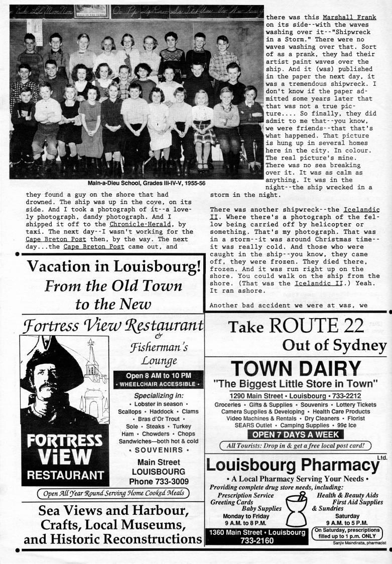 Maln-a-Dieu School, Grades lli-iV-V, 1955-56 they found a guy on the shore that had drowned. The ship was up in the cove, on its side. And I took a photograph of it--a love? ly photograph, dandy photograph. And I shipped it off to the Chronicle-Herald. by taxi. The next day--I wasn't working for the Cape Breton Post then, by the way. The next day...the Cape Breton Post came out, and Vacation in Louisbourg! Front the Old Town to the New fortress Vizw 'staurantl FORTRESS ViEW RESTAURANT 'is Herman s Lounge Open 8 AM to 10 PM • WHEELCHAIR ACCESSIBLE • Specializing in: • Lobster in season • Scallops • Haddocl( • Clams • Bras d'Or Trout • Sole • Stealcs • Turlcey Ham • Chowders • Chops Sandwiches • both hot & cold . SOUVENIRS • Main Street LOUISBOURG Phone 733-3009 there was this Marshall Frank on its side--with the waves washing over it--"Shipwreck in a Storm." There were no waves washing over that. Sort of as a prank, they had their artist paint waves over the ship. And it (was) published in the paper the next day, it was a tremendous shipwreck. I don't know if the paper ad? mitted some years later that that was not a true pic? ture.... So finally, they did admit to me that--you know, we were friends--that that's what happened. That picture is hung up in several homes here in the city. In colour. The real picture's mine. There was no sea breaking over it. It was as calm as anything. It was in the night--the ship wrecked in a storm in the night. There was another shipwreck--the Icelandic XI. Where there's a photograph of the fel? low being carried off by helicopter or something. That's my photograph. That was in a storm--it was around Christmas time-- it was really cold. And those who were caught in the ship--you know, they came off, they were frozen. They died there, frozen. And it was run right up on the shore. You could walk on the ship from the shore. (That was the Icelandic II.) Yeah. It ran ashore. Another bad accident we were at was, we Take ROUTE 22 Out of Sydney ( OpenSAffytar'gundStrving'otmCooi'd9'tQfs) Sea Views and Harbour, Crafts, Local Museums, and Historic Reconstructions TOWN DAIRY "The Biggest Littie Store in Town" 1290 Main Street?? Louisbourg ??733-2212 Groceries • Gifts & Supplies • Souvenirs • Lottery Ticl