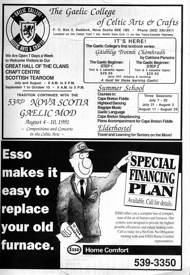 Published by Ronald Caplan on 1991/8/1 (135 reads)'de Qadic Cotkgt of Cdtic Arts & Crafts P. O. Box 9, Baddeck, Nova Scotia BOE 1B0 • Phone (902) 295-3411 Located on the Cabot Trail 1 km. North from Exit 11 on the Trans-Canada Highway We Are Open 7 Days a Week to Welcome Visitors to Our GREAT HALL OF THE CLANS CRAFT CENTRE SCOTTISH TEAROOM July and August • 8 A.M. to 8 P.IVI. September 1 to October 15 • 9 A.M. to 5 P.M. TRADITION CONTINUES WITH THE August 4 -10,1991 ~ Competitions and Concerts in the Cdtic fAxts ~ IT'S HERE! The Gaelic College's first textbook series: QaidfiCig nsoimH Cfibmhradh by Catriona Parsons The Gaelic Beginner: The Gaelic Beginner: STEP1 STEP 2 Text & 3 cassette tapes: Text & 3 cassette tapes: $29.95 $29.95 (plus GST, shipping & handling) A must for those learning Gaelic! Summer ScfiooC Three Sessions: July 7 - 20 July 21 - August 2 August 11 - August 24 Courses in: Cape Breton Fiddle Highland Dancing Bagpipe Music Gaelic Language Cape Breton Stepdancing Piano Accompaniment for Cape Breton Fiddle T'idtrhostd Travel and Learning for Seniors on the Move! '' '<' srecHL WVCBVG ttaiv Available. CalJ for details. ESSO offers you a complete line of compact, state of the art oil bumers and fumaces. Our systems were designed to provide the highest possible efficiencies and reduce heating costs. Call us today for a No-Cost, No-Obligation meeting with your ESSO Home Comfort representative. Home Comfort 539-3350