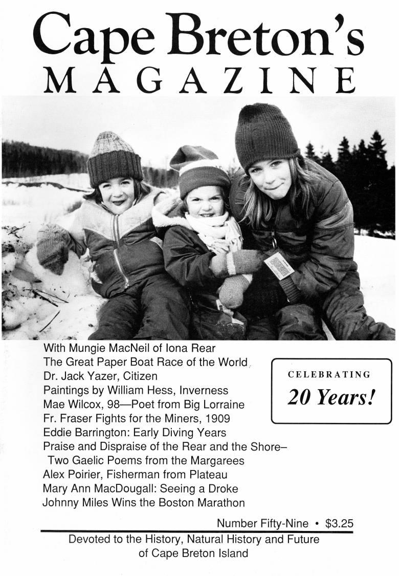 With Mungie MacNeil of lona Rear • The Great Paper Boat Race of the World • Dr. Jack Yazer, Citizen • Paintings by William Hess, Inverness • Mae Wilcox, 98 • Poet from Big Lorraine • Fr. Fraser Fights for the Miners, 1909 • Eddie Barrington: Early Diving Years • Praise and Dispraise of the Rear and the Shore • Two Gaelic Poems from the Margarees • Alex Poirier, Fisherman from Plateau • Mary Ann MacDougall: Seeing a Droke • Johnny Miles Wins the Boston Marathon