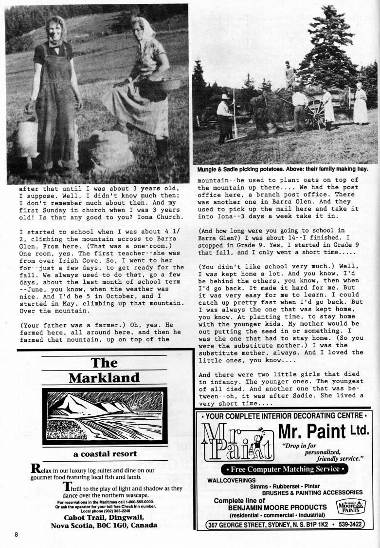 Published by Ronald Caplan on 1992/1/1 (362 reads)after that until I was about 3 years old, I suppose. Well, I didn't know much then; I don't remember much about then. And my first Sunday in church when I was 3 years old! Is that any good to you? lona Church. I started to school when I was about 4 1/ 2, climbing the mountain across to Barra Glen. From here. (That was a one-room.) One room, yes. The first teacher--she was from over Irish Cove. So, I went to her for--just a few days, to get ready for the fall. We always used to do that, go a few days, about the last month of school term --June, you know, when the weather was nice. And I'd be 5 in October, and I started in May, climbing up that mountain. Over the mountain. (Your father was a farmer.) Oh, yes. He farmed here, all around here, and then he farmed that mountain, up on top of the The Markland a coastal resort Rel Lelax in our luxury log suites and dine on our gourmet food featuring local fish and lamb. Jlhrill to the play of light and shadow as they dance over the northern seascape. For reservations in the lUlaritimes call 1-800.565-0000. Or ask the operator for your toll free Check Inn numt>er. Local phone (902) 383-2246 Cabot Trail, Dingwall, Nova Scotia, BOC IGO, Canada Mungie & Sadie piciting potatoes. Above: their family malting hay. mountain--he used to plant oats on top of the mountain up there.... We had the post office here, a branch post office. There was another one in Barra Glen. And they used to pick up the mail here and take it into lona--3 days a week take it in. (And how long were you going to school in Barra Glen?) I was about 14--I finished. I stopped in Grade 9. Yes, I started in Grade 9 that fall, and I only went a short time (You didn't like school very much.) Well, I was kept home a lot. And you know, I'd be behind the others, you know, then when I'd go back. It made it hard for me. But it was very easy for me to learn. I could catch up pretty fast when I'd go back. But I was always the one that was kept home, you know. At planting time, to stay home with the younger kids. My mother would be out putting the seed in or something. I was the one that had to stay home. (So you were the substitute mother.) I was the substitute mother, always. And I loved the little ones, you know.... And there were two little girls that died in infancy. The younger ones. The youngest of all died. And another one that was be? tween- -oh, it was after Sadie. She lived a very short time.... . YOUR COMPLETE INTERIOR DECORATING CENTRE • Mr. Paint Ltd. **Dropinfor personalized, friendly service." • Free Computer Matching Service WALLCOVERINGS Simms - Rubberset - Pintar BRUSHES & PAINTING ACCESSORIES Complete line of r''TZZ' BENJAMIN MOORE PRODUCTS re''W (residential • commercial • industrial) (367 GEORGE STREET, SYDNEY, N. 8. B1P1K2 ? 539-3422)