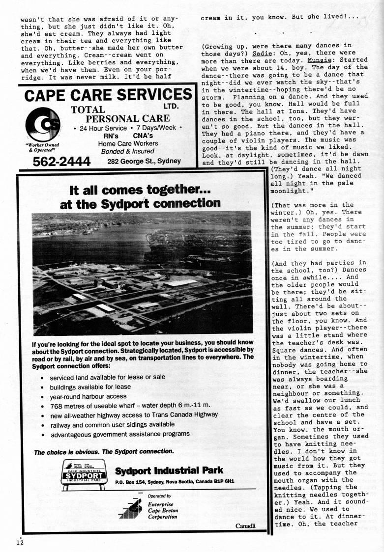 Published by Ronald Caplan on 1992/1/1 (278 reads)wasn't that she was afraid of it or any? thing, but she just didn't like it. Oh, she'd eat cream. They always had light cream in their tea and everything like that. Oh, butter--she made her own butter and everything. Gream--cream went on everything. Like berries and everything, when we'd have them. Even on your por? ridge. It was never milk. It'd be half CAPE CARE SERVICES ? TOTAL LTD. PERSONAL CARE • 24 Hour Service • 7 DaysA/Veek "V/orker Owned & Operated" 562-2444 RN'S CNA'S Home Care Workers Bonded & Insured 282 George St., Sydney It all comes together... at the Sydport connection cream in it, you know. But she lived!. (Growing up, were there many dances in those days?) Sadie: Oh, yes, there were more than there are today. Mungie; Started when we were about 14, boy. The day of the dance--there was going to be a dance that night--did we ever watch the sky--that's in the wintertime--hoping there'd be no storm. Planning on a dance. And they used to be good, you know. Hall would be full in there. The hall at lona. They'd have dances in the school, too, but they wer? en't so good. But the dances in the hall. They had a piano there, and they'd have a couple of violin players. The music was good--it's the kind of music we liked. Look, at daylight, sometimes, it'd be dawn and they'd still be dancing in the hall. (They'd dance all night long.) Yeah. "We danced all night in the pale moonlight." If you're looking for the Ideal spot to locate your business, you should know about the Sydport connection. Strategically located, Sydport is accessible by road or by rail, by air and by sea, on transportation lines to everywhere. The Sydport connection offers: • serviced land available for lease or sale • buildings available for lease • year-round harbour access • 768 metres of useable wharf - water depth 6 m.-ll m. • new all-weather highway access to Trans Canada Highway • railway and common user sidings available • advantageous government assistance programs The choice Is obvious. The Sydport connection. Sydport Industrial Park P.O. Box 154, Sydney, Nova Scotia, Canada BIP 6H1 MUi Operated by ji?f Enterprise • ?r Cape Breton mw Corporation (That was more in the winter.) Oh, yes. There weren't any dances in the summer; they'd start in the fall. People were too tired to go to danc? es in the summer. (And they had parties in the school, too?) Dances once in awhile.... And the older people would be there; they'd be sit? ting all around the wall. There'd be about-- just about two sets on the floor, you know. And the violin player--there was a little stand where the teacher's desk was. Square dances. And often in the wintertime, when nobody was going home to dinner, the teacher--she was always boarding near, or she was a neighbour or something. We'd swallow our lunch as fast as we could, and clear the centre of the school and have a set. You know, the mouth or? gan. Sometimes they used to have knitting nee? dles. I don't know in the world how they got music from it. But they used to accompany the mouth organ with the needles. (Tapping the knitting needles togeth? er.) Yeah. And it sound? ed nice. We used to dance to it. At dinner? time. Oh, the teacher