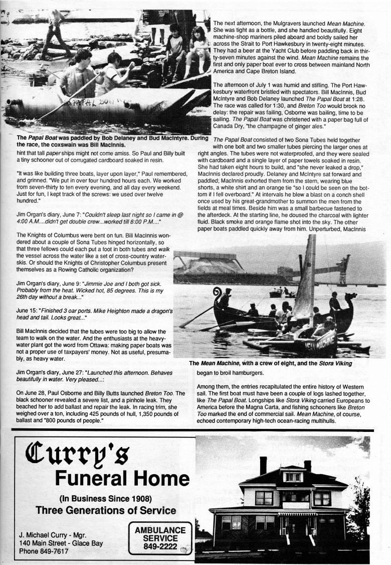 Published by Ronald Caplan on 1992/1/1 (339 reads)The Papal Boaf was paddled by Bob Delaney and Bud Maclntyre. the race, the coxswain was Bill Maclnnis. hint that tall paper ships might not come amiss. So Paul and Billy built a tiny schooner out of corrugated cardboard soaked in resin. "It was like building three boats, layer upon layer," Paul remembered, and grinned. "Ne put in over four hundred hours each. We worked from seven-thirty to ten every evening, and all day every weekend. Just for fun, I kept track of the screws: we used over twelve hundred." Jim Organ's diary, June 7: "Couldn't sleep last night so I came in @ 4:00 A.M....didn't get double crew...worked till 8:00 P.M...." The Knights of Columbus were bent on fun. Bill Maclnnis won? dered about a couple of Sona Tubes hinged horizontally, so that three fellows could each put a foot in both tubes and walk the vessel across the water like a set of cross-country water- skis. Or should the Knights of Christopher Columbus present themselves as a Rowing Catholic organization? Jim Organ's diary, June 9: "Jimmie Joe and I both got sick. Probably from the heat. Wicked hot, 85 degrees. This is my 26th day without a break..." June 15: "Finished 3 oar ports. Mike Heighten made a dragon's head and tail. Looks great..." Bill Maclnnis decided that the tubes were too big to allow the team to walk on the water. And the enthusiasts at the heavy- water plant got the word from Ottawa: making paper tx)ats was not a proper use of taxpayers' money. Not as useful, presuma? bly, as heavy water. Jim Organ's diary, June 27: "Launched this afternoon. Behaves beautifully in water. Very pleased...: On June 28, Paul Osborne and Billy Butts launched Breton Too. The black schooner revealed a severe list, and a pinhole leak. They beached her to add ballast and repair the leak. In racing trim, she weighed over a ton, including 425 pounds of hull, 1,350 pounds of ballast and "800 pounds of people." The next afternoon, the Mulgravers launched Mean Machine. She was tight as a bottle, and she handled beautifully. Eight machine-shop mariners piled aboard and boldly sailed her across the Strait to Port Hawkesbury in twenty-eight minutes. They had a beer at the Yacht Club before paddling back in thir? ty-seven minutes against the wind. Mean Machine remains the first and only paper boat ever to cross between mainland North America and Cape Breton Island. The afternoon of July 1 was humid and stifling. The Port Haw? kesbury waterfront bristled with spectators. Bill Maclnnis, Bud Mclntyre and Bob Delaney launched The Papal Boat at 1:28. The race was called for 1:30, and Breton Too would brook no delay: the repair was failing, Osborne was bailing, time to be sailing. The Papal Boat was christened with a paper bag full of Canada Dry, "the champagne of ginger ales." During jhe Papal Boat consisted of two Sona Tubes held together with one bolt and two smaller tubes piercing the larger ones at right angles. The tubes were not waterproofed, and they were sealed with cardboard and a single layer of paper towels soaked in resin. She had taken eight hours to build, and "she never leaked a drop," Maclnnis declared proudly. Delaney and Mclntyre sat fonward and paddled; Maclnnis exhorted them from the stern, wearing blue shorts, a white shirt and an orange tie "so I could be seen on the bot? tom if I fell overboard." At intervals he blew a blast on a conch shell once used by his great-grandmother to summon the men from the fields at meal times. Beside him was a small barbecue fastened to the afterdeck. At the starting line, he doused the charcoal with lighter fluid. Black smoke and orange flame shot into the sky. The other paper boats paddled quickly away from him. Unperturbed, Maclnnis The Mean Machine, with a crew of eight, and the Stora Viking began to broil hamburgers. Among them, the entries recapitulated the entire history of Western sail. The first boat must have been a couple of logs lashed together, like The Papal Boat. Longships like Stora W/c/np carried Europeans to America before the Magna Carta, and fishing schooners like Breton Too marked the end of commercial sail. Mean Machine, of course, echoed contemporary high-tech ocean-racing multihulls. tuvvfs Funeral Home (In Business Since 1908) Three Generations of Service J. Michael Curry - Mgr. 140 Main Street - Glace Bay Phone 849-7617 AMBULANCE SERVICE 849-2222 .