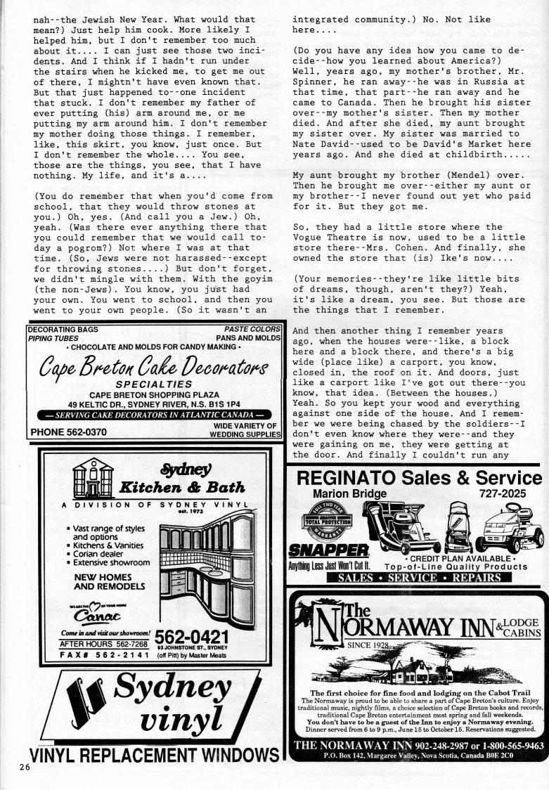 Published by Ronald Caplan on 1992/1/1 (409 reads)nah--the Jewish New Year. What would that mean?) Just help him cook. More likely I helped him, but I don't remember too much about it.... I can just see those two inci? dents. And I think if I hadn't run under the stairs when he kicked me, to get me out of there, I mightn't have even known that. But that just happened to--one incident that stuck. I don't remember my father of ever putting (his) arm around me, or me putting my arm around him. I don't remember my mother doing those things. I remember, like, this skirt, you know, just once. But I don't remember the whole.... You see, those are the things, you see, that I have nothing. My life, and it's a.... (You do remember that when you'd come from school, that they would throw stones at you.) Oh, yes. (And call you a Jew.) Oh, yeah. (Was there ever anything there that ypu could remember that we would call to? day a pogrom?) Not where I was at that time. (So, Jews were not harassed--except for throwing stones....) But don't forget, we didn't mingle with them. With the goyim (the non-Jews). You know, you just had your own. You went to school, and then you went to your own people. (So it wasn't an DECORATING BAGS PIPING TUBES PASTE COLORS PANS AND MOLDS • CHOCOLATE AND MOLDS FOR CANDY MAKING • ' SPECIALTIES CAPE BRETON SHOPPING PLAZA 49 KELTIC DR., SYDNEY RIVER, N.S. B1S 1P4 - SERVING CAKE DECORATORS IN ATLANTIC CANADA • PHONE 562-0370 WIDE VARIETY OF WEDDING SUPPLIES Q' Sydney} ~ Kitchen & Bath ?? Vast range of styles and options ?? Kitchens & Vanities ?? Corian dealer ?? Extensive showroom NEW HOMES AND REMODELS CecAOC Come in and visit our showroom! AFTER HOURS 562-7268 562-0421 S3 JOHNSTONE ST., SYDNEY FAX# 562-2141 (off Pitt) by Master Meats 'Sydney t W vinyl / VINYL REPLACEMENT WINDOWS integrated community.) No. Not like here.... (Do you have any idea how you came to de? cide- -how you learned about America?) Well, years ago, my mother's brother, Mr. Spinner, he ran away--he was in Russia at that time, that part--he ran away and he came to Canada. Then he brought his sister over--my mother's sister. Then my mother died. And after she died, my aunt brought my sister over. My sister was married to Nate David--used to be David's Market here years ago. And she died at childbirth My aunt brought my brother (Mendel) over. Then he brought me over--either my aunt or my brother--! never found out yet who paid for it. But they got me. So, they had a little store where the Vogue Theatre is now, used to be a little store there--Mrs. Cohen. And finally, she owned the store that (is) Ike's now.... (Your memories--they're like little bits of dreams, though, aren't they?) Yeah, it's like a dream, you see. But those are the things that I remember. And then another thing I remember years ago, when the houses were--like, a block here and a block there, and there's a big wide (place like) a carport, you know, closed in, the roof on it. And doors, just like a carport like I've got out there--you know, that idea. (Between the houses.) Yeah. So you kept your wood and everything against one side of the house. And I remem? ber we were being chased by the soldiers--! don't even know where they were--and they were gaining on me, they were getting at the door. And finally I couldn't run any REGINATO Sales & Service Marion Bridge CREDIT PLAN AVAILABLE • AliylllillflLessJilSiWon'lCllllt. Top-ot-Llne Quality Products SALES • SERVICE • REPAIRS rhe NORMAWAY IlMN'gfs SINCE 192&, The first choice for fine food and lodging on the Cabot Trail The Normaway is proud to be able to share a part of Cape Breton's culture. Enjoy traditional music, nightly films, a choice selection of Cape Breton books and records, traditional Cape Breton entertainment most spring and fall weekends. You don't have to be a guest of the Inn to eiyoy a Normaway evening. Dinner served from 6 to 9 p.m., June 15 to October 15. Reservations suggested. THE NORMAWAY INN 902-248-2987 or 1-800-565-9463 P.O. Box 142, Marsaree Vallev, Nova Scotia, Canada BOE 2C0