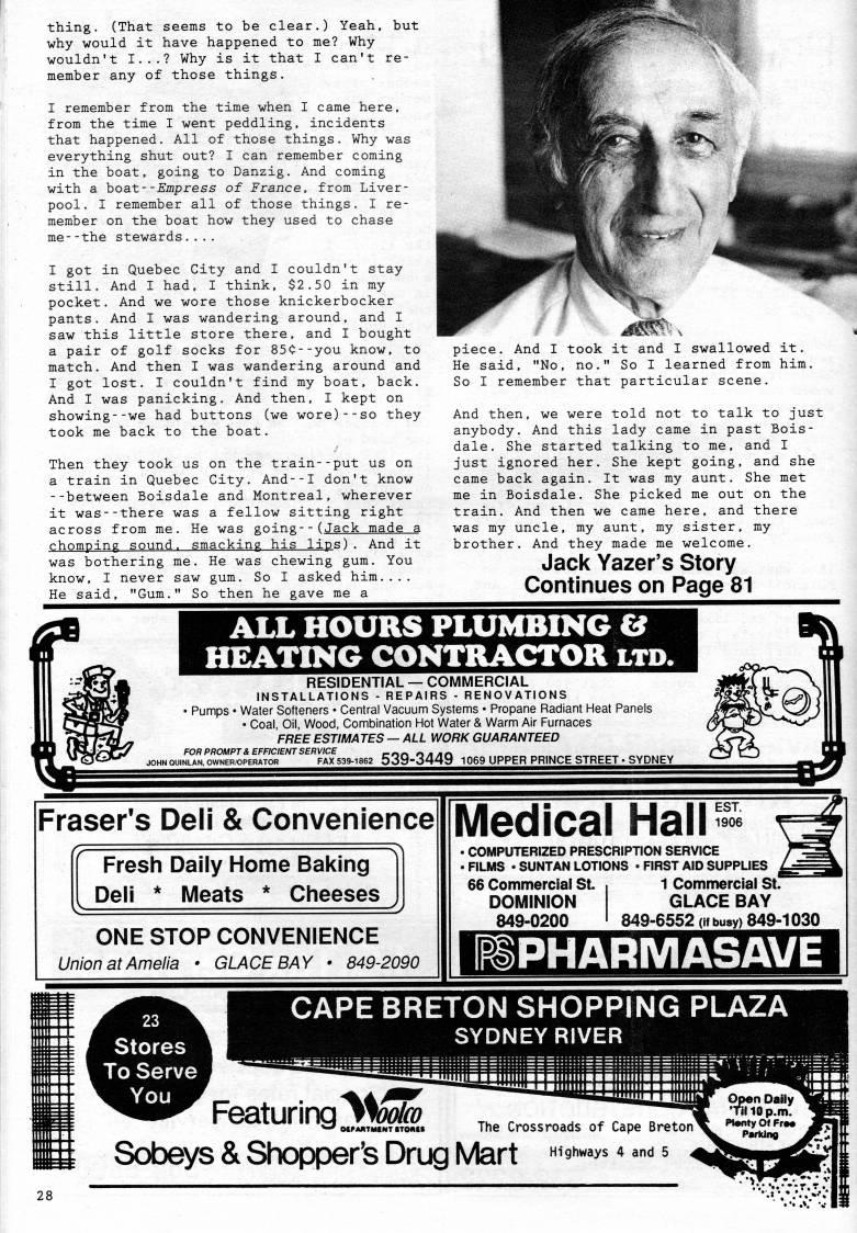 Published by Ronald Caplan on 1992/1/1 (525 reads)thing. (That seems to be clear.) Yeah, but why would it have happened to me? Why wouldn't I...? Why is it that I can't re? member any of those things. I remember from the time when I came here, from the time I went peddling, incidents that happened. All of those things. Why was everything shut out? I can remember coming in the boat, going to Danzig. And coming with a boat--Empress of France, from Liver? pool. I remember all of those things. I re? member on the boat how they used to chase me--the stewards.... I got in Quebec City and I couldn't stay still. And I had, I think, $2.5 0 in my pocket. And we wore those knickerbocker pants. And I was wandering around, and I saw this little store there, and I bought a pair of golf socks for 850--you know, to match. And then I was wandering around and I got lost. I couldn't find my boat, back. And I was panicking. And then, I kept on showing--we had buttons (we wore)--so they took me back to the boat. Then they took us on the train--put us on a train in Quebec City. And--I don't know --between Boisdale and Montreal, wherever it was--there was a fellow sitting right across from me. He was going--(Jack made a chomping sound, smacking his lips). And it was bothering me. He was chewing gum. You know, I never saw gum. So I asked him.... He said, "Gum." So then he gave me a piece. And I took it and I swallowed it. He said, "No, no." So I learned from him. So I remember that particular scene. And then, we were told not to talk to just anybody. And this lady came in past Bois? dale. She started talking to me, and I just ignored her. She kept going, and she came back again. It was my aunt. She met me in Boisdale. She picked me out on the train. And then we came here, and there was my uncle, my aunt, my sister, my brother. And they made me welcome. Jack Yazer's Story Continues on Page 81 ALL HOURS PLUMBING & HEATING CONTRACTOR LTD. RESIDENTIAL • COMMERCIAL INSTALLATIONS - REPAIRS - RENOVATIONS • Pumps • Water Softeners • Central Vacuum Systems • Propane Radiant Heat Panels • Coal, Oil, Wood, Combination Hot Water & Warm Air Furnaces FREE ESTIMATES • ALL WORK GUARANTEED FOR PROMPT & EFFICIENT SERVICE _ ' ' n a An OWNER/OPERATOR FAX539-1862 539-3449 1069 UPPER PRINCE STREET' SYDNEY Fraser's Deli & Convenience (7= Fresh Daily Home Baking Deli * Meats * Cheeses ONE STOP CONVENIENCE Union at Amelia • GLACE BAY • 849-2090 Medical Hall EST. 1906 • COMPUTERIZED PRESCRIPTION SERVICE . FILMS • SUNTAN LOTIONS • FIRST AID SUPPLIES 66 Commercial St. . 1 Commercial St." DOMINION GLACE BAY 849-0200 ' 849-6552 (if busy) 849-1030 PHARMASAVE Stores To Serve You CAPE BRETON SHOPPING PLAZA SYDNEY RIVER U'' Featuring AWfl> MPARTMtNT ITORCt The Crossroads of Cape Breton' Sobeys & ShopfDer's Drug Mart "'9'"''' * '"'?? il 10 p.m. nty Of Fr?* Parking