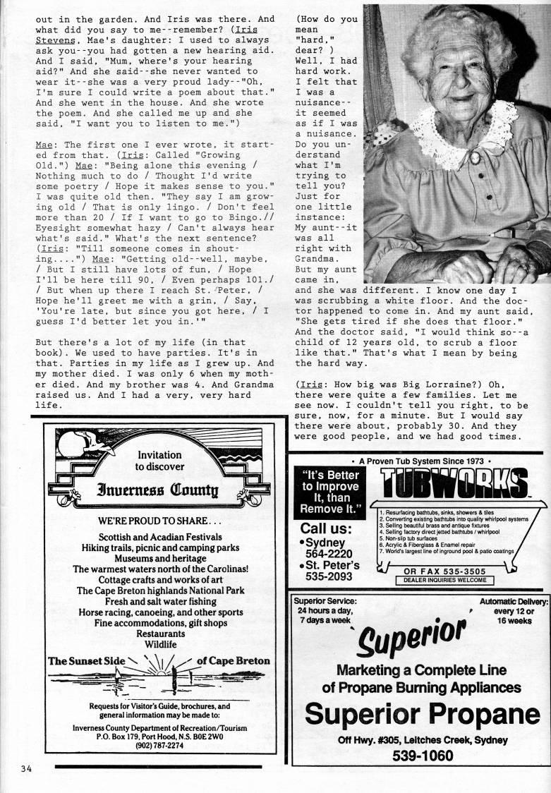 Published by Ronald Caplan on 1992/1/1 (560 reads)out in the garden. And Iris was there. And what did you say to me-- remember? (Iris Stevens. Mae's daughter: I used to always ask you--you had gotten a new hearing aid. And I said, "Mum, where's your hearing aid?" And she said--she never wanted to wear it--she was a very proud lady--"Oh, I'm sure I could write a poem about that." And she went in the house. And she wrote the poem. And she called me up and she said, "I want you to listen to me.") Mae: The first one I ever wrote, it start? ed from that. (Iris: Called "Growing Old.") Mae: "Being alone this evening / Nothing much to do / Thought I'd write some poetry / Hope it makes sense to you." I was quite old then. "They say I am grow? ing old / That is only lingo. / Don't feel more than 20 / If I want to go to Bingo.// Eyesight somewhat hazy / Can't always hear what's said." What's the next sentence? (Iris: "Till someone comes in shout? ing..,.") Mae: "Getting old--well, maybe, / But I still have lots of fun, / Hope I'll be here till 90, / Even perhaps 101./ / But when up there I reach St. -'Peter, / Hope he'll greet me with a grin, / Say, 'You're late, but since you got here, / I guess I'd better let you in.'" But there's a lot of my life (in that book). We used to have parties. It's in that. Parties in my life as I grew up. And my mother died. I was only 6 when my moth? er died. And my brother was 4. And Grandma raised us. And I had a very, very hard life. WE'RE PROUD TO SHARE... Scottish and Acadian Festivals Hiking trails, picnic and camping parks Museums and heritage The warmest waters north of the Carclinas! Cottage crafts and works of art The Cape Breton highlands National Park Fresh and salt water fishing Horse racing, canoeing, and other sports Fine accommodations, gift shops Restaurants Wildlife The Sunset Side ' | /C'" ??' Cape Breton Requests for Visitor's Guide, brochures, and general information may be made to: Inverness County Department of Recreation/Tourism P.O. Box 179. Port Hood, N.S. BOE 2W0 (902)787-2274 (How do you mean "hard," dear? ) Well, I had hard work. I felt that I was a nuisance-- it seemed as if I was a nuisance. Do you un? derstand what I'm trying to tell you? Just for one little instance: My aunt--i"! was all right with Grandma. But my aunt f-:,_ came in, *%" and she was different. I know one day I was scrubbing a white floor. And the doc? tor happened to come in. And my aunt said, "She gets tired if she does that floor." And the doctor said, "I would think so--a child of 12 years old, to scrub a floor like that." That's what I mean by being the hard way. (Iris: How big was Big Lorraine?) Oh, there were quite a few families. Let me see now. I couldn't tell you right, to be sure, now, for a minute. But I would say there were about, probably 30. And they were good people, and we had good times. "It's Better to Improve It, than Remove It." Call us: • Sydney 564-2220 • St. Peter's 535-2093 A Proven Tub System Since 1973 ?? r'mmk 1. Resurfacing bathtubs, sinks, showers & tiles 2. Converting existing bathtubs into quality whirlpool 3. Selling beautiful brass and antique fixtures 4. Selling factory direct jetted bathtubs /whirlpool 5. Non-slip tub surfaces 6. Acrylic & Fiberglass & Enamel repair 7. World's largest line of inground pool & patio coatings U OR FAX 535-3505 I DEALER INQUIRIES WELCOME | Superior Service: 24 hours a day, 7daysaweel( 'perior Automata ISeliveiy: every 12 or Marketing a Complete Line of Propane Burning Appliances Superior Propane Off Hwy. #305, Ultches Creek, Sydney 539-1060