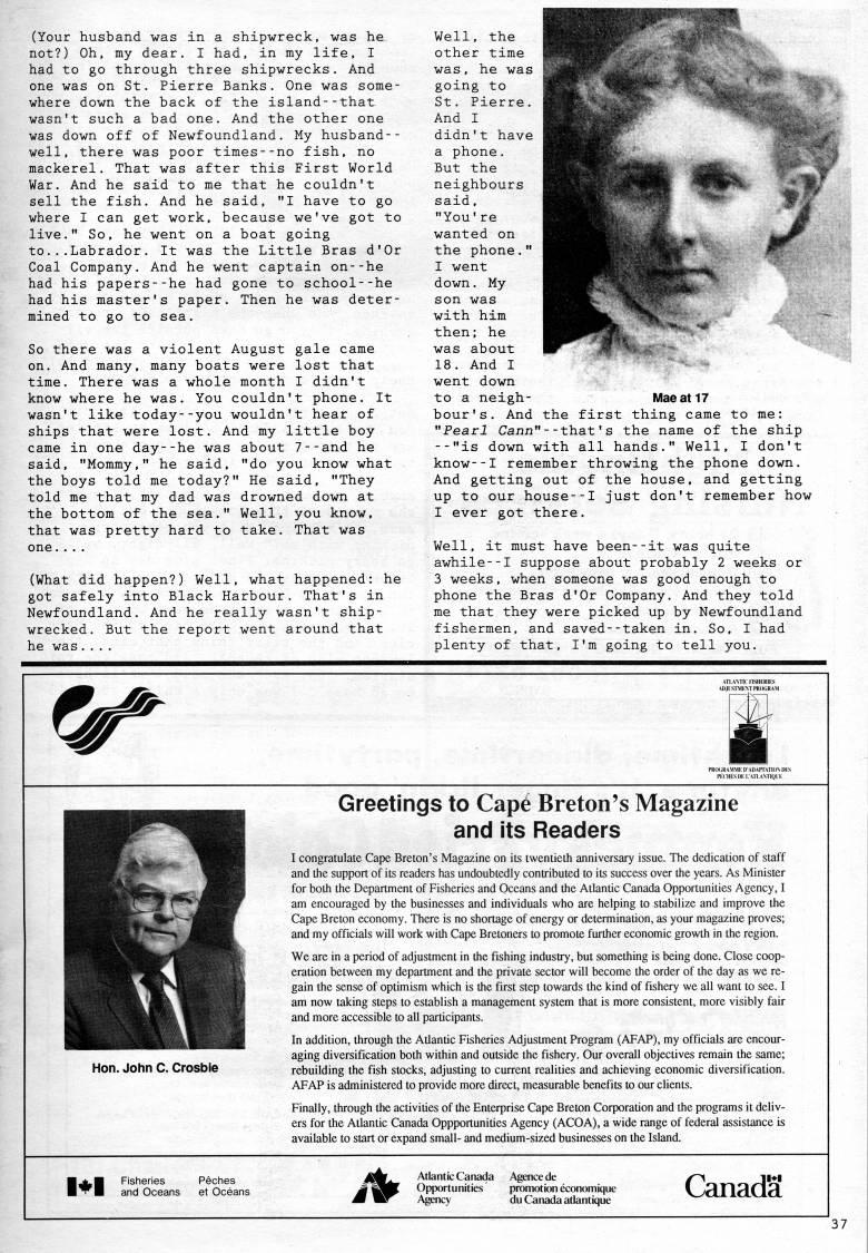 Published by Ronald Caplan on 1992/1/1 (377 reads)(Your husband was in a shipwreck, was he not?) Oh, my dear. I had, in my life, I had to go through three shipwrecks. And one was on St. Pierre Banks. One was some? where down the back of the island--that wasn't such a bad one. And the other one was down off of Newfoundland. My husband-- well, there was poor times--no fish, no mackerel. That was after this First World War. And he said to me that he couldn't sell the fish. And he said, "I have to go where I can get work, because we've got to live." So, he went on a boat going to...Labrador. It was the Little Bras d'Or Coal Company. And he went captain on--he had his papers--he had gone to school--he had his master's paper. Then he was deter? mined to go to sea. So there was a violent August gale came on. And many, many boats were lost that time. There was a whole month I didn't know where he was. You couldn't phone. It wasn't like today--you wouldn't hear of ships that were lost. And my little boy came in one day--he was about 7--and he said, "Mommy," he said, "do you know what the boys told me today?" He said, "They told me that my dad was drowned down at the bottom of the sea." Well, you know, that was pretty hard to take. That was one. . . . (What did happen?) Well, what happened: he got safely into Black Harbour. That's in Newfoundland. And he really wasn't ship? wrecked. But the report went around that he was.... Well, the other time was, he was going to St. Pierre. And I didn't have a phone. But the neighbours said, "You're wanted on the phone." I went down. My son was with him then; he was about 18. And I went down to a neigh- ''or, ??; Mae at 17 hour's. And the first thing came to me: "Pearl Cann"--that's the name of the ship --"is down with all hands." Well, I don't know--I remember throwing the phone down. And getting out of the house, and getting up to our house--I just don't remember how I ever got there. Well, it must have been--it was quite awhile--I suppose about probably 2 weeks or 3 weeks, when someone was good enough to phone the Bras d'Or Company. And they told me that they were picked up by Newfoundland fishermen, and saved--taken in. So, I had plenty of that, I'm going to tell you. Hon. John C. Crosbie Greetings to Cap • J Breton's Magazine and its Readers I congratulate Cape Breton's Magazine on its twentieth anniversary issue. The dedication of staff and the support of its readers has undoubtedly contributed to its success over the years. As Minister for both the Department of Fisheries and Oceans and the Atlantic Canada Opportunities Agency, I am encouraged by the businesses and individuals who are helping to stabilize and improve the Cape Breton economy. There is no shortage of energy or determination, as your magazine proves; and my officials will work with Cape Bretoners to promote further economic growth in the region. We are in a period of adjustment in the fishing industry, but something is being done. Close coop? eration between my department and the private sector will become the order of the day as we re? gain the sense of optimism which is the first step towards the kind of fishery we all want to see. I am now taking steps to establish a management system that is more consistent, more visibly fair and more accessible to all participants. In addition, through the Adantic Fisheries Adjustment Program (AFAP), my officials are encour? aging diversification both within and outside the fishery. Our overall objectives remain the same; rebuilding the fish stocks, adjusting to current realities and achieving economic diversification. AFAP is administered to provide more direct, measurable benefits to our clients. Finally, through the activities of the Enterprise Cape Breton Corporation and the programs it deliv? ers for the Atlantic Canada Oppportunities Agency (ACOA), a wide range of federal assistance is available to start or expand small- and medium-sized businesses on the Island. 1'1 Atlantic Canada Agence de Opportunities promotion economique /'ency du Canada atlantique Canada