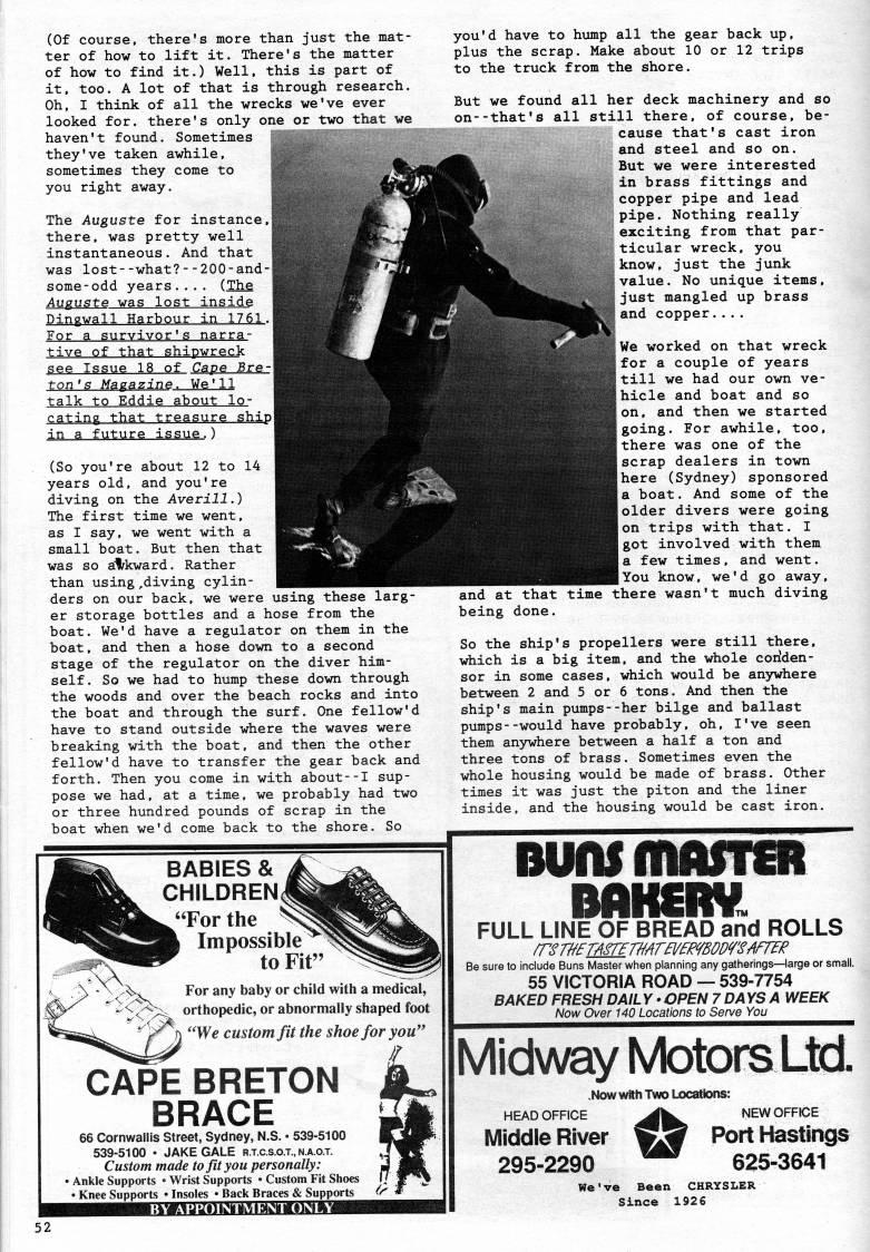 Published by Ronald Caplan on 1992/1/1 (213 reads)(Of course, there's more than just the mat? ter of how to lift it. There's the matter of how to find it.) Well, this is part of it, too. A lot of that is through research. Oh, I think of all the wrecks we've ever looked for. there's only one or two that we haven't found. Sometimes they've taken awhile, sometimes they come to you right away. The Auguste for instance,,' there, was pretty well instantaneous. And that was lost--what?--200-and-j some-odd years.... (The Auguste was lost inside ' Dingwall Harbour in 1761. For a survivor's narra? tive of that shipwreck i see Issue 18 of Cape Bre- talk to Eddie about lo? cating that treasure shipi in a future issue.) (So you're about 12 to 14 years old, and you're diving on the Averill.) The first time we went, as I say, we went with a small boat. But then that was so aH'kward. Rather than using,diving cylin? ders on our back, we were using these larg? er storage bottles and a hose from the boat. We'd have a regulator on them in the boat, and then a hose down to a second stage of the regulator on the diver him? self. So we had to hump these down through the woods and over the beach rocks and into the boat and through the surf. One fellow'd have to stand outside where the waves were breaking with the boat, and then the other fellow'd have to transfer the gear back and forth. Then you come in with about--I sup? pose we had, at a time, we probably had two or three hundred pounds of scrap in the boat when we'd come back to the shore. So you'd have to hump all the gear back up, plus the scrap. Make about 10 or 12 trips to the truck from the shore. But we found all her deck machinery and so on--that's all still there, of course, be? cause that's cast iron and steel and so on. But we were interested in brass fittings and copper pipe and lead pipe. Nothing really exciting from that par? ticular wreck, you know, just the junk value. No unique items, just mangled up brass and copper.... We worked on that wreck for a couple of years till we had our own ve? hicle and boat and so on, and then we started going. For awhile, too, there was one of the scrap dealers in town here (Sydney) sponsored a boat. And some of the older divers were going on trips with that. I got involved with them a few times, and went. You know, we'd go away, and at that time there wasn't much diving being done. So the ship's propellers were still there, which is a big item, and the whole coriden- sor in some cases, which would be anywhere between 2 and 5 or 6 tons. And then the ship's main pumps--her bilge and ballast pumps--would have probably, oh, I've seen them an3rwhere between a half a ton and three tons of brass. Sometimes even the whole housing would be made of brass. Other times it was just the piton and the liner inside, and the housing would be cast iron. BABIES & CHILDREN, "For the Impossible to Fit' For any baby or child with a medical, orthopedic, or abnormally shaped foot ''We custom fit the shoe for you" CAPE BRETON BRACE 66 Cornwallis Street, Sydney, N.S. • 539-5100 539-5100 • JAKE GALE r.t.c.s.o.t.,na.o.t. Custom made to fit you personally: • Ankle Supports • Wrist Supports • Custom Fit Shoes • Knee Supports • Insoles • Back Braces & Supports ''' BY APPOINTMENT ONLY FULL LINE OF BREAD and ROLLS rrsTKiMHrmrmmoDrsmiER Be sure to include Buns Master when planning any gatherings • large or small. 55 VICTORIA ROAD • 539-7754 BAKED FRESH DAIL Y • OPEN 7 DAYS A WEEK Now Over 140 Locations to Sen/e You MiclA/ay Motors Ltd .Now With Two Ljocations: HEAD OFFICE '' NEW OFFICE Middle River wS Port Hastings 295-2290 '"' 625-3641 We've Been CHRYSLER Since 192 6