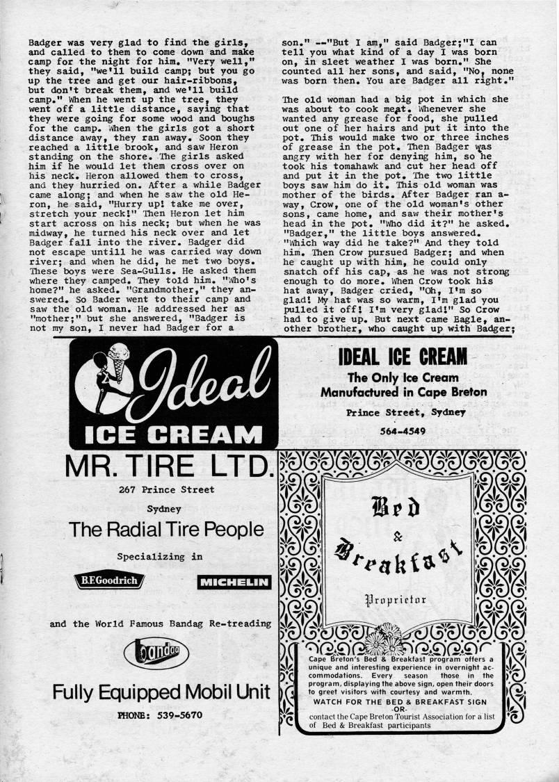 Published by Ronald Caplan on 1976/6/1 (340 reads)Badger was very glad to find the girls, and called to them to come down and make camp for the night for him. "Very well," they said, "we'll build camp; but you go up the tree and get our hair-ribbons, but don't break them, and we'll build camp." When he went up the tree, they went off a little distance, saying that they were going for some wood and boughs for the camp. When the girls got a short distance away, they ran away. Soon they reached a little brook, and saw Heron standing on the shore. The girls asked him if he would let them cross over on his neck. Heron allowed them to cross, and they hurried on. After a while Badger came along; and when he saw the old He? ron, he said, "Hurry upI take me over, stretch your neckI" Then Heron let him start across on his neck; but when he was midway, he turned his neck over and let Badger fall into the river. Badger did not escape untill he was carried way down river; and when he did, he met two boys. These boys were Sea-Gulls. He asked them where they camped. They told hira. "Who's home?" he asked. "Grandmother," they an? swered. So Bader went to their camp and saw the old woman. He addressed her as "mother;" but she answered, "Badger is not ray son, I never had Badger for a son." • "But I am," said Badger;"I can tell you what kind of a day I was born on, in sleet weather I was born." She counted all her sons, and said, "NOj none was born then. You are Badger all right." Ihe old Mfoman had a big pot in which she was about to cook me't. Whenever she wanted any grease for food, she pulled out one of her hairs and put it into the pot. This would make two or three inches of grease in the pot. Then Badger ''as angry with her for denying him, so he took his tomahawk and cut her head off and put it in the pot. The two little boys saw him do it. This old woman was mother of the birds. After Badger ran a- way. Crow, one of the old woman's other sons, came home, and saw their mother's head in the pot. " 'lho did it?" he asked. "Badger," the little boys answered. "Which way did he take?" And they told him. Then Crow pursued Badger; and when he caught up with him, he could only snatch off his cap, as he was not strong enough to do more. When Crow took his hat away. Badger cried, "Oh, I'm so glad* My hat was so warm, I'm glad you pulled it offt I'm very gladl" So Crow had to give up. But next came Eagle, an? other brother, who caught up with Badger; IDEAL ICE CREAM The Only Ice Cream Manufactured in Cape Breton Prince Street, Sydney 564-4549 MR. TIRE LTD. 267 Prince Street Sydney The Radial Tire People specializing in • ?'" • "l'"!'' and the World Famous Bandag Re-treading Fully Equipped Mobil Unit PHONE: 539-5670 |)'(I'''Q..QG /| Cape Breton's E h ast program offers a iV'i Cape Breton's Bed & Breakfast progi unique and interesting experience in overnight ac? commodations. Every season those in the program, displaying the above sign, open their doors to greet visitors with courtesy and warmth. WATCH FOR THE BED & BREAKFAST SIGN -OR- contact the Cape Breton Tourist Association for a list ''of Bed & Breakfast participants