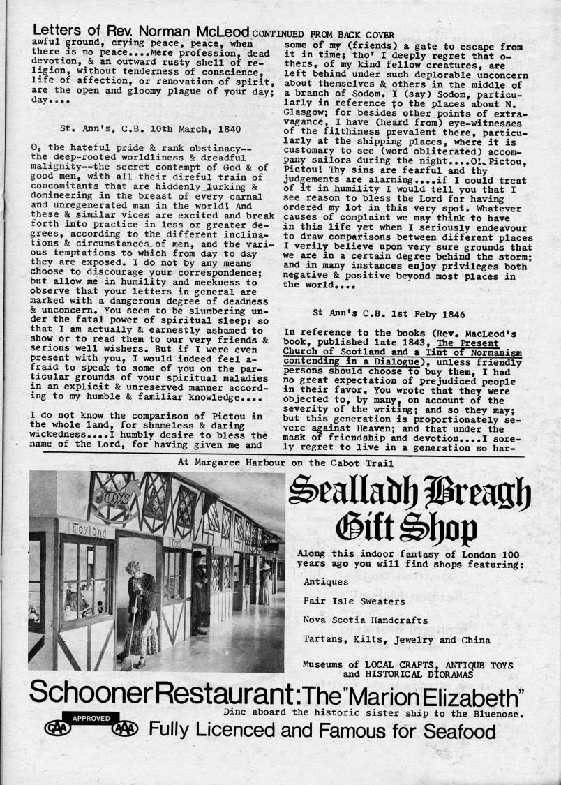 Published by Ronald Caplan on 1976/6/1 (348 reads)Letters of Rev. Norman McLeod continued from back cover awful ground, crying peace, peace, when some of my (friends) a gate to escape from there is no peace....Mere profession, dead it in time? tho' I deeply regret that o- devotion, & an outward rusty shell of re- thers, of ray kind fellow creatures, are ligion, without tenderness of conscience, left behind under such deplorable unconcern life of affection, or renovation of spirit, about themselves & others in the middle of are the open and gloomy plague of your day; a branch of Sodom. 1 (say) Sodom, particu- day. St. Ann's, C.B. lOth March, 1840 0, the hateful pride & rank obstinacy • the deep-rooted worldliness & dreadful malignity • the secret contempt of God & of good men, with all their direful train of concomitants that are hiddenly lurking & domineering in the breast of every carnal and unregenerated man in the worldI And larly in reference 'o the places about N. Glasgow; for besides other points of extra? vagance, I have (heard from) eye-witnesses of the filthiness prevalent there, particu? larly at the shipping places, where it is customary to see (word obliterated) accom? pany sailors during the night....OU Pictou, PictouJ Thy sins are fearful and thy judgements are alarming....if I could treat of it in humility I would tell you that I see reason to bless the Lord for having ordered my lot in this very spot. Whatever these & similar vices are excited and break causes of complaint we may think to have forth into practice in less or greater de? grees, according to the different inclina? tions & circumstances.of men, and the vari? ous temptations to which from day to day they are exposed. I do not by any means choose to discourage your correspondence; but allow me in humility and meekness to observe that your letters in general are marked with a dangerous degree of deadness & unconcern. You seem to be slumbering un? der the fatal power of spiritual sleep: so that I am actually & earnestly ashamed to show or to read them to our very friends & serious well wishers. But if I were even present with you, I would indeed feel a- fraid to speak to some of you on the par? ticular grounds of your spiritual maladies in an explicit & unreserved manner accord? ing to ray humble & familiar knowledge.... I do not know the comparison of Pictou in the whole land, for shameless & daring wickedness....I humbly desire to bless the name of the Lord, for having given me and in this life yet when I seriously endeavour to draw comparisons between different places I verily believe upon very sure grounds that we are in a certain degree behind the storm; and in many instances enjoy privileges both negative & positive beyond most places in the world.... St Ann's C.B. 1st Feby 1846 In reference to the books (Rev. MacLeod's book, published late 1843, The Present Church of Scotland and a Tint of NorSiism contending in a Dialogue), unless friendly persons should choose to buy them, I had no great expectation of prejudiced people in their favor. You wrote that they were objected to, by many, on account of the severity of the writing; and so they may; but this generation is proportionately se? vere against Heaven; and that under the mask of friendship and devotion..,.! sore? ly regret to live in a generation so har- At Margaree Harbour on the Cabot Trail )eaUai)if)Prms|) Along this indoor fantasy of London 100 years ago you will find shops featuring: Antiques Fair Isle Sweaters Nova Scotia Handcrafts Tartans, Kilts, Jewelry and China 1/ l*'-'irf- J'''m Museums of LOCAL CRAFTS, ANTIQIXB TOYS I ?? I yi'?- -'''' a''j HISTORICAL DIORAMAS SchoonerRestaurant-.The'MarionEijzabeth" Dine aboard the historic sister ship to the Bluenose. Fully Licenced and Famous for Seafood