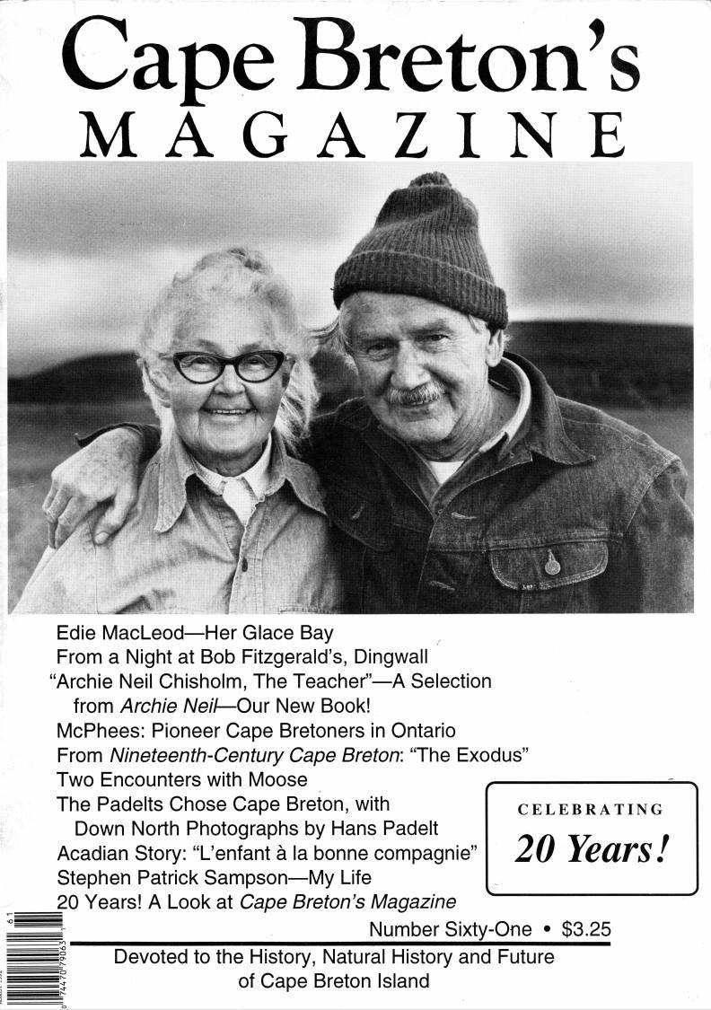 • Edie MacLeod - Her Glace Bay • From a Night at Bob Fitzgerald's • "Archie Neil Chisholm, The Teacher" • Advert: Archie Neil: From the Life and Stories of Archie Neil Chisholm or Margaree Forks, Cape Breton • Cape Bretoners Who Went Away: Murdock McPhee in Ontario • "The Exodus"A Selection from stephen J. Hornsby's New Book: Nineteenth-Century Cape Breton: A Historical Geography • Two Encounters with Moose: Clarence Barrett in the Highlands • The Padelts Chose Cape Breton • L'enfant a la bonne compagnie "The Boy Who Was Good Company" • Stephen Patrick Sampson - My Life • 20 Years! A Look at Cape Breton's Magazine