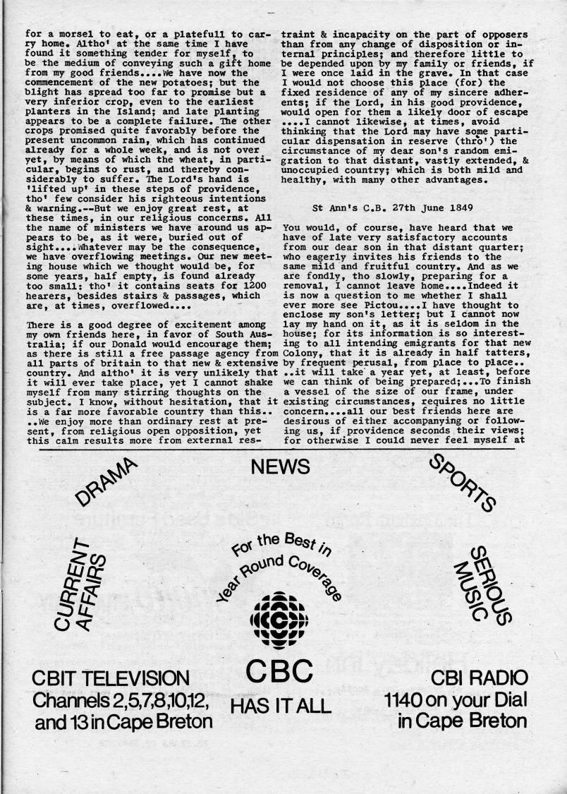 Published by Ronald Caplan on 1976/6/1 (340 reads)for a morsel to eat, or a platefull to car? ry home. Altho' at the same time I have found it something tender for myself, to be the medium of conveying such a gift home from my good friends....we have now the commencement of the new potatoes; but the blight has spread too far to promise but a very inferior crop, even to the earliest planters in the Island; and late planting appears to be a complete failure. The other crops promised quite favorably before the present uncommon rain, which has continued already for a whole week, and is not over yet, by means of which the wheat, in parti? cular, begins to rust, and thereby con? siderably to suffer. Ihe Lord's hand is 'lifted up' in these steps of providence, tho' few consider his righteous intentions & warning. • But we enjoy great rest, at these times, in our religious concerns. All the name of ministers we have around us ap? pears to be, as it were, buried out of sight....iVhatever may be the consequence, we have overflowing meetings. Our new meet? ing house which we thought would be, for some years, half empty, is found already too small: tho' it contains seats for 1200 hearers, besides stairs & passages, which are, at times, overflowed.... There is a good degree of excitement among my own friends here, in favor of South Aus? tralia; if our Donald ivould encourage them; as there is still a free passage agency from all parts of britain to that new & extensive country. And altho' it is very unlikely that it will ever take place, yet I cannot shake myself from many stirring thoughts on the subject. I know, without hesitation, that it is a far more favorable country than this.. ..We enjoy more than ordinary rest at pre? sent, from religious open opposition, yet this calm results more from external res? traint & incapacity on the part of opposers than from any change of disposition or in? ternal principles; and therefore little to be depended upon by my family or friends, if I were once laid in the grave. In that case I would not choose this place (for) the fixed residence of any of my sincere adher? ents; if the Lord, in his good providence, would open for them a likely door of escape ....I cannot likewise, at times, avoid thinking that the Lord may have some parti? cular dispensation in reserve (thro') the circumstance of my dear son's random emi? gration to that distant, vastly extended, & unoccupied country; which is both mild and healthy, with many other advantages. St Ann's C.B. 27th June 1849 You would, of course, have heard that we have of late very satisfactory accounts from our dear son in that distant quarter; who eagerly invites his friends to the same mild and fruitful country. And as we are fondly, tho slowly, preparing for a removal, I cannot leave home....Indeed it is now a question to me whether I shall ever more see Pictou....I have thought to enclose my son's letter; but I cannot now lay my hand on it, as it is seldom in the house; for its information is so interest- ii' to all intending emigrants for that new Colony, that it is already in half tatters, by frequent perusal, from place to place.. ..it will take a year yet, at least, before we can think of being prepared;...To finish a vessel of the size of our frame, under existing circumstances, requires no little concern....all our best friends here are desirous of either accompanying or follow? ing us, if providence seconds their views; for otherwise I could never feel myself at .<''' sJS' NEWS