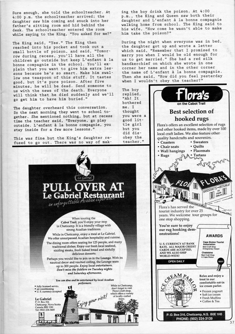 Sure enough, she told the schoolteacher. At 4:00 p.m. the schoolteacher arrived; the daughter saw him coming and snuck into her father's sitting room and hid behind the desk. The schoolteacher entered the room while saying to the King. "You asked for me?" ing the boy drink the poison. At 4:00 p.m., the King and Queen saw both their daughter and L'enfant a la bonne compagnie walking home from school. The King said to his wife, "How come he wasn't able to make him take the poison?" The King said, "Yes." The King then reached into his pocket and took out a small bottle of poison, and said, "Tomor? row during recess, you'll have all the children go outside but keep L'enfant a la bonne compagnie in the school. You'll ex? plain that you want to give him extra les? sons because he's so smart. Make him swal? low one teaspoon of this stuff. It tastes good, but it's pure poison. After five minutes, he will be dead. Send someone to us with the news of the death. Everyone will think that he died suddenly and we'll go get him to have him buried." The daughter overheard this conversation. So the next morning they went to school to? gether. She mentioned nothing, but at recess time the teacher said, "Everyone, go play outside. L'enfant a la bonne compagnie, you stay inside for a few more lessons." This was fine but the King's daughter re? fused to go out. There was no way of mak- During the night when everyone was in bed, the daughter got up and wrote a letter which said, "Remember that I promised to marry you when I would be old enough for us to get married." She had a red silk handkerchief on which she wrote in one corner her name and in the other corner the name of L'enfant a la bonne compagnie. Then she said, "How did you feel yesterday when I wouldn't obey the teacher?" The boy replied, "Ah! It bothered me. I thought you were a good lit? tle girl but you did dis? obey the teacher." PULL OVER AT Le Gabriel Restaurant! When touring the Cabot Trail, you'll enjoy your stop in Cheticamp. It is a friendly village with strong Acadian traditions. While in Cheticamp, enjoy a meal at Le Gabriel. We offer unsurpassed Acadian hospitality and cuisine. The dining room offers seating for 125 people, and many traditional dishes. Enjoy our fresh local seafood, sizzling steaks, fresh baked bread and sinfully delicious desserts. Perhaps you would like to join us in the Lounge. With its nautical decor and vaulted ceiling, the Lounge seats up to 300 people. Enjoy local entertainers. Don't miss the fiddlers on Tuesday nights and Saturday afternoons. You can dine and be entertained by local Acadian While in Cheticamp, don't forget to visit Flora's craft shop, which offers a variety of locally crafted • fully licensed • air conditioning • U. S. currency accepted Le Gabriel p. O. Box 316 Cheticamp, Nova Scotia Canada BOE IHO Tel: (902) 224-3685 fbrafs on the Cabot Trail Best selection of hooked rugs Flora's offers an excellent selection of rugs and other hooked items, made by over 100 local craft ladies. We also feature other quality handcrafts and souvenirs. • Sweaters • Quilts • Placemats Tartans Flora's has served the tourist industry for over 25 years. We welcome tour groups for one stop shopping. You're sure to enjoy /~ our rug hooking dem? onstrations! U. S. CURRENCY AT BANK RATE. ALL MAJOR CREDIT j CARDS ARE ACCEPTED, AND WE ALSO SHIP / Chatelaine WORLD-WIDE! / Best Craft Shop