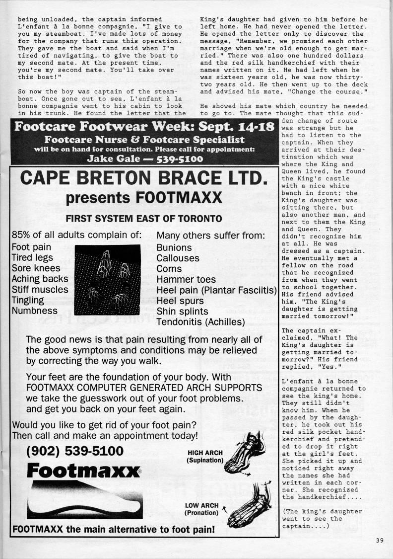 being unloaded, the captain informed L'enfant k la bonne compagnie, "I give to you my steamboat. I've made lots of money for the company that runs this operation. They gave me the boat and said when I'm tired of navigating, to give the boat to my second mate. At the present time, you're my second mate. You'll take over this boat!" So now the boy was captain of the steam? boat. Once gone out to sea, L'enfant a la bonne compagnie went to his cabin to look in his trunk. He found the letter that the King's daughter had given to him before he left home. He had never opened the letter. He opened the letter only to discover the message, "Remember, we promised each other marriage when we're old enough to get mar? ried." There was also one hundred dollars and the red silk handkerchief with their names written on it. He had left when he was sixteen years old, he was now thirty- two years old. He then went up to the deck and advised his mate, "Change the course." Footcare Footwear Week: Sept. 14-18 Footcare Nurse & Footcare Specialist ivill be on hand Sor consultation. Please call for appointment: Jake Gale • 539-5100 CAPE BRETON BRACE LTD. presents FOOTMAXX FIRST SYSTEM EAST OF TORONTO 85% of all adults complain of: Foot pain Tired legs Sore knees Aching backs Stiff muscles Tingling Numbness He showed his mate which country he needed to go to. The mate thought that this sud? den change of route was strange but he had to listen to the captain. When they arrived at their des? tination which was where the King and Queen lived, he found the King's castle with a nice white bench in front; the King's daughter was sitting there, but also another man, and next to them the King and Queen. They didn't recognize him at all. He was dressed as a captain. He eventually met a fellow on the road that he recognized from when they went to school together. His friend advised him, "The King's daughter is getting married tomorrow!" Many others suffer from: Bunions Callouses Corns Hammer toes Heel pain (Plantar Fasciitis) Heel spurs Shin splints Tendonitis (Achilles) The good news is that pain resulting from nearly all of the above symptoms and conditions may be relieved by correcting the way you walk. Your feet are the foundation of your body. With FOOTMAXX COMPUTER GENERATED ARCH SUPPORTS we take the guesswork out of your foot problems, and get you back on your feet again. Would you like to get rid of your foot pain? Then call and make an appointment today! (902) 539-5100 Footmaxx LOW ARCH (Pronation) FOOTMAXX the main alternative to foot pain! The captain ex? claimed, "What! The King's daughter is getting married to? morrow?" His friend replied, "Yes." L'enfant k la bonne compagnie returned to see the king's home. They still didn't know him. When he passed by the daugh? ter, he took out his red silk pocket hand? kerchief and pretend? ed to drop it right at the girl's feet. She picked it up and noticed right away the names she had written in each cor? ner. She recognized the handkerchief..., (The king's daughter went to see the captain....)