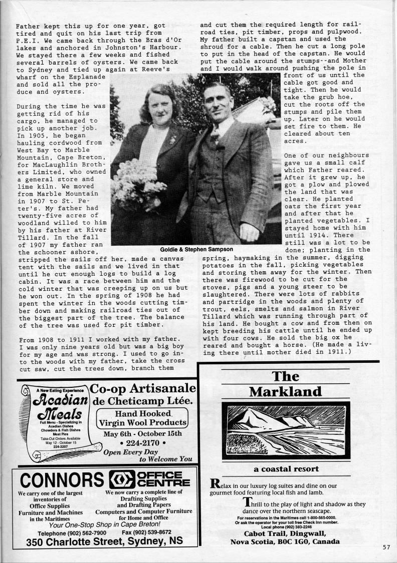 Published by Ronald Caplan on 1992/8/1 (208 reads)Father kept this up for one year, got tired and quit on his last trip from P.E.I. We came back through the Bras d'Or lakes and anchored in Johnston's Harbour. We stayed there a few weeks and fished several barrels of oysters. We came back to Sydney and tied up again at Reeve's wharf on the Esplanade and sold all the pro? duce and oysters. During the time he was getting rid of his cargo, he managed to pick up another job. In 1905, he began hauling cordwood from West Bay to Marble Mountain, Cape Breton, for MacLaughlin Broth? ers Limited, who owned a general store and lime kiln. We moved from Marble Mountain in 1907 to St. Pe? ter's. My father had twenty-five acres of woodland willed to him by his father at River Tillard. In the fall of 1907 my father ran the schooner ashore, stripped the sails off her, made a canvas tent with the sails and we lived in that until he cut enough logs to build a log cabin. It was. a race between him and the cold winter that was creeping up on us but he won out. In the spring of 1908 he had spent the winter in the woods cutting tim? ber down and making railroad ties out of the biggest part of the tree. The balance of the tree was used for pit timber. and cut them the required length for rail? road ties, pit timber, props and pulpwood. My father built a capstan and used the shroud for a cable. Then he cut a long pole to put in the head of the capstan. He would put the cable around the stumps--and Mother and I would walk around pushing the pole in front of us until the cable got good and ' tight. Then he would take the grub hoe, cut the roots off the stumps and pile them up. Later on he would set fire to them. He cleared about ten acres. From 1908 to 1911 I worked with my father. I was only nine years old but was a big boy for my age and was strong. I used to go in? to the woods with my father, take the cross cut saw, cut the trees down, branch them One of our neighbours gave us a small calf which Father reared. After it grew up, he got a plow and plowed the land that was clear. He planted oats the first year and after that he planted vegetables. I stayed home with him until 1914. There still was a lot to be Goldie & Stephen Sampson done; planting in the spring, haymaking in the summer, digging potatoes in the fall, picking vegetables and storing them away for the winter. Then there was firewood to be cut for the stoves, pigs and a young steer to be slaughtered. There were lots of rabbits and partridge in the woods and plenty of trout, eels, smelts and salmon in River Tillard which was running through part of his land. He bought a cow and from then on kept breeding his cattle until he ended up with four cows. He sold the big ox he reared and bought a horse. (He made a liv? ing there until mother died in 1911.) IJlcadian] de cheticamp Ltee Cheats Hand Hooked. Virgin Wool ProductsJ May 6th - October 15th • 224-2170 • Open Every Day to Welcome You CONNORS '8i''?iE We now carry a complete line of Drafting Supplies and Drafting Papers Computers and Computer Furniture for Home and Office Your One-Stop Shop in Cape Breton! Telephone (902) 562-7900 Fax (902) 539-8672 We carry one of the largest inventories of Office Supplies Furniture and Machines in the Maritimes 350 Charlotte Street, Sydney, NS The Markland a coastal resort Rel Welax in our luxury log suites and dine on our gourmet food featuring local fish and lamb. ihrill to the play of light and shadow as they dance over the northern seascape. For reservations in the Maritimes call 1-800-5654)000. Or ask the operator tor your toll free Checl( Inn number. Local phone (902) 383-2246 Cabot Trail, Dingwall, Nova Scotia, BOC IGO, Canada
