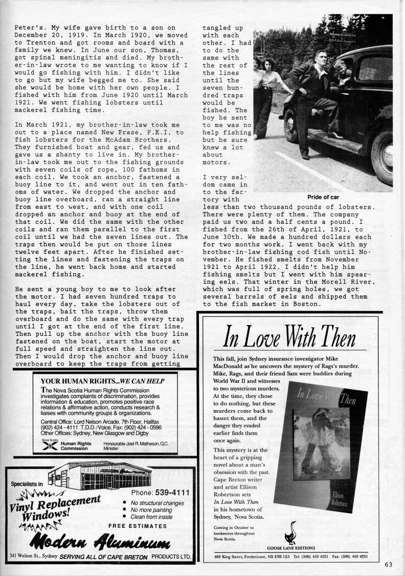 Published by Ronald Caplan on 1992/8/1 (158 reads)Peter's. My wife gave birth to a son on December 20, 1919. In March 1920, we moved to Trenton and got rooms and board with a family we knew. In June our son, Thomas, got spinal meningitis and died. My broth? er-in-law wrote to me wanting to know if I would go fishing with him. I didn't like to go but my wife begged me to. She said she would be home with her own people. I fished with him from June 1920 until March 1921. We went fishing lobsters until mackerel fishing time. In March 1921, my brother-in-law took me out to a place named New Frase, P.E.I, to fish lobsters for the McAdam Brothers. They furnished boat and gear, fed us and gave us a shanty to live in. My brother- in-law took me out to the fishing grounds with seven coils of rope, 100 fathoms in each coil. We took an anchor, fastened a buoy line to it, and went out in ten fath? oms of water. We dropped the anchor and buoy line overboard, ran a straight line from east to west, and with one coil dropped an anchor and buoy at the end of that coil. We did the same with the other coils and ran them parallel to the first coil until we had the seven lines out. The traps then would be put on those lines twelve feet apart. After he finished set? ting the lines and fastening the traps on the line, he went back home and started mackerel fishing. He sent a young boy to me to look after the motor, I had seven hundred traps to haul every day, take the lobsters out of the traps, bait the traps, throw them overboard and do the same with every trap until I got at the end of the first line. Then pull up the anchor with the buoy line fastened on the boat, start the motor at full speed and straighten the line out. Then I would drop the anchor and buoy line overboard to keep the traps from getting YOUR HUMAN RIGHTS...W?? CAN HELP The Nova Scotia Human Rights Commission investigates complaints of discrimination, provides information & education, promotes positive race relations & affirmative action, conducts research & liaises with community groups & organizations. Central Office: Lord Nelson Arcade, 7th Floor, Halifax (902) 424 - 4111 T.D.D. /Voice, Fax: (902) 424 - 0596 Other Offices: Sydney, New Glasgow and Digby >CI Specialists in ''''sJWv/'' -' • "y'' Phone: 539-4111 T/* • ??. ! H'old'''' • No structural changes y''Xz.JJiiicf • No more painting 'irtU'V' • Clean from inside '''/f'J'f'ti' '''' ESTIMATES 4MeM' 'ieutuMum 341 Welton St.. Sy4ney SERVING ALL OF CAPE BRETON PRODUCTS LTD. tangled up with each other. I had to do the same with the rest of the lines until the seven hun? dred traps would be fished. The boy he sent to me was no help fishing but he sure knew a lot about motors. I very sel? dom came in to the fac? tory with less than two thousand pounds of lobsters. There were plenty of them. The company paid us two and a half cents a pound. I fished from the 26th of April, 1921, to June 30th. We made a hundred dollars each for two months work, I went back with my brother-in-law fishing cod fish until No? vember. He fished smelts from November 1921 to April 1922. I didn't help him fishing smelts but I went with him spear? ing eels. That winter in the Morell River, which was full of spring holes, we got several barrels of eels and shipped them to the fish market in Boston. Pride of car In Love Mth Then This fall, join Sydney insurance investigator Mike MacDonald as he uncovers the mystery of Rags's murder. Mike, Rags, and their friend Sam were buddies during World War II and witnesses to two mysterious murders. At the time, they chose to do nothing, but these murders come back to haunt them, and the danger they evaded earlier finds them once again. This mystery is at the heart of a gripping novel about a man's obsession with the past. Cape Breton writer and artist Ellison Robertson sets In Love With Then in his hometown of Sydney, Nova Scotia. Coming in October tc bookstores throughou Nova Scotia. GOOSE LANE EDITIONS 469 King Street, Fredericton, NB ESB 1E5 Tel: (506) 450 4251 Fax: (506) 450 4251