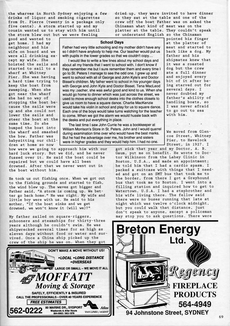 Published by Ronald Caplan on 1992/8/1 (172 reads)the wharves in North Sydney enjoying a few drinks of liquor and smoking cigarettes from St. Pierre (twenty in a package only five cents). A storm started up and my cousin wanted us to stay with him until the storm blew out but we were feeling good and wanted to get home. I had my neighbour and his wife on board and we were all drinking ex? cept my wife. She hoisted the sails and started to sail to a wharf at Whitney Pier. She was having a hard time trying to keep the boat from swamping. When she got near the wharf she had no way of stopping the boat be? cause the sails were up and she could not lower the sails and steer the boat at the same time. So she bumped the boat into the wharf and smashed the bow. Father was babysitting our chil? dren at home so now how were we going to approach him with our hard luck story. But we did, and he never fussed over it. He said the boat could be repaired but we could have all been drowned. After that we never went out in the boat without him. He took us out fishing once. When we got out to the fishing grounds and started to fish, the wind blew up. The waves got bigger and Father said, "A storm is coming up. We bet? ter go back home." He was right. My wife and little boy were with us. He said to his mother, "If the boat sinks and we get drowned, we won't know it (will we)?" My father sailed on square-riggers, schooners and steamships for thirty-three years although he couldn't swim. He was shipwrecked several times for as high as eleven days without food or water and sur? vived. Once a China ship picked up the crew of the ship he was on. When they got School Days Father had very little schooling and my mother didn't have any SO I didn't have anybody to help me. Our teacher would put us with pupils in the lower grades so that we couldn't copy.... I would like to write a few lines about my school days and about all my friends that I went to school with. I don't know if they remember me but I sure remember them and every time I go to St. Peters I manage to see the odd one. I grew up and went to school with all of George and John Kyte's and Doctor Bisset's children. My father went to school in his younger days with George and John Kyte and Doctor Bisset. Tena MacLeod was my laacher, she was awful good and kind to us. When she would go home to dinner which was just across the street, we used to move enough school desks into the clothes closets to give us room to have a square dance. Charlie MacKenzie would take his violin in school and play for us to square dance. Each one of the boys would take turns watching for the teacher to come. When we got the alarm we would hussle back with the desks and put everything in place. The last time I saw John Currie he was a bookkeeper at William Morrison's Store in St. Peters. John and I would quarrel during examination time over who would have the best marks. But he had the advantage over me, his brother and sisters were in higher grades and they would help him. I had no one. dried up, they were invited to have dinner so they sat at the table and one of the crew off the boat Father was on asked the Chinaman what kind of meat was on the platter at the table. They couldn't speak or understand English so the Chinaman pointed his finger at the platter of meat and' started to bark like a dog. My father and his shipmates knew that it was a roasted dog but the crew ate a full dinner and enjoyed every bit of it after be? ing starved out for several days. I never doubted my father's ability of handling boats, so I was never afraid to go out to sea with him. We moved from Glen? coe Street, Whitney Pier, to Havelock Street, in 1927. I got sick that year and my Doctor, A. B. Gaum, put me on benefit. He wrote to Doc? tor Wilkinson from the Lahey Clinic in Boston, U.S.A., and made an appointment; he told him that I had a cardio spasm. I packed a suitcase with things that I need? ed and got on an SMT bus that took me to the border, from there I got a Greyhound bus that took me to Boston. I went into a filling station and inquired how to get to Watertown, U.S.A. I had a stepbrother and his wife living there. The fellow said there were no buses running that late at night which was twelve o'clock midnight, but you could walk that distance, just don't speak to anyone, except a policeman may stop you to ask questions. There were DONT MAKE A MOVE WITHOUT US! ' • LOCAL • LONG DISTANCE • OVERSEAS LARGE OR SMALL - WE MOVE IT ALL _rMOFFATT '"' Moving & Storage SAFELY, EFFICIENTLY & INSURED CALL THE PROFESSIONALS • OVER 40 YEARS EXPERIENCE FREE ESTIMATES 562-0222 80 MARINE DR., SYDPORT Weekends & After Hours 564'4)963/562-1978 '', Atias VAN LINES / AGENT Breton Energy Ltd. FIREPLACE PRODUCTS 564-4949 94 Johnstone Street, SYDNEY