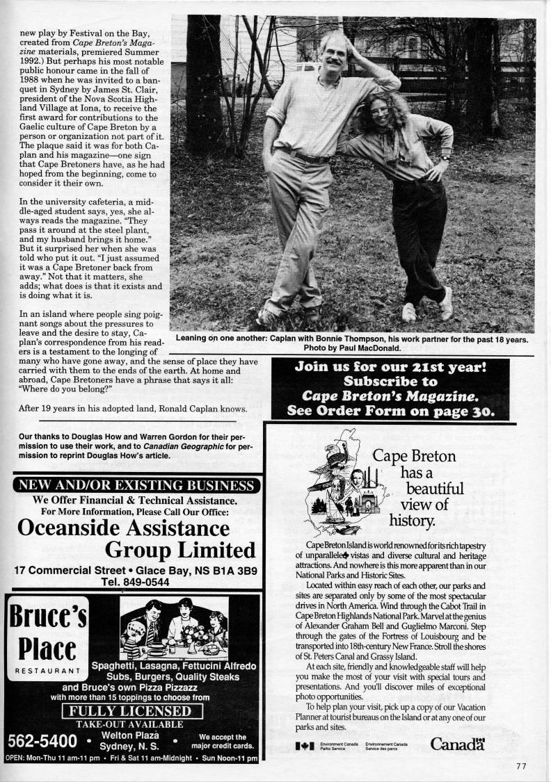 new play by Festival on the Bay, created from Cape Breton's Maga? zine materials, premiered Summer 1992.) But perhaps his most notable public honour came in the fall of 1988 when he was invited to a ban? quet in Sydney by James St. Clair, president of the Nova Scotia High? land Village at lona, to receive the first award for contributions to the Gaelic culture of Cape Breton by a person or organization not part of it. The plaque said it was for both Ca? plan and his magazine • one sign that Cape Bretoners have, as he had hoped from the beginning, come to consider it their own. In the university cafeteria, a mid? dle-aged student says, yes, she al? ways reads the magazine. "They pass it around at the steel plant, and my husband brings it home." But it surprised her when she was told who put it out. "I just assumed it was a Cape Bretoner back from away." Not that it matters, she adds; what does is that it exists and is doing what it is. In an island where people sing poig? nant songs about the pressures to leave and the desire to stay, Ca? plan's correspondence from his read? ers is a testament to the longing of many who have gone away, and the sense of place they have carried with them to the ends of the earth. At home and abroad. Cape Bretoners have a phrase that says it all: "Where do you belong?" After 19 years in his adopted land, Ronald Caplan knows. Our thanks to Douglas How and Warren Gordon for their per? mission to use their work, and to Canadian Geographic ior per? mission to reprint Douglas How's article. Leaning on one another: Caplan with Bonnie Thompson, his work partner for the past 18 years. Photo by Paul MacDonald. Join us ior our 2lst year! Subscribe to Cape Bretones Magazine. See Order Form on page 30. NEW AND/OR EXISTING BUSINESS We Offer Financial & Technical Assistance. For More Information, Please Call Our Office: Oceanside Assistance Group Limited 17 Commercial Street • Giace Bay, NS B1A 3B9 Tei. 849-0544 Bruce'! Place Spaghetti, Lasagna, Fettucini Alfredo Subs, Burgers, Quality Steaks and Bruce's own Pizza Pizzazz with more thanis toppings to choose from FULLY LICENSED TAKE-OUT AVAILABLE ceo C/IAA - Welton Plaza ' we accept the D0Z-04UU • Sydney, N.S. major credit cards. OPEN: Mon-Thu 11 am-11 pm • Fri & Sat 11 am-Midnight • Sun Noon-11 p Cape Breton has a , beautiful view of history. CapeBreton Island is world renowned for its rich tapestry of unparalleled vistas and diverse cultural and heritage attractions. And nowhere is this more apparent than in our National Parks and Historic Sites. Located within easy reach of each other, our parks and sites are separated only by some of the most spectacular drives in North America. Wind tiirough tiie Cabot Trail in Cape Breton Highlands National Park. Marvel at tiie genius of Alexander Graham Bell and Guglielmo Marconi. Step tiirough the gates of the Fortress of Louisbourg and be transported into 18tii-century New France. Stroll tiie shores of St. Peters Canal and Grassy Island. At each site, friendly and knowledgeable staff will help you make the most of your visit with special tours and presentations. And you'll discover miles of exceptional photo opportunities. To help plan your visit, pick up a copy of our Vacation Planner at tourist bureaus on the Island or at any one of our parts and sites. 1'1 int Canada Environr CanadS