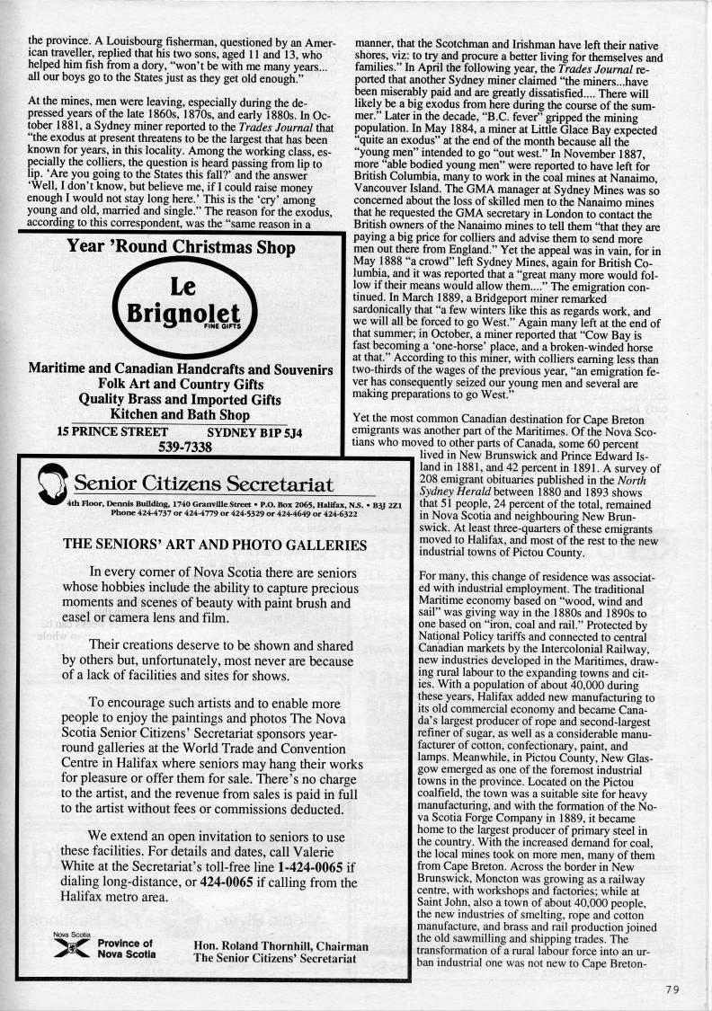the province. A Louisbourg fisherman, questioned by an Amer? ican traveller, replied that his two sons, aged 11 and 13, who helped him fish from a dory, "won't be with me many years... all our boys go to the States just as they get old enough." At the mines, men were leaving, especially during the de? pressed years of the late 1860s, 1870s, and early 1880s. In Oc? tober 1881, a Sydney miner reported to the Trades Journal that "the exodus at present threatens to be the largest that has been known for years, in this locality. Among the working class, es? pecially the colliers, the question is heard passing from lip to lip. 'Are you going to the States this fall?' and the answer 'Well, I don't know, but believe me, if I could raise money enough I would not stay long here.' This is the 'cry' among young and old, married and single." The reason for the exodus, according to this correspondent, was the "same reason in a Year 'Round Christmas Shop Maritime and Canadian Handcrafts and Souvenirs Folk Art and Country Gifts Quality Brass and Imported Gifts Kitchen and Bath Shop 15 PRINCE STREET SYDNEY BIP 5J4 539-7338 ? 't'4 Senior Citizens Secretariat 4th Floor, Dennis BuUding, 1740 Granville Street • P.O. Box 2065, Halifax, N.S. Phone 424-4737 or 424-4779 or 424-5329 or 424-4649 or 424-6322 THE SENIORS' ART AND PHOTO GALLERIES manner, that the Scotchman and Irishman have left their native shores, viz: to try and procure a better living for themselves and families." In April the following year, the Trades Journal re? ported that another Sydney miner claimed "the miners...have been miserably paid and are greatly dissatisfied.... There will likely be a big exodus from here during the course of the sum? mer." Later in the decade, "B.C. fever" gripped the mining population. In May 1884, a miner at Little Glace Bay expected "quite an exodus" at the end of the month because all the "young men" intended to go "out west." In November 1887, more "able bodied young men" were reported to have left for British Columbia, many to work in the coal mines at Nanaimo, Vancouver Island. The GMA manager at Sydney Mines was so concerned about the loss of skilled men to the Nanaimo mines that he requested the GMA secretary in London to contact the British owners of the Nanaimo mines to tell them "that they are paying a big price for colliers and advise them to send more men out there from England." Yet the appeal was in vain, for in May 1888 "a crowd" left Sydney Mines, again for British Co? lumbia, and it was reported that a "great many more would fol? low if their means would allow them...." The emigration con? tinued. In March 1889, a Bridgeport miner remarked sardonically that "a few winters like this as regards work, and we will all be forced to go West." Again many left at the end of that summer; in October, a miner reported that "Cow Bay is fast becoming a 'one-horse' place, and a broken-winded horse at that." According to this miner, with colliers earning less than two-thirds of the wages of the previous year, "an emigration fe? ver has consequently seized our young men and several are making preparations to go West." Yet the most common Canadian destination for Cape Breton emigrants was another part of the Maritimes. Of the Nova Sco? tians who moved to other parts of Canada, some 60 percent lived in New Brunswick and Prince Edward Is? land in 1881, and 42 percent in 1891. A survey of 208 emigrant obituaries published in the North Sydney Herald bewem 1880 and 1893 shows that 51 people, 24 percent of the total, remained in Nova Scotia and neighbouring New Brun? swick. At least three-quarters of these emigrants moved to Halifax, and most of the rest to the new industrial towns of Pictou County. In every comer of Nova Scotia there are seniors whose hobbies include the ability to capture precious moments and scenes of beauty with paint bmsh and easel or camera lens and film. Their creations deserve to be shown and shared by others but, unfortunately, most never are because of a lack of facilities and sites for shows. To encourage such artists and to enable more people to enjoy the paintings and photos The Nova Scotia Senior Citizens' Secretariat sponsors year- round galleries at the World Trade and Convention Centre in Halifax where seniors may hang their works for pleasure or offer them for sale. There's no charge to the artist, and the revenue from sales is paid in full to the artist without fees or commissions deducted. We extend an open invitation to seniors to use these facilities. For details and dates, call Valerie White at the Secretariat's toll-free line 1-424-0065 if dialing long-distance, or 424-0065 if calling from the Halifax metro area. >C Province of Nova Scotia Hon. Roland Thorrihill, Chairman The Senior Citizens' Secretariat For many, this change of residence was associat? ed with industrial employment. The traditional Maritime economy based on "wood, wind and sail" was giving way in the 1880s and 1890s to one based on "iron, coal and rail." Protected by National Policy tariffs and connected to central Canadian markets by the Intercolonial Railway, new industries developed in the Maritimes, draw? ing rural labour to the expanding towns and cit? ies. With a population of about 40,000 during these years, Halifax added new manufacturing to its old commercial economy and became Cana? da's largest producer of rope and second-largest refiner of sugar, as well as a considerable manu? facturer of cotton, confectionary, paint, and lamps. Meanwhile, in Pictou County, New Glas? gow emerged as one of the foremost industrial towns in the province. Located on the Pictou coalfield, the town was a suitable site for heavy manufacturing, and with the formation of the No? va Scotia Forge Company in 1889, it became home to the largest producer of primary steel in the country. With the increased demand for coal, the local mines took on more men, many of them from Cape Breton. Across the border in New Brunswick, Moncto