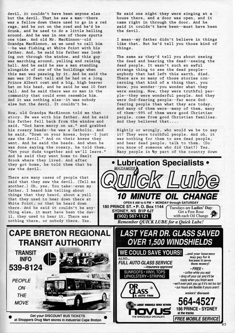 Published by Ronald Caplan on 1992/8/1 (140 reads)devil, it couldn't have been anyone else but the devil. That he saw a man--there was a fellow down there used to go in a red rage, and be out on the road and he'd be drunk, and he used to do a little helling around. And he was in one of those spurts one time. And old Mr. MacKinnon--old Grandpa MacKinnon, as we used to call him --he was fishing at White Point with his father. And, he said his father was look? ing out through the window, and this guy- was marching around, yelling and raising hell. And he said he saw a man standing alongside of one of the buildings when this man was passing by it. And he said the man was 10 feet tall and he had on a long Prince Albert coat and a big, high beaver hat on his head, and he said he was 10 feet tall. And he said there was no man in the community that could even resemble him. And it was nothing else--it was nobody else but the devil. It couldn't be. Now, old Grandpa MacKinnon told me that story. He was with his father. And he said his father fell back from the window and said, "God have mercy on us," and grabbed his rosary beads--he was a Catholic. And he said, "Down on your knees, boys--I just saw the devil." And on their knees they went. And he said the beads. And when he was done saying the rosary, he told them, "Get your duds together and we'll leave." And he said they went home to Smelt Brook where they lived. And after they got -home, he told them that he saw the devil. He said one night they were singing at a house there, and a door was open, and it came right in through the door. And he said it couldn't have been--must have been the devil. I mean--my father didn't believe in things like that. But he'd tell you those kind of things. The same as they'd tell you about seeing the dead and hearing the dead--seeing the dead people. It wasn't such an awful strange thing to see the dead people-- anybody that had left this earth, died. There are so many of those stories con? cerning that kind of a thing that, you know, you wonder--you wonder what they were seeing. Now, they were truthful peo? ple- -they were wonderful people. And they were God-fearing people--far more God? fearing people than what they are today. And many of them were--many of them, many of them--99% of them were good Christian people, come from good Christian families. And they believed that.... Rightly or wrongly, who would we be to say it? They were truthful people. And oh, it was nothing for them to see dead people, and hear dead people, talk to them, (Do you know of someone who did that?) Yes. Many people in fey part of the country down There are many cases of people that said that they saw the devil. (Tell me another.) Oh, yes. You take--even my father, I heard him telling about things that they heard, about a yell that they used to hear down there at White Point, or that he heard down there. And he said it couldn't be any? thing else, it must have been the dev? il, they used to hear it. There was nothing there, or nobody there. Yes. Lubrication Specialists • 10 MINUTE OIL CHANGE OPEN 8 AM to 6 PM • MONDAY through SATURDAY 180 PRINCE ST. • P. O. Box 1144 SYDNEY, NS B1P6J7 Tuesdays are Ladies' Day: Get a Free Rose j' with each Oil Change /F Remember QUICK LUBE for a Quick Lube! CAPE BRETON REGIONAL TRANSIT AUTHORITY TRANSIT INFO 539-8124 PEOPLE ON THE MOVE :", LAST YEAR DR. GLASS SA VED OVER 1,500 WINDSHIELDS WE COULD SAVE YOURS! 0 Get your DISCOUNT BUS TICKETS at Shoppers Drug Mart stores in Industrial Cape Breton ALSO... FULL AUTO GLASS SERVICE • insurance approved issisns i I& AUTO TRIM J ...and your insurance may pay for it because it saves them money! 'FREE* • coffee while you wait • drop off your car and it'll be ready when you finish work we'll even pick you up if it's not too far! • our hours are flexible if yours aren't seniors' discount 564-4527 186 PRINCE. SYDNEY at the tracks THE WINDSHIELD SPECIAUSTS FREE MOBILE SERVICEI