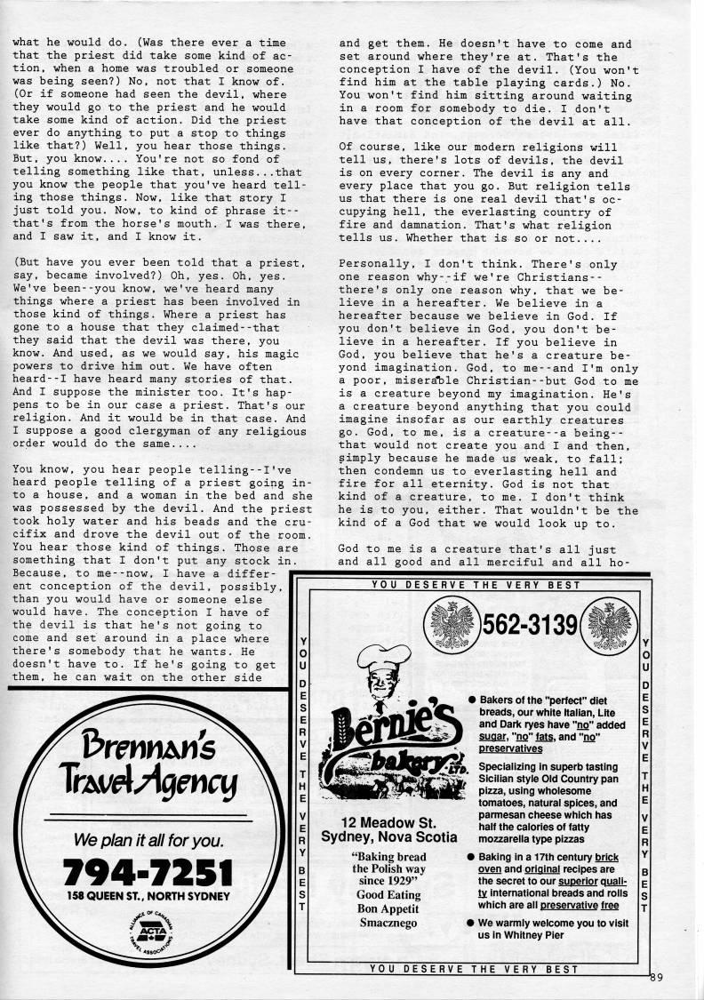 Published by Ronald Caplan on 1992/8/1 (142 reads)what he would do. (Was there ever a time that the priest did take some kind of ac? tion, when a home was troubled or someone was being seen?) No, not that I know of, (Or if someone had seen the devil, where they would go to the priest and he would take some kind of action. Did the priest ever do anything to put a stop to things like that?) Well, you hear those things. But, you know.... You're not so fond of telling something like that, unless...that you know the people that you've heard tell? ing those things. Now, like that story I just told you. Now, to kind of phrase it-- that's from the horse's mouth. I was there, and I saw it, and I know it. and get them. He doesn't have to come and set around where they're at. That's the conception I have of the devil. (You won't find him at the table playing cards.) No, You won't find him sitting around waiting in a room for somebody to die. I don't have that conception of the devil at all. Of course, like our modern religions will tell us, there's lots of devils, the devil is on every corner. The devil is any and every place that you go. But religion tells us that there is one real devil that's oc? cupying hell, the everlasting country of fire and damnation. That's what religion tells us. Whether that is so or not.... (But have you ever been told that a priest, say, became involved?) Oh, yes. Oh, yes. We've been--you know, we've heard many things where a priest has been involved in those kind of things. Where a priest has gone to a house that they claimed--that they said that the devil was there, you know. And used, as we would say, his magic powers to drive him out. We have often heard--I have heard many stories of that. And I suppose the minister too. It's hap? pens to be in our case a priest. That's our religion. And it would be in that case. And I suppose a good clergyman of any religious order would do the same.... You know, you hear people telling--I've heard people telling of a priest going in? to a house, and a woman in the bed and she was possessed by the devil. And the priest took holy water and his beads and the cru? cifix and drove the devil out of the room. You hear those kind of things. Those are something that I don't put any stock Because, to me--now, I have a differ? ent conception of the devil, possibly than you would have or someone else would have. The conception I have of the devil is that he's not going to come and set around in a place where there's somebody that he wants. He doesn't have to. If he's going to get them, he can wait on the other side TrAViAAgencif We plan it all for you. 794-7251 158 QUEEN ST., NORTH SYDNEY Personally, I don't think. There's only one reason why-.-if we're Christians-- there's only one reason why, that we be? lieve in a hereafter. We believe in a hereafter because we believe in God. If you don't believe in God, you don't be? lieve in a hereafter. If you believe in God, you believe that he's a creature be? yond imagination. God, to me--and I'm only a poor, misera*ble Christian--but God to me is a creature beyond my imagination. He's a creature beyond anything that you could imagine insofar as our earthly creatures go. God, to me, is a creature--a being-- that would not create you and I and then, simply because he made us weak, to fall; then condemn us to everlasting hell and fire for all eternity. God is not that kind of a creature, to me. I don't think he is to you, either. That wouldn't be the kind of a God that we would look up to. God to me is a creature that's all just and all good and all merciful and all ho- YOU DESERVE THE VERY BEST 562-3139 12 Meadow St. Sydney, Nova Scotia "Baking bread the Polish way since 1929" Good Eating Bon Appetit Smacznego • Bakers of the "perfect" diet breads, our white Itaiian, Lite and Dark ryes have "no" added sugar, "no" fats, and "no" preservatives Specializing in superb tasting Sicilian style Old Country pan pizza, using wholesome tomatoes, natural spices, and parmesan cheese which has half the calories of fatty mozzarella type pizzas • Baking in a 17th century brick oven and original recipes are the secret to our superior quali- ty international breads and rolls which are all preservative free • We warmly weicome you to visit us in Whitney Pier YOU DESERVE THE VERY BEST