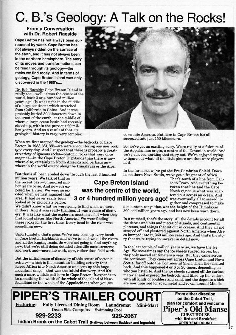 Published by Ronald Caplan on 1993/1/1 (285 reads)C. B.'s Geology: A Talk on the Rocks! From a Conversation with Dr. Robert Raeside Cape Breton has not always been sur? rounded by water. Cape Breton has not always ridden on the surface of the earth, and it has not always been In the northern hemisphere. The story of its moves and transformations can be read through Its geology • the rocks we find today. And in terms of geology, Cape Breton Island was only discovered in the 1980's.... Dr. Rob Raeside: Cape Breton Island is really the • well, it was the centre of the world, back 3 or 4 hundred million years ago! (It was) right in the middle of a huge continent which stretched from California to China. And it was probably buried 30 kilometers down in the crust of the earth, at the middle of where a large ocean basin had recently closed up, within the previous 20 mil? lion years. And as a result of that, its geological history is very, very complex. When we first mapped the geology • the bedrocks of Cape Breton in 1983, '84, '85 • 'we were encountering one new rock type every day. And I suspect that there is probably a great? er variety of igneous rocks • plutonic rocks that were once magmas • in the Cape Breton Highlands than there is any? where else, certainly in North America and perhaps any? where in the world except along the Himalayas or the Alps. down into America. But here in Cape Breton it's all squeezed into just 150 kilometers. So, we've got an exciting story. We're really at a fulcrum of the Appalachian origin, a centre of the Devonian world. And we've enjoyed working that story out. We've enjoyed trying to figure out what all the little pieces are that were players in it. But that's all been eroded down through the last 3 hundred million years. We talk of that as the recent past • 3 hundred mil? lion years or so. And now it's ex? posed for a view. We were so ex? cited when we first mapped that area. It had never really been looked at by geologists before. We didn't know what we were going to find when we went in there. And it was really thrilling. It was a sense of discov? ery. It was like what the explorers must have felt when they first found places like North America. We were finding these rocks for the first time. Every bend in the river was something new. Unfortimately, that's gone. We've now been up every brook in Cape Breton Highlands and we've been down all the rivers and all the logging roads. So we're not going to find anything new. But we're still doing detailed scientific measurements and work and • 'more lab work, now, rather than field work. But the initial sense of discovery of this centre of tectonic activity • 'which is the mountain-building activity that forced Africa into North America and sent up this huge mountain range • that was the initial discovery. And it's such a narrow little belt here in Cape Breton. It expands to be something the width of the whole of the island of New- foimdland or the whole of the Appalachians when you get In the far north we've got the Pre-Cambrian Shield. Down in southern Nova Scotia, we've got a fragment of Africa. That's south of a line from Can- so to Truro. And everything be? tween that line and the Cape North region is what was scat? tered out across an ocean. And 3 or 4 hundred million years ago! was eventually all squeezed to? gether and compressed to make a mountain range that was the height of the Himalayas 300-odd million years ago, and has now been worn down. Cape Breton Island was the centre of the world, In a nutshell, that's the story. All the details account for all the debris and bits and pieces of islands, and continental plateaus, and things that sit out in oceans. And they all got scraped off and plastered against North America when Afri? ca bumped into it, 360 million years ago. And that's the sto? ry that we're trying to unravel in detail now. In the last couple of million years or so, we have the Ice Age. We sometimes say the ice sheets surged across, but they only moved centimeters a year. But they came across the continent. They came out across Cape Breton and Nova Scotia, far off onto the Continental Shelf. Then they melted back. And this happened 4 or 6 or 20 times, depending on who you listen to. And the ice sheets scraped off the surface material and exposed the bedrock, and filled up the valleys with all kinds of boulders and sand, and the deposits which are now quarried for road metal and so on, around Middle PIPER'S TRAILER COURT Featuring: Fully Licensed Dining Room Laundromat Mini-Mart Ocean-Side Campsites Swimining Pool 929-2233 929-2067 Indian Brook on the Cabot Trail (Halfway between Baddeck and Ingonish) From either direction on the Cabot Trail, plan for comfort and welcome Piper's Old Manse GUEST HOUSE with Bed and Breakfast OPEN YEAR ROUND