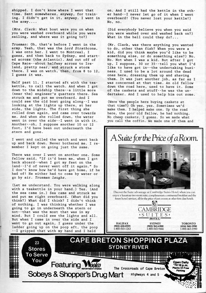 Published by Ronald Caplan on 1993/1/1 (245 reads)shipped. I don't know where I went that time. Sent somewheres, anyway, for train? ing. I didn't get in it, anyway. I went in the army.... on. And I still had the kettle in the oth? er hand--I never let go of it when I went overboard! (You never lost your kettle!) No, no. (.Mrs. Clark: What boat were you on when you were washed overboard while you were sailing, and where was it going to?) Truejnan: Oh, that's before I went in the army. Yeah, that was the Lord Strathcona. I was onto her. I went to Montreal, I guess, and then back to Sydney, and start? ed across (the Atlantic). And out off of Cape Race--about halfway across to Ire? land, pretty near, and struck a storm there. I was on watch, then, from 8 to 12, I guess it was. Half past 11, I started aft with the tea? kettle, to call the watch. And when I got down to the midship there--a little more (near the) engineer's quarters there. Sea struck me and put me overboard. And I could see the old boat going along--I was looking at the lights up there, at her side, the lights. The first thing she rolled down again, and came over towards me. And when she rolled down, the water went in over the side--I went in with it. Another--oh, I suppose another 10 or 12 foot, I'd have been out underneath the stern and gone. I went and called the watch and went back up and back down. Never bothered me. I re? member I kept on going just the same. There was over I went on another one. Some fellow said, "If it'd been me, when I got back aboard--when I got my feet on the land--I'd of never went off it again." So I don't know how he'd have got home, if he had of! He either had to come by water or go by air. Trueman laughs. (Let me understand. You were walking along with a teakettle in your hand.) Yes. (And the sea came in.) Sea came and struck me and put me right overboard. (What did you think?) What did I think? I didn't think of nothing. I was thinking whether I was going to go in underneath the stern or not--that was the most that was in my mind. But I could see the lights and all. But when I came in over the side and I went to go out again, I guess under the ladder going up on the poop aft, the poop --I gripped that with my hand and I held (Did everybody believe you when you said you were washed over and washed back on?) What in the hell could they do?... (Mr. Clark, was there anything you wanted to do, other than fish? When you were a kid, did you think maybe you'd like to be something else, or do something else?) No. No. Not when I was a kid. But after I got up, I suppose, 30 or 35--tell you what I'd like to have got in--the undertaking busi? ness. I used to be a lot around the dead ones here, dressing them up and shaving them. It was just another job, as far as I was concerned at that time. An old fellow down the road here, used to have it. Some of the caskets and stuff--he was the un? dertaker. And I used to help him out some. (Were the people here buying caskets at that time?) Oh yes, yes. Sometimes we'd make them. I helped make one. Up the road here, the poor old fellow, he had nothing. No cheap caskets, I guess. So we made what you call the coffin. We made one of them and ASmtefor'PriceqfaRoom. Discover the Suite advantage at Cambridge Suites Hotel, where you can enjoy a luxurious twcvrcxmi suite, complimentary continental hre;ikfast and the finest hotel services, all for the price of just a rcxim at other first class hotels. CAMBRIDGE SUITES' HALIFAX (902) 420-0555 1-800-565-1263 = [HOfEL] = SYDNEY (902) 562-6500 1-800-565-9466 TORONTO (416) 368-1990 1-800-463-1990 Stores To Serve You CAPE BRETON SHOPPING PLAZA SYDNEY RIVER mH' Featuring AW?? MPANTMtNT STOMf • The Crossroads of Cape Breton' Sobeys & Shopper's Drug Mart "'''w''' *??"?= open "nllOp.m' tonty OI Fn Parkins