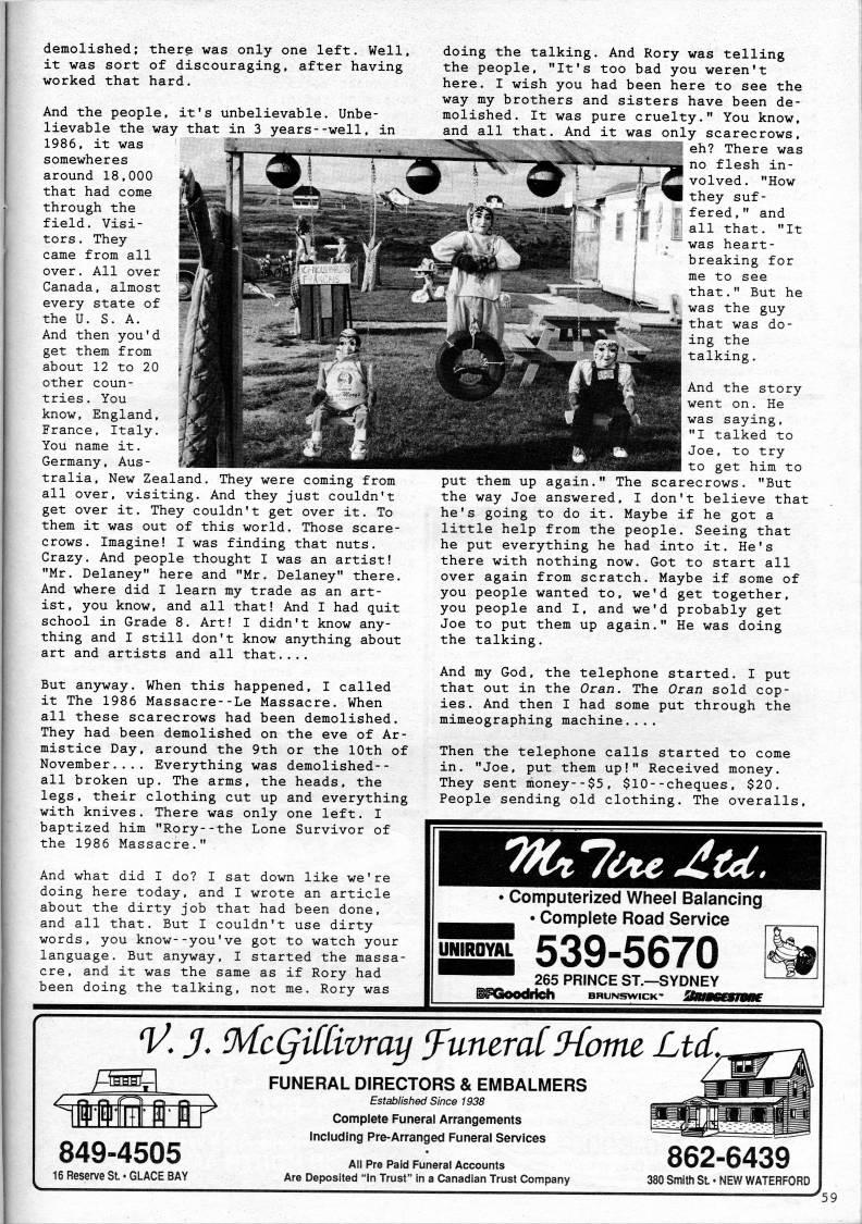 Published by Ronald Caplan on 1993/1/1 (175 reads)demolished; there was only one left. Well, it was sort of discouraging, after having worked that hard. And the people, it's unbelievable. Unbe? lievable the way that in 3 years--well, in 1986, it was somewheres around 18,000 that had come through the field. Visi? tors. They came from all over. All over Canada, almost every state of the U. S. A. And then you'd get them from about 12 to 20 other coun? tries. You know. England, France. Italy. You name it. Germany, Aus? tralia, New Zealand. They were coming from all over, visiting. And they just couldn't get over it. They couldn't get over it. To them it was out of this world. Those scare? crows. Imagine! I was finding that nuts. Crazy. And people thought I was an artist! "Mr. Delaney" here and "Mr. Delaney" there. And where did I learn my trade as an art? ist, you know, and all that! And I had quit school in Grade 8. Art! I didn't know any? thing and I still don't know anything about art and artists and all that.... But anyway. When this happened, I called it The 1986 Massacre--Le Massacre. When all these scarecrows had been demolished. They had been demolished on the eve of Ar? mistice Day, around the 9th or the 10th of November.... Everything was demolished-- all broken up. The arms, the heads, the legs, their clothing cut up and everything with knives. There was only one left. I baptized him "Rory--the Lone Survivor of the 1986 Massacre." And what did I do? I sat down like we're doing here today, and I wrote an article about the dirty job that had been done, and all that. But I couldn't use dirty words, you know--you've got to watch your language. But anyway, I started the massa? cre, and it was the same as if Rory had been doing the talking, not me. Rory was doing the talking. And Rory was telling the people, "It's too bad you weren't here. I wish you had been here to see the way my brothers and sisters have been de? molished. It was pure cruelty." You know, and all that. And it was only scarecrows, """'''Li'... '''>'- ?? " ' , eh? There was • ?miiiifii'''I'.'Mmm'gg''''i,t,,i,g,' .,,' j'o flesh iU" ??.'Z volved. "How 'B they suf? fered," and ' all that. "It . ??' was heart? breaking for me to see that." But he I was the guy that was do? ing the talking. And the story went on. He was saying, "I talked to Joe, to try to get him to put them up again." The scarecrows. "But the way Joe answered, I don't believe that he's going to do it. Maybe if he got a little help from the people. Seeing that he put everything he had into it. He's there with nothing now. Got to start all over again from scratch. Maybe if some of you people wanted to, we'd get together, you people and I, and we'd probably get Joe to put them up again." He was doing the talking. And my God, the telephone started. I put that out in the Oran. The Oran sold cop? ies. And then I had some put through the mimeographing machine.... Then the telephone calls started to come in. "Joe, put them up!" Received money. They sent money--$5, $10--cheques, $20. People sending old clothing. The overalls. TfCilixc Jttd. ' Computerized Wheel Balancing • Complete Road Service 539-5670 265 PRINCE ST. • SYDNEY IFGOOCfateh BRUNSWICK- 849-4505 16 Reserve St.-GLACE BAY V. J7. McQiCCivray J'uneraC!Home Ltd' FUNERAL DIRECTORS & EMBALMERS Established Since 1938 Complete Funeral Arrangements Including Pre-Arranged Funeral Services All Pre Paid Funeral Accounts Are Deposited "In Trust" in a Canadian Trust Company 862-6439 380 Smith St • NEW WATERFORD