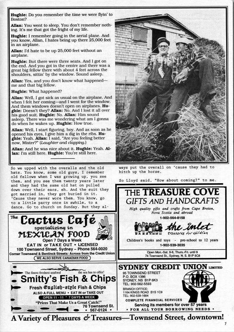 Hughie: Do you remember the time we were flyin' to Boston? Allan: You went to sleep. You don't remember noth? ing. It's me that got the fright of my life. Hughie: I remember going in the aerial plane. And you know, Allan, I hates being up there 25,000 feet in an airplane. Allan: I'd hate to be up 25,000 feet without an airplane. Hughie: But there were three seats. And I got on the end. And you got in the centre and there was a great big fellow there with about 4 feet across the shoulders, sittin' by the window. Sound asleep. Allan: Yes, and you don't know what happened • me and that big fellow. Hughie: What happened? Allan: Well, I got sick as usual on the airplane. And when I felt her coming • and I went for the window. And them windows doesn't open on airplanes. Hu? ghie: Doesn't they? Allan: No. And I lost it all over his good suit. Hughie: No. Allan: Him sound asleep. There was me wondering what am I gonna do when he wakes up. Hughie: How true. Allan: Well, I start figuring, boy. And as soon as he opened his eyes, I give him a dig in the ribs. Hu? ghie: Yeah. Allan: I said, "Are you feeling better now, Mister?" [Laughter and clapping.) Allan: And he was nice about it. Hughie: Yeah. Al? lan: I'm still here. Hughie: You're still here. ':0&i;%.. ?,';%:1 :,'''!' So we upped with the overalls and the old hats. You know, some old guys, I remember old fellows when I was growing up, you see them, and you see them twenty years later and they had the same old hat on pulled down over their ears, eh. And the suit they got married in, they got buried in it. 'Cause they never wore them. You know, go to a little party once in awhile, to a dance. Go to church on Sunday. But they al? ways put the overall on 'cause they had to hitch up the horse. So Lloyd said, "How about coming?" to me. ' Cactus 2aH specializing in nEXXCs'N FOOD Open 7 Days a Week EAT IN or TAKE OUT • LICENSED 100 Townsend Street, Sydney ~ Phone 564-0020 Corner Townsend & Bentinck Streets: Across from the Credit Union| ( WE ALSO SERVE CANADIAN FOOD' THE TREASURE COVE GIFTS AND HANDCRAFTS High quality gifts and crafts from Cape Breton, Nova Scotia and abroad 1-902-564-8158 Children's books and toys - pre-school to 12 years 1-902-539-3035 Open Mon.-Sat. 9-6, Thurs.-Fri. until 9 74Townsend St., Sydney. N.S. B1P5C8 ?? The finest freshest seafood *??$&.. • ?***->-, the sea has to offer! i Smitty's Fish & Chips lIlP Fresh <2fttaU?8-0tl?k Fish & Chips ALSO A FULL MENU • EAT IN or TAKE OUT "Prices That Make Us a Great Catch!" '_ • ' J 76Townsend St. * '' '"""l ? * 567-0124 • SYDNEY CREDIT UNION limi • 95 TOWNSEND STREET P.O. BOX 1386 SYDNEY, NS Bi P 6K3 TEL: 902-562-5593 BRANCH OFFICE: 1164 KINGS ROAD B1S1C9 TEL: 902-539-1684 COMPLETE FINANCIAL SERVICES Serving its members for over STyears • FOR ALL YOUR BORROWING NEEDS A Variety of Pleasures d" Treasures • 'Townsend Street, downtown!