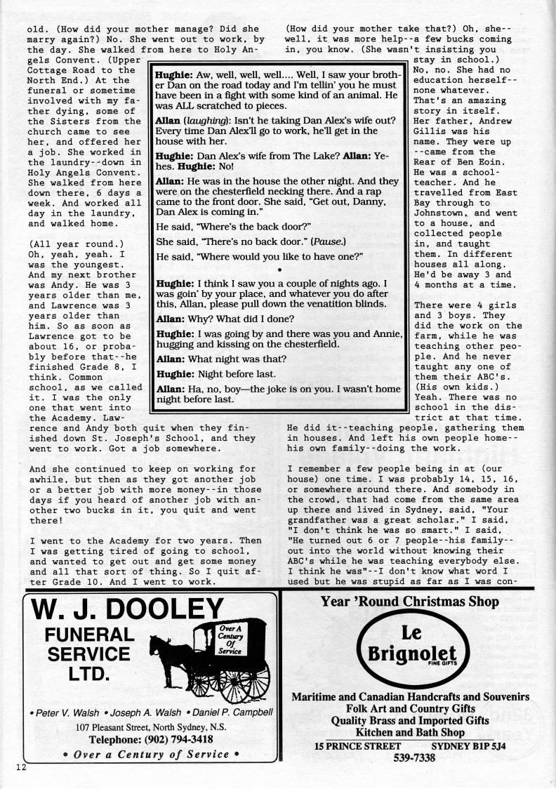 old. (How did your mother manage? Did she marry again?) No. She went out to work, by the day. She walked from here to Holy An? gels Convent. (Upper Cottage Road to the North End.) At the funeral or sometime involved with my fa? ther dying, some of the Sisters from the church came to see her, and offered her a job. She worked in the laundry--down in Holy Angels Convent. She walked from here down there, 6 days a week. And worked all day in the laundry, and walked home. (All year round.) Oh, yeah, yeah. I was the youngest. And my next brother was Andy. He was 3 years older than me, and Lawrence was 3 years older than him. So as soon as Lawrence got to be about 16, or proba? bly before that--he finished Grade 8, I think. Common school, as we called it. I was the only one that went into the Academy. Law? rence and Andy both quit when they fin? ished down St. Joseph's School, and they went to work. Got a job somewhere. And she continued to keep on working for awhile, but then as they got another job or a better job with more money--in those days if you heard of another job with an? other two bucks in it, you quit and went there! I went to the Academy for two years. Then I was getting tired of going to school, and wanted to get out and get some money and all that sort of thing. So I quit af? ter Grade 10. And I went to work. Hughie: Aw, well, well, weU.... WeU, I saw your broth? er Dan on the road today and I'm tellin' you he must have been in a fight with some kind of an animal. He was ALL scratched to pieces. Allan ilaughtng): Isn't he taking Dan Alex's wife out? Every time Dan Alex'll go to work, he'll get in the house with her. Hughie: Dan Alex's wife from The Lake? Allan: Ye- hes. Hughie: No! Allan: He was in the house the other night. And they were on the chesterfield necking there. And a rap came to the front door. She said, "Get out, Danny, Dan Alex is coming in." He said, "Where's the back door?" She said, "There's no back door." [Pause.) He said, "Where would you like to have one?" Hughie: I think 1 saw you a couple of nights ago. I was goin' by your place, and whatever you do after this, Allan, please pull down the venatition blinds. (How did your mother take that?) Oh, she-- well, it was more help--a few bucks coming in, you know. (She wasn't insisting you stay in school.) No, no. She had no education herself-- none whatever. That's an amazing story in itself. Her father, Andrew Gillis was his name. They were up --came from the Rear of Ben Eoin. He was a school? teacher. And he travelled from East Bay through to Johnstown, and went to a house, and collected people in, and taught them. In different houses all along. He'd be away 3 and 4 months at a time. Allan: Why? What did I done? Hughie: I was going by and there was you and Annie, hugging and kissing on the chesterfield. Allan: What night was that? Hughie: Night before last. Allan: Ha, no, boy • 'the joke is on you. I wasn't home night before last. There were 4 girls and 3 boys. They did the work on the farm, while he was teaching other peo? ple. And he never taught any one of them their ABC's. (His own kids.) Yeah. There was no school in the dis? trict at that time, teaching people, gathering them And left his own people home-- He did it in houses his own family--doing the work. I remember a few people being in at (our house) one time. I was probably 14, 15, 16, or somewhere around there. And somebody in the crowd, that had come from the same area up there and lived in Sydney, said, "Your grandfather was a great scholar." I said, "I don't think he was so smart." I said, "He turned out 6 or 7 people--his family-- out into the world without knowing their ABC's while he was teaching everybody else. I think he was"--I don't know what word I used but he was stupid as far as I was con- W. J. DOOLEY FUNERAL SERVICE LTD. • Peter V. Walsh • Joseph A. Walsh • Daniel P. Campbell 107 Pleasant Street, North Sydney, N.S. Telephone: (902) 794-3418 • Over a Century of Service • Year 'Round Christmas Shop Le /Brignolet L ' FINE QIFTS , Maritime and Canadian Handcrafts and Souvenirs Folk Art and Country Gifts Quality Brass and Imported Gifts Kitchen and Bath Shop 15 PRINCE STREET SYDNEY BIP 5J4 539-7338